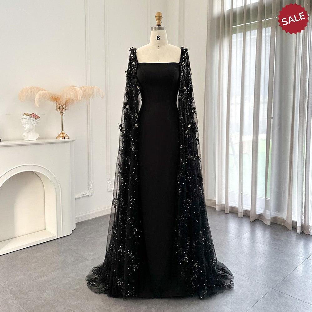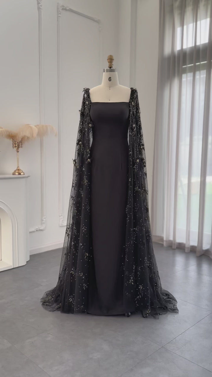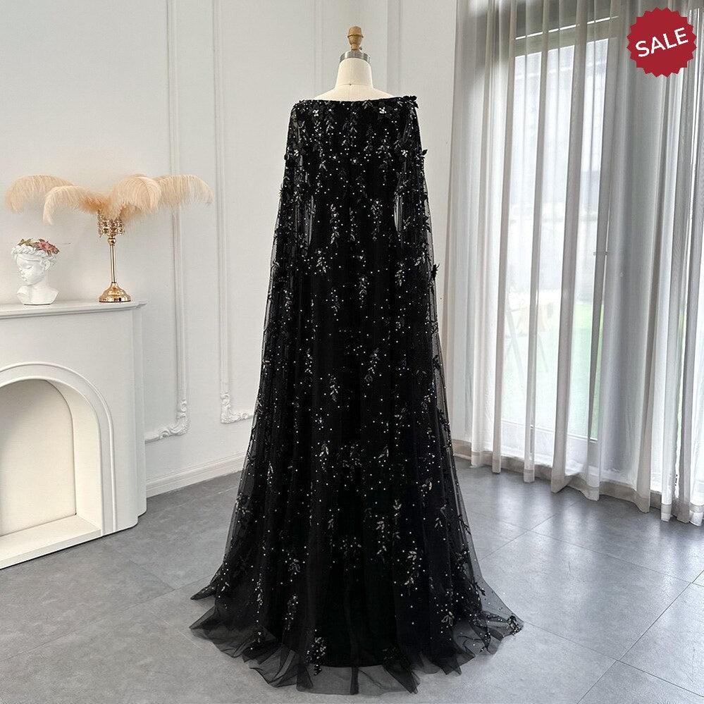 Luxury 3D Flowers Black Satin Arabic Evening Dress with Cape SS479
