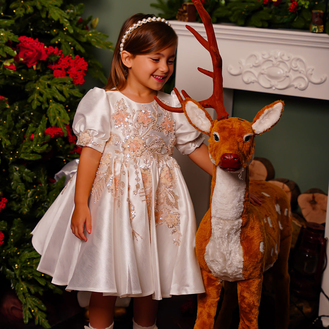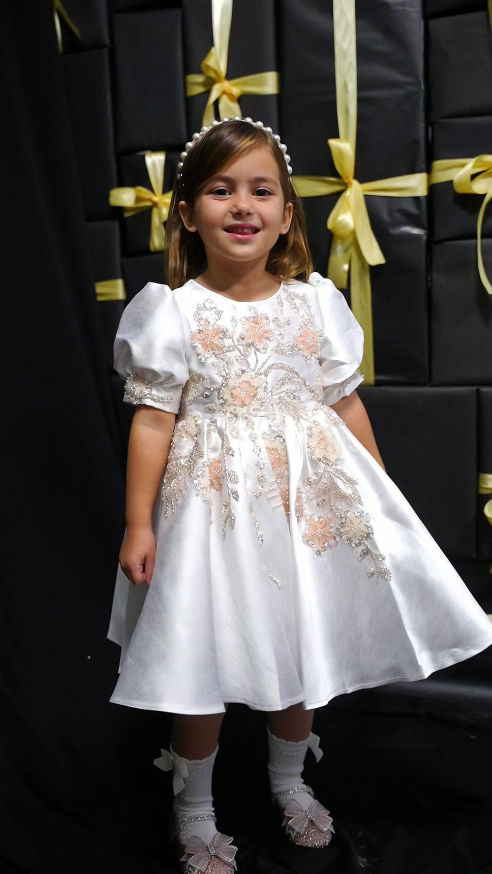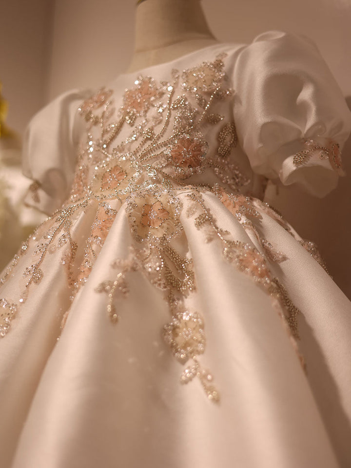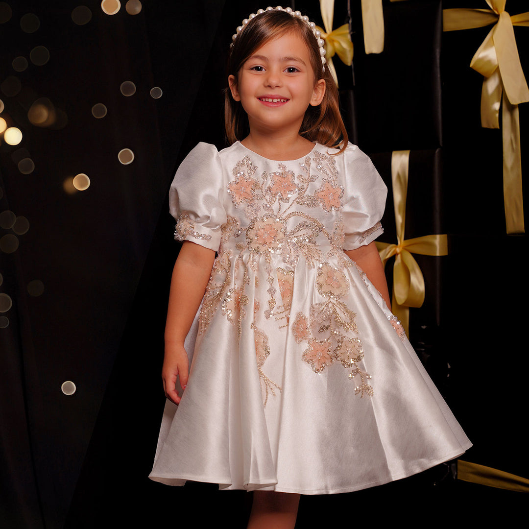 Indulge your little one in pure luxury with the Dreamy Vow Flower Girl Dress. The off-white gown is adorned with exquisite beading and sequins, fit for a princess. Perfect for weddings, birthday parties, or pageants, she'll captivate all with her grand entrance. Make her dreams come true with this stunning dress.