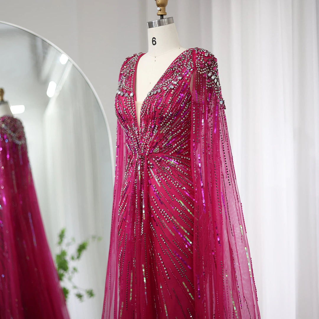 Experience luxury and elegance in the Dreamy Vow Dubai Sage Green Evening Dress with Cape. This stunning gown features a fuchsia crystal and gold design, perfect for formal events or weddings. The cape adds an extra touch of glamour, making you stand out from the crowd. Get ready to turn heads and make a statement in this must-have dress.