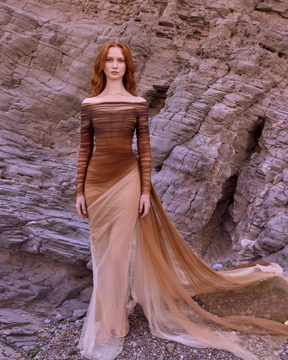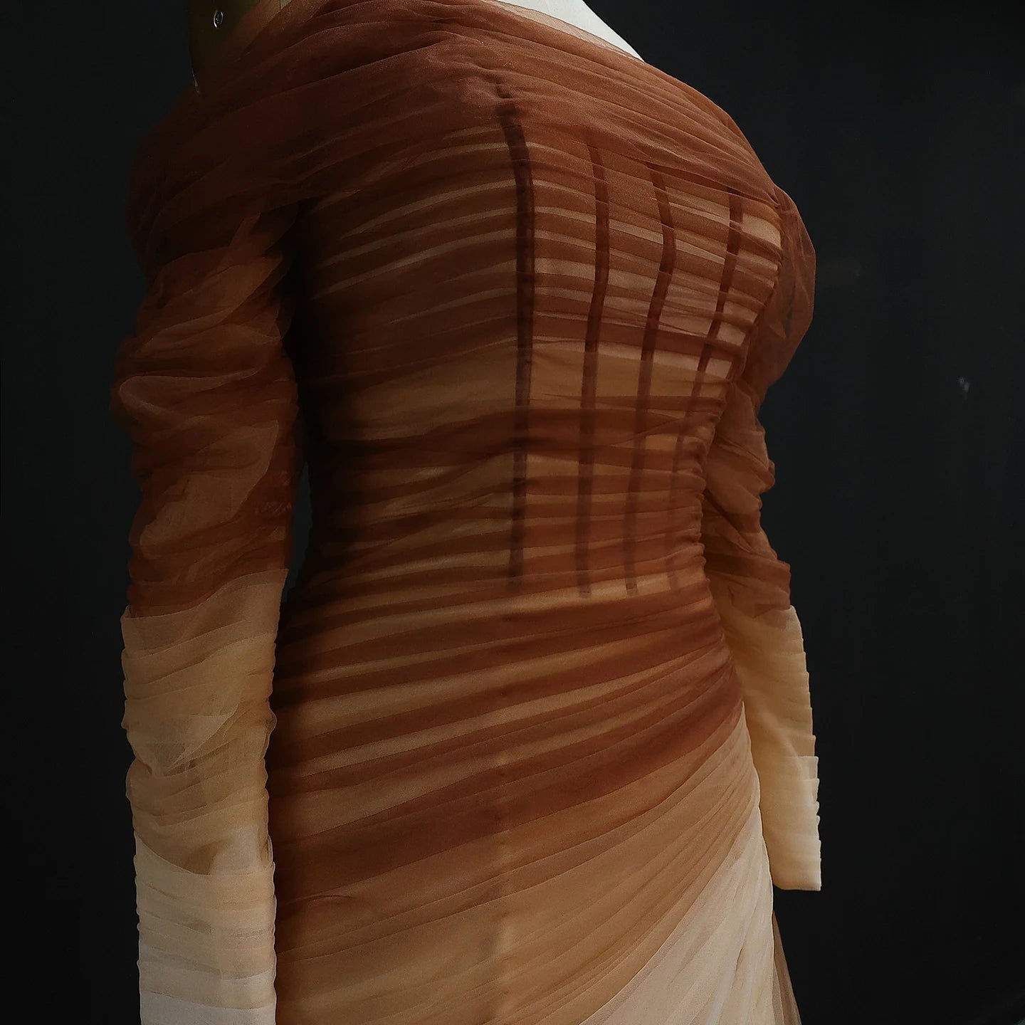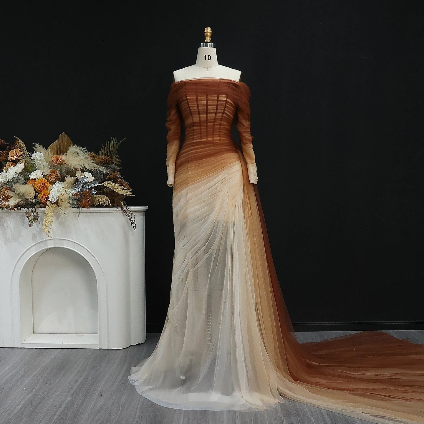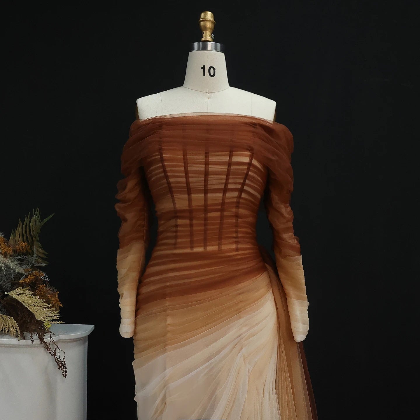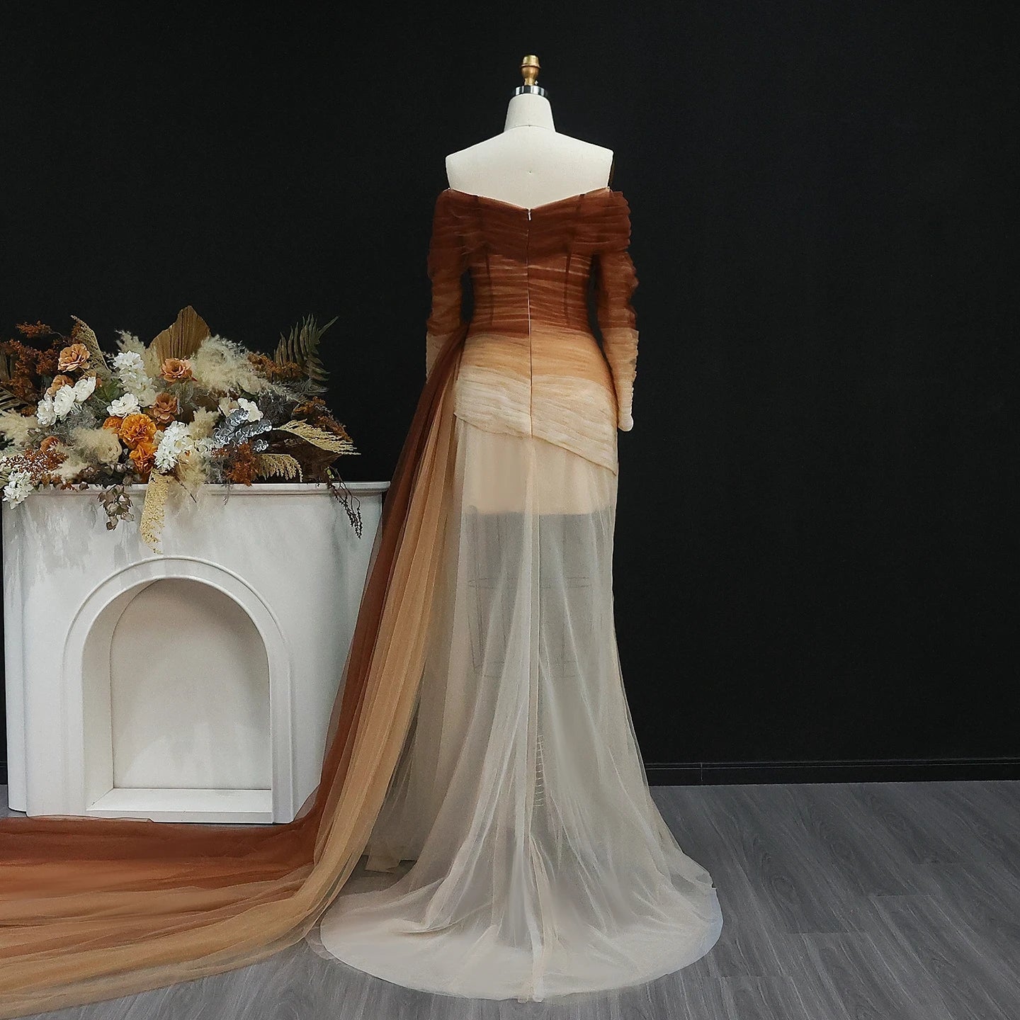 This elegant brown tulle off shoulder evening dress features a subtle yet eye-catching slit. The unique design and quality fabric make it a perfect choice for formal occasions. Its flattering silhouette showcases your figure while exuding sophistication. Elevate your style with this stunning dress.