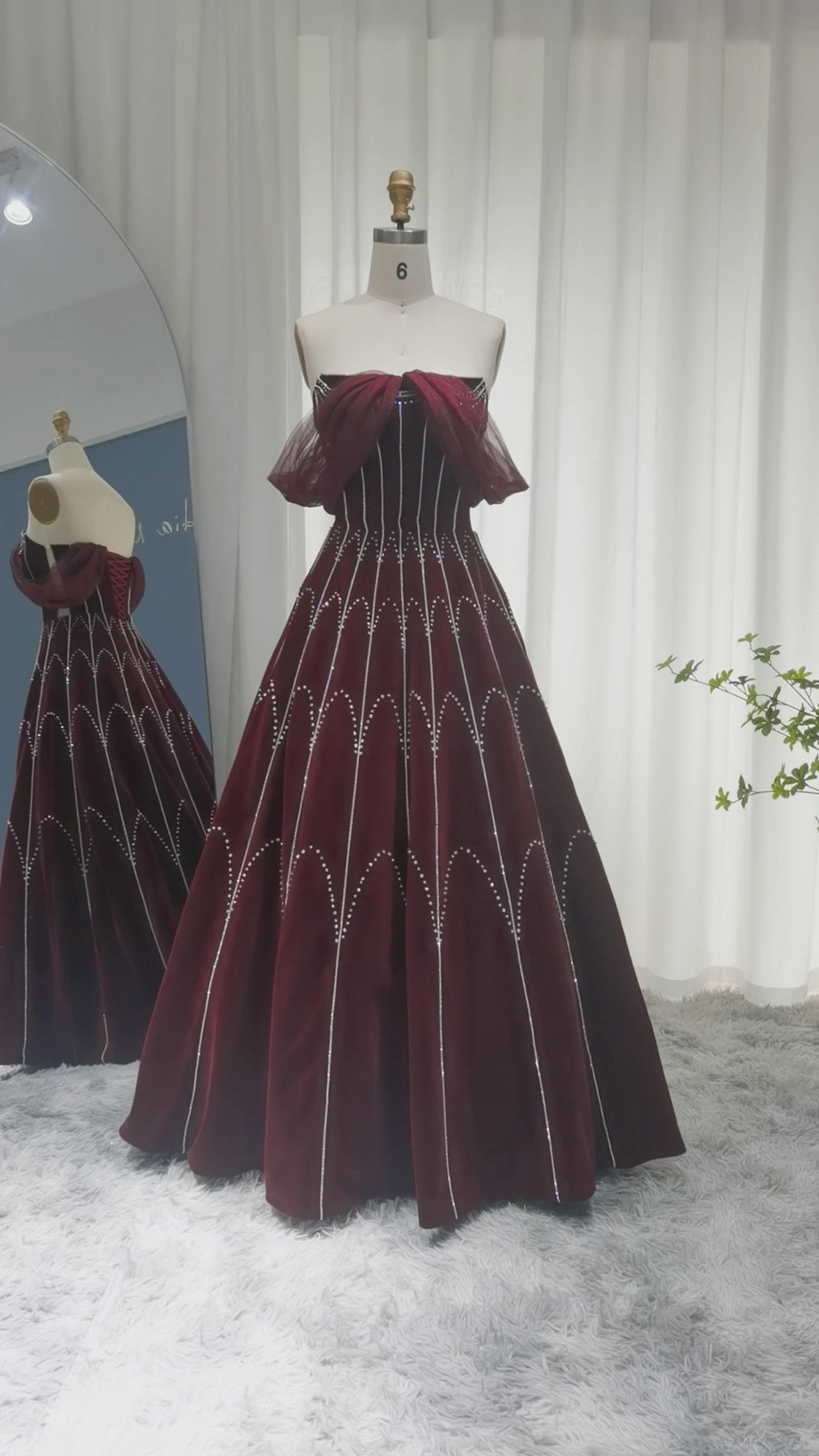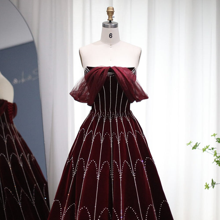 Burgundy Velvet Ball Gown Evening Dress Luxury Crystal Party Gowns SS274