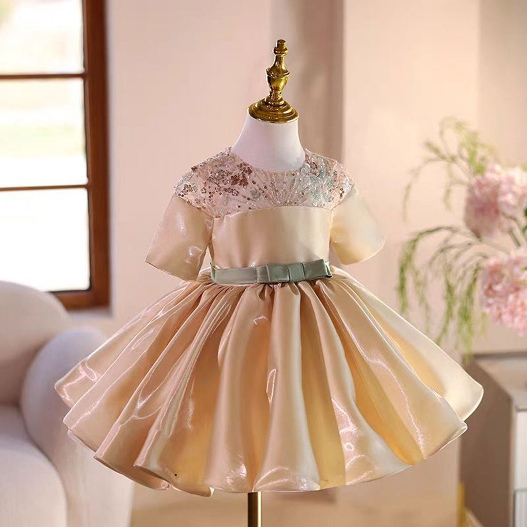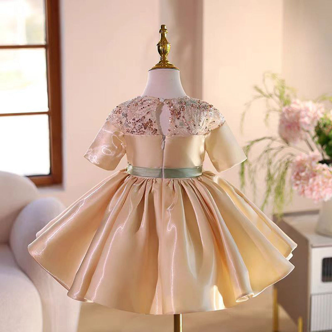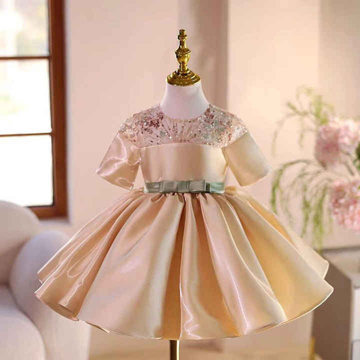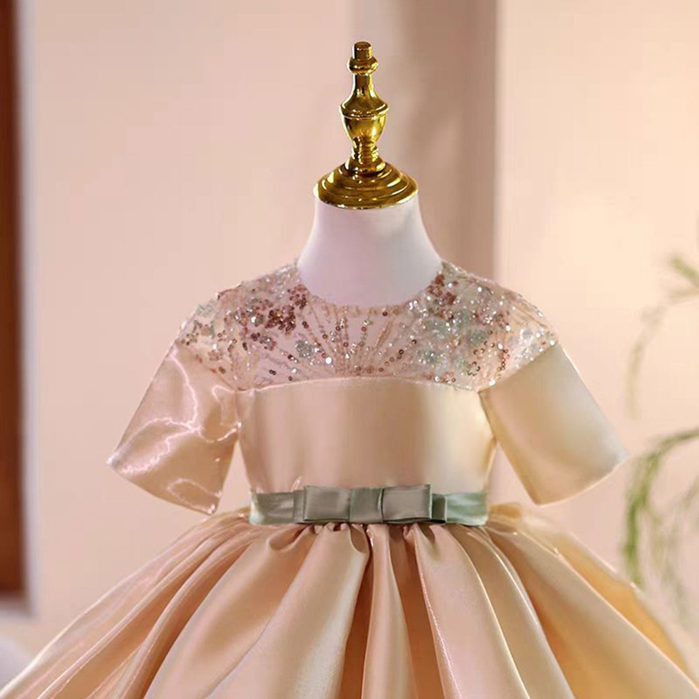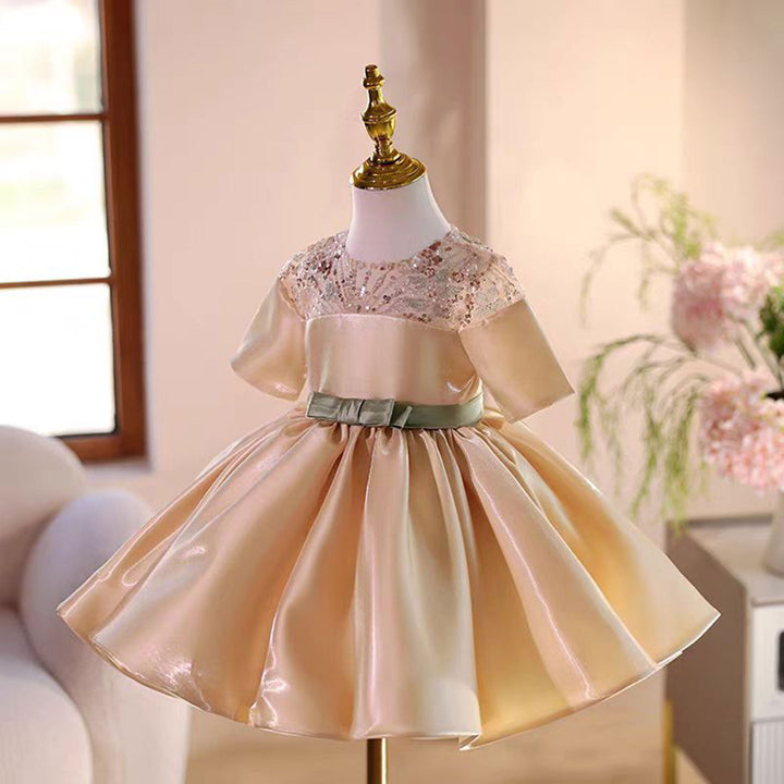Elegant Applique Satin Flower Girl Dress With Bow Short Sleeve J503