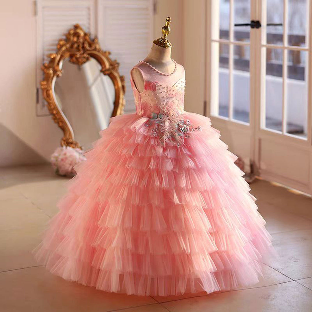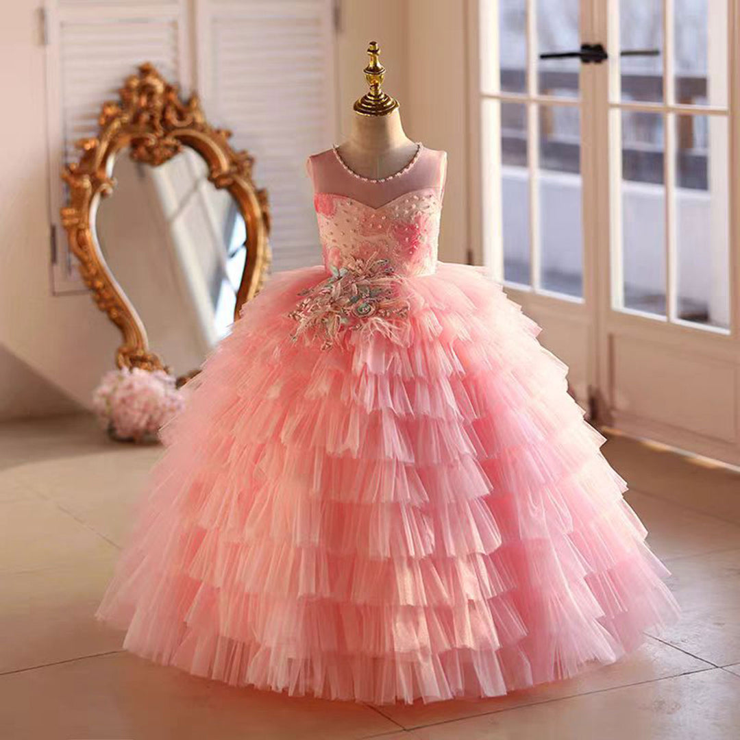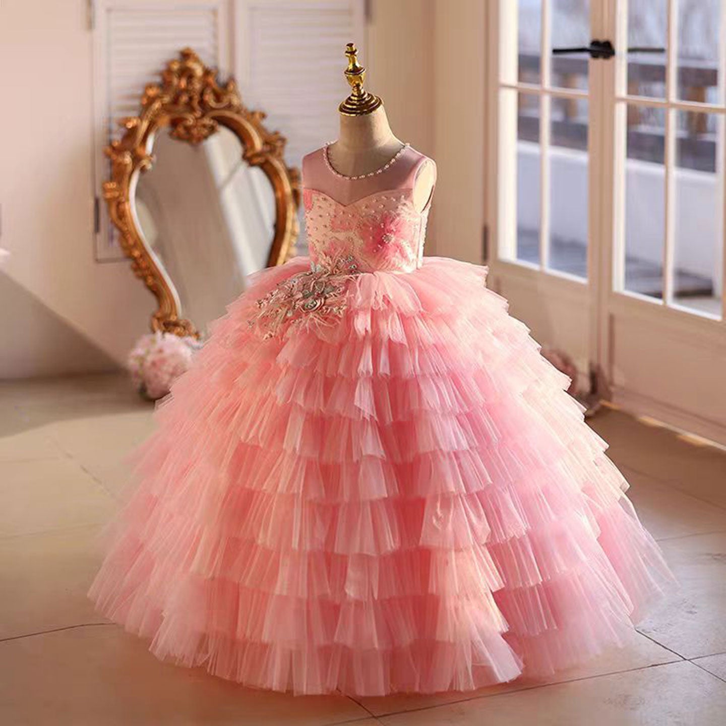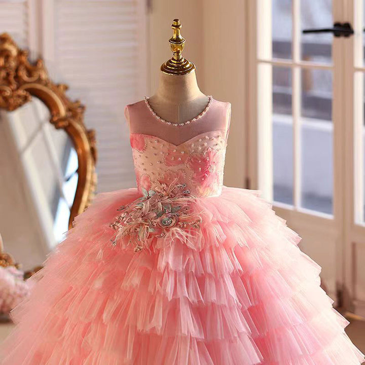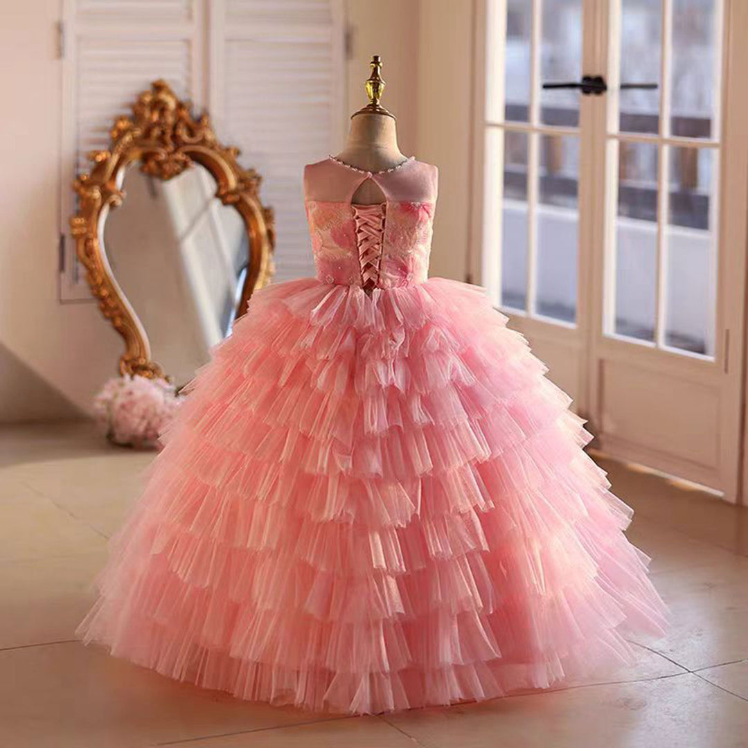 Pink Flower Princess Girl Dress Birthday Party Gown J787