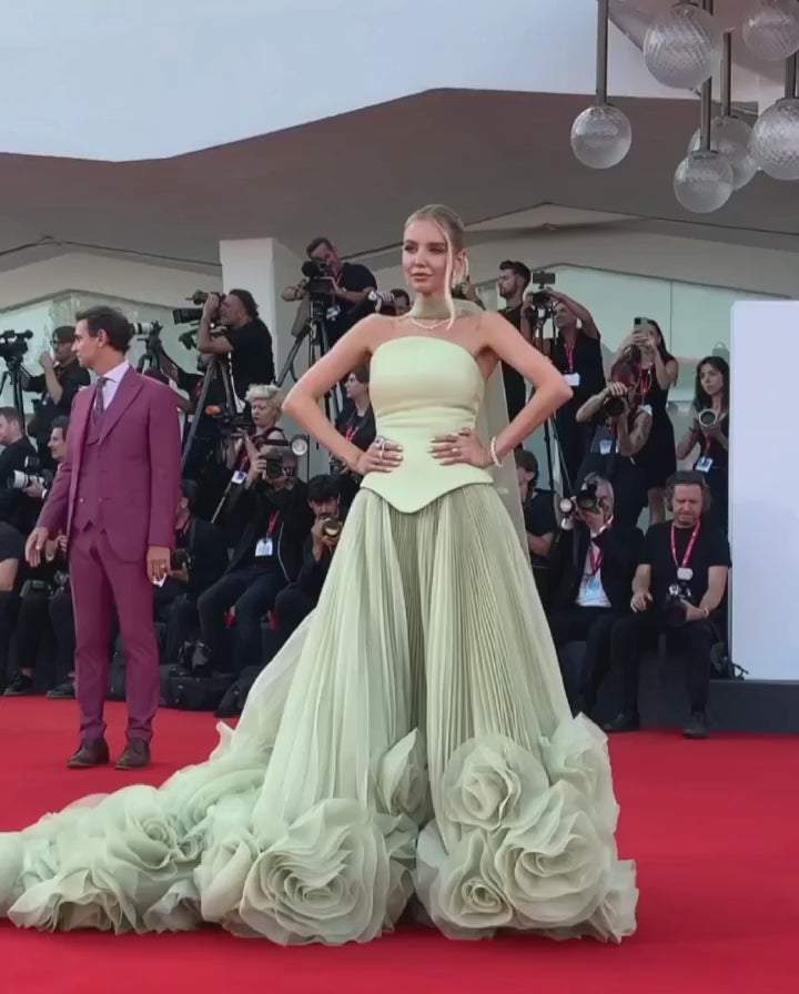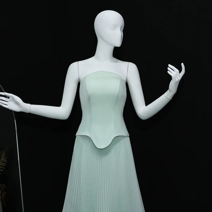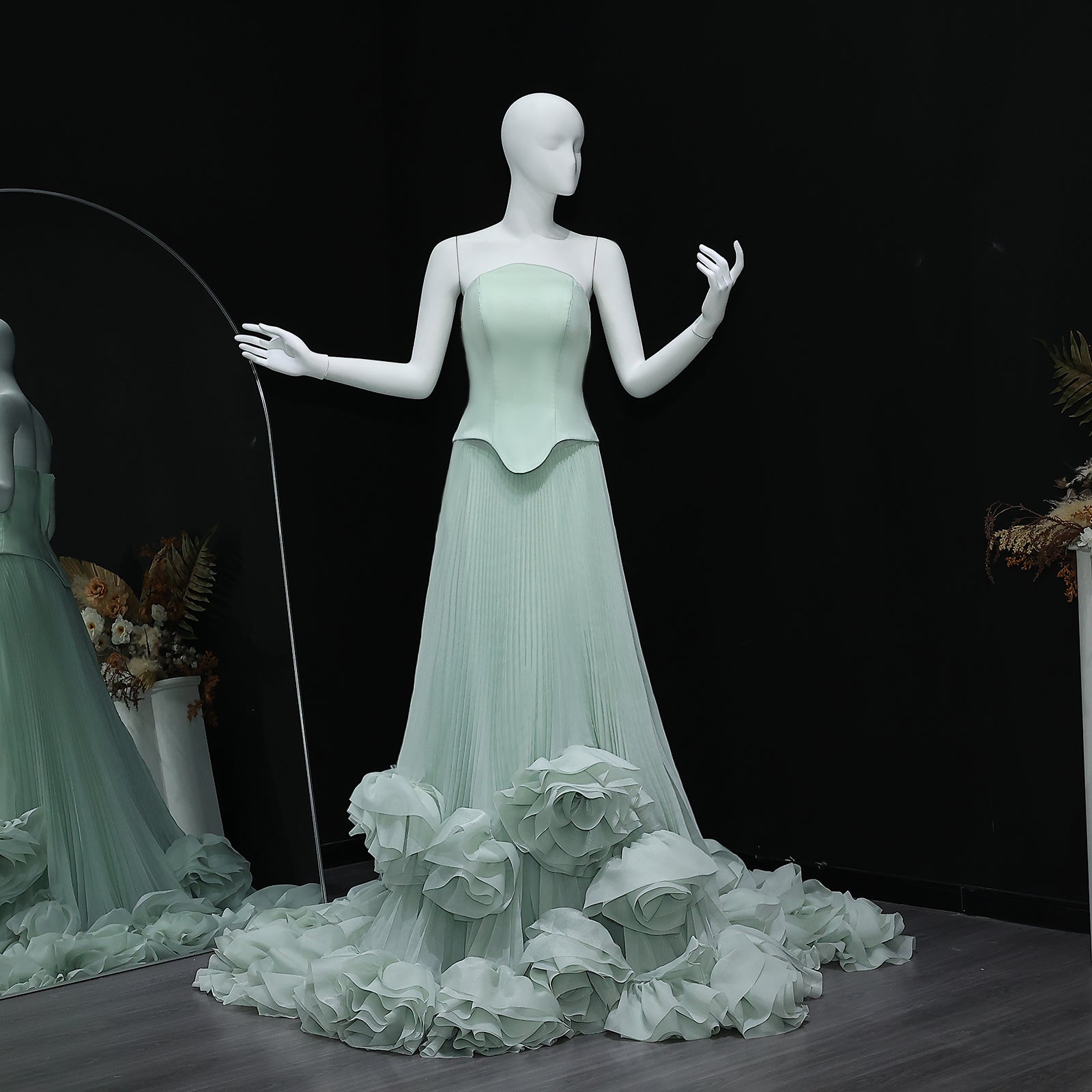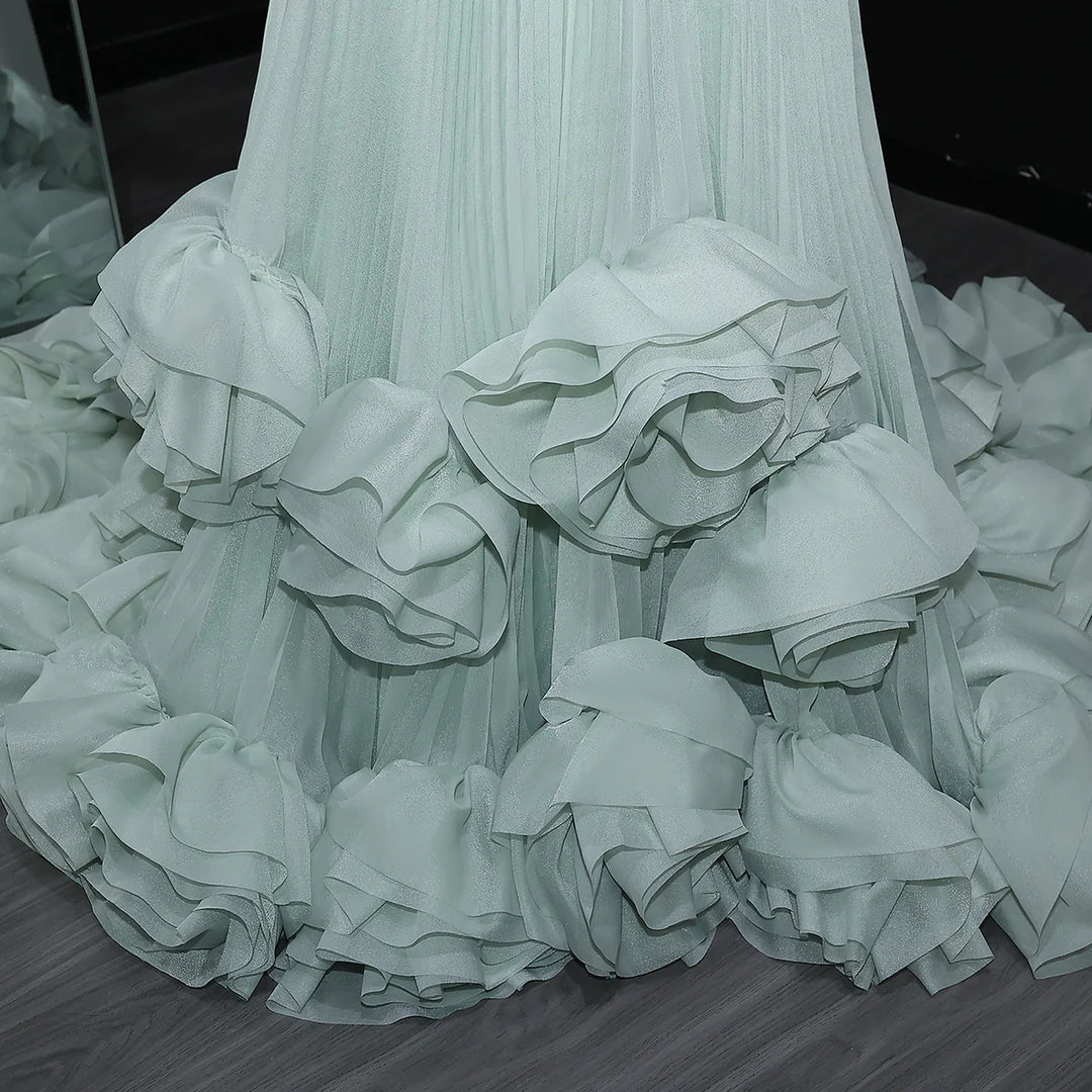 As an industry expert, I present to you the Elegant Green Strapless 3D Flowers Evening Dress SS230. This stunning dress features an elegant green color, a flattering strapless design, and intricate 3D flowers for a dreamy look. Perfect for any evening event, this dress will make you stand out in a crowd.