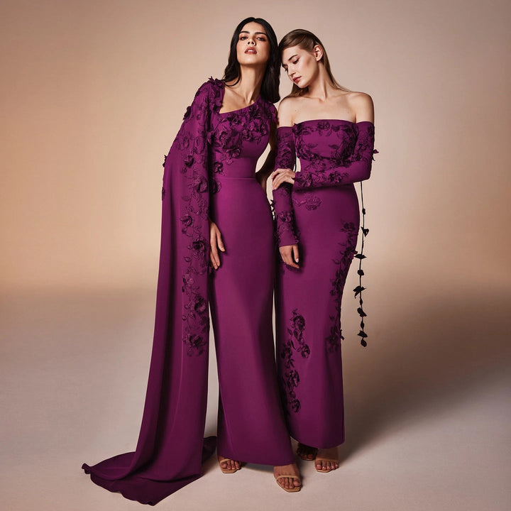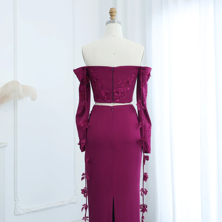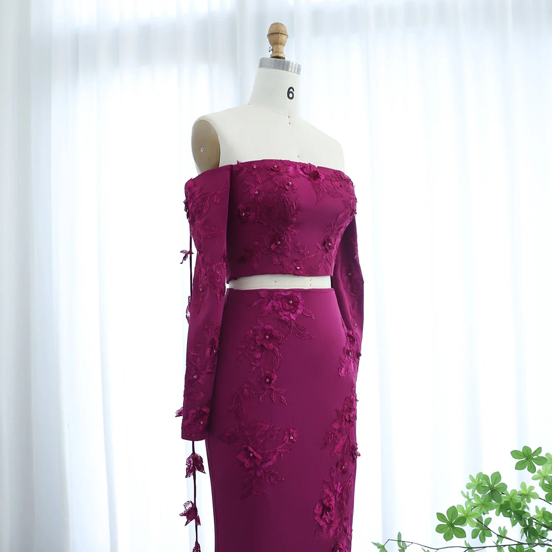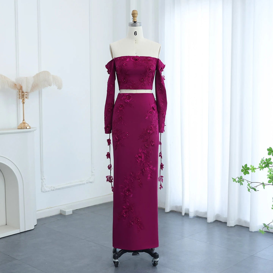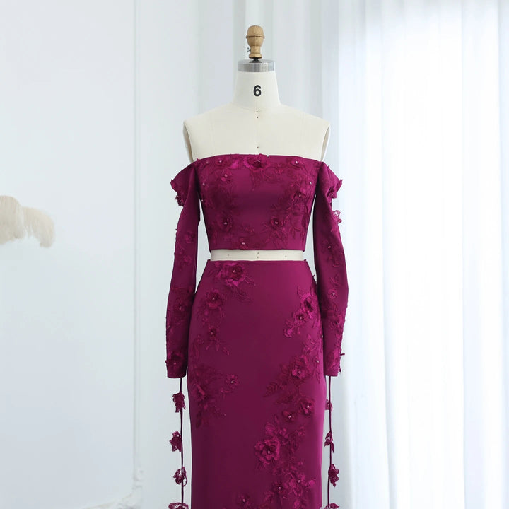 Elegant Off Shoulder Fuchsia 2 Pieces Evening Dress with Long Sleeves SS310