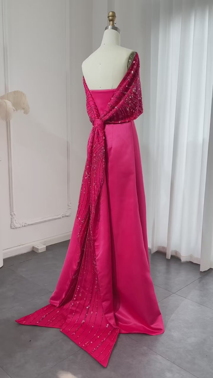 Elegant Off Shoulder Fuchsia Arabic Evening Dress with Cape SS482