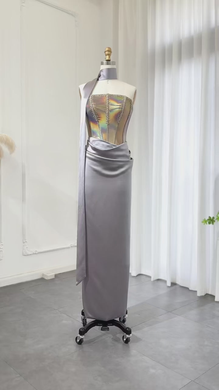 Elegant Strapless Gray Satin Evening Dress with Scarf Crystal SS704