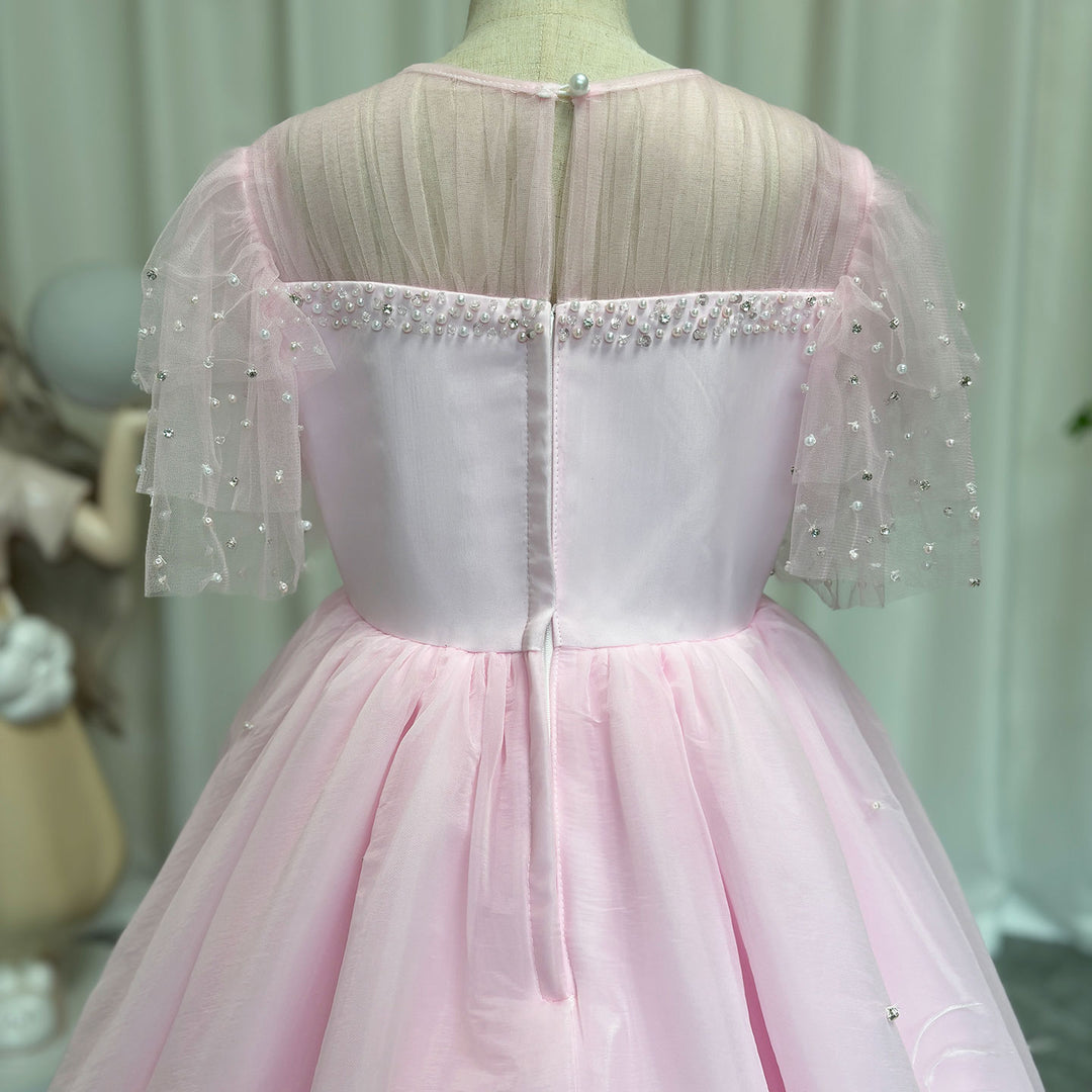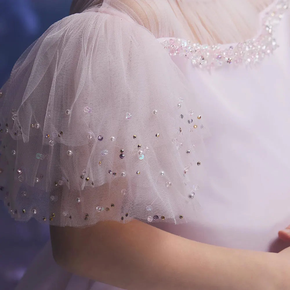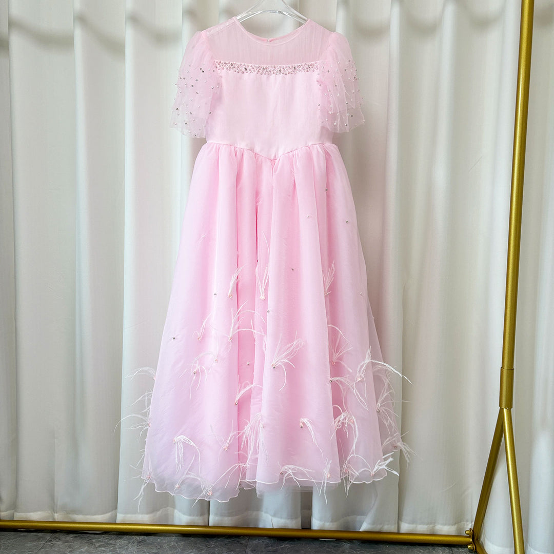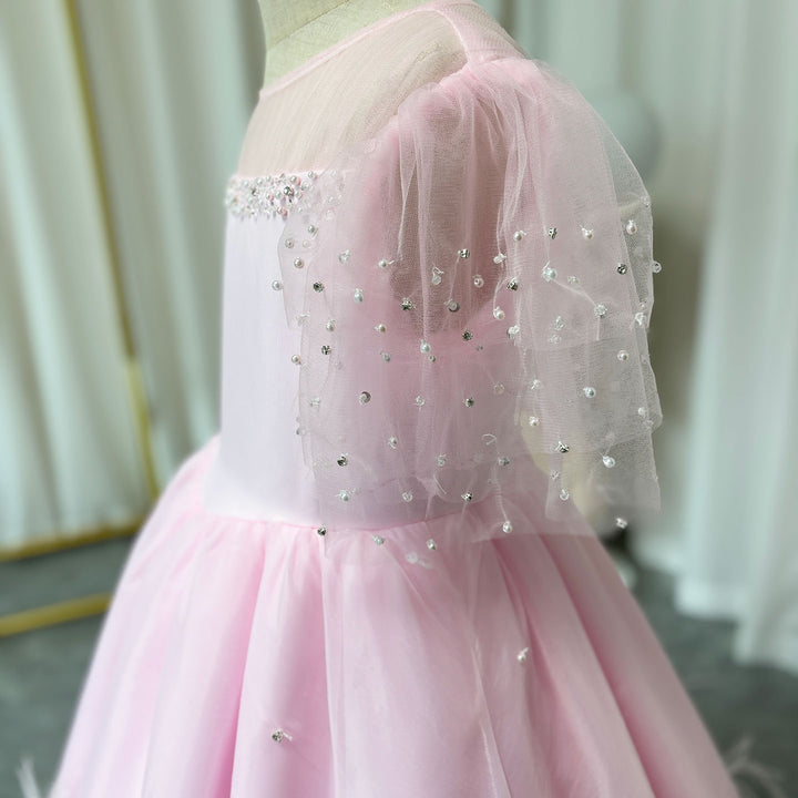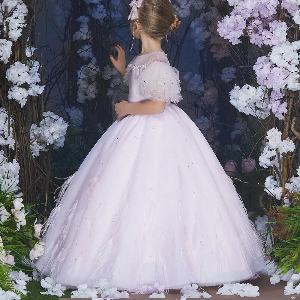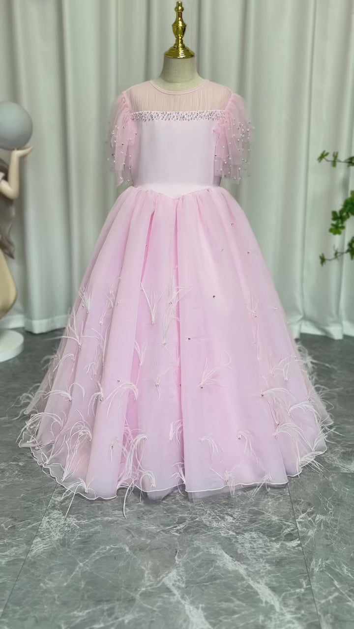 Luxury Blush Pink Girl Dress Feathers Beaded Princess J391