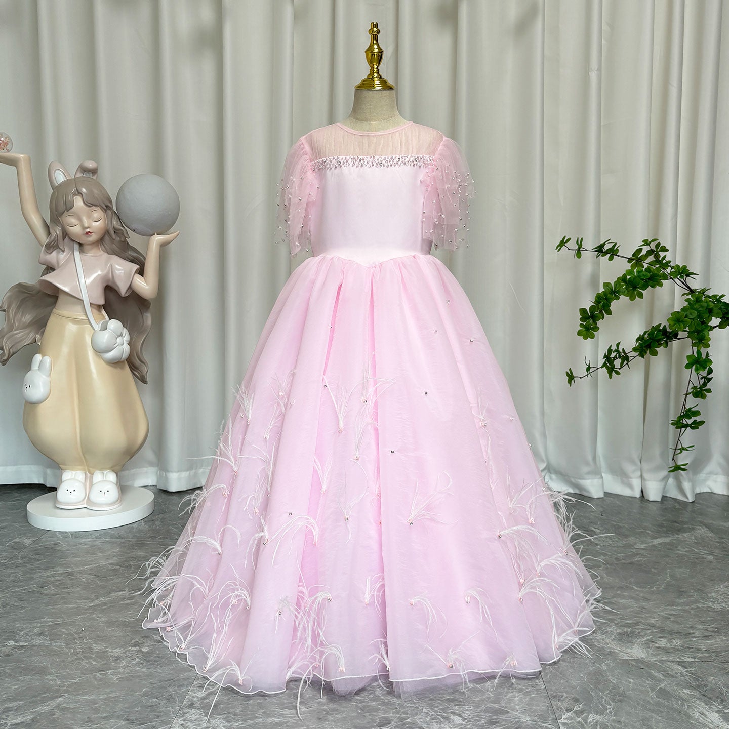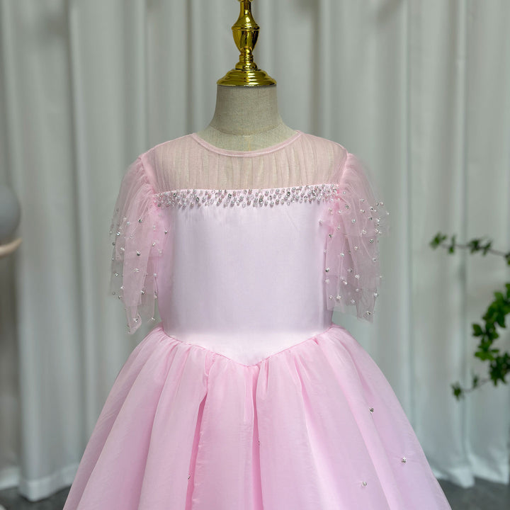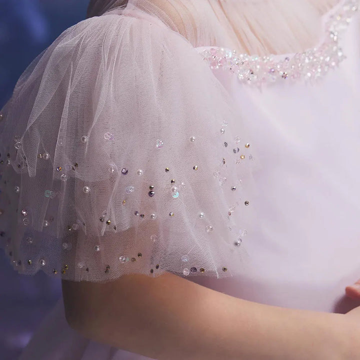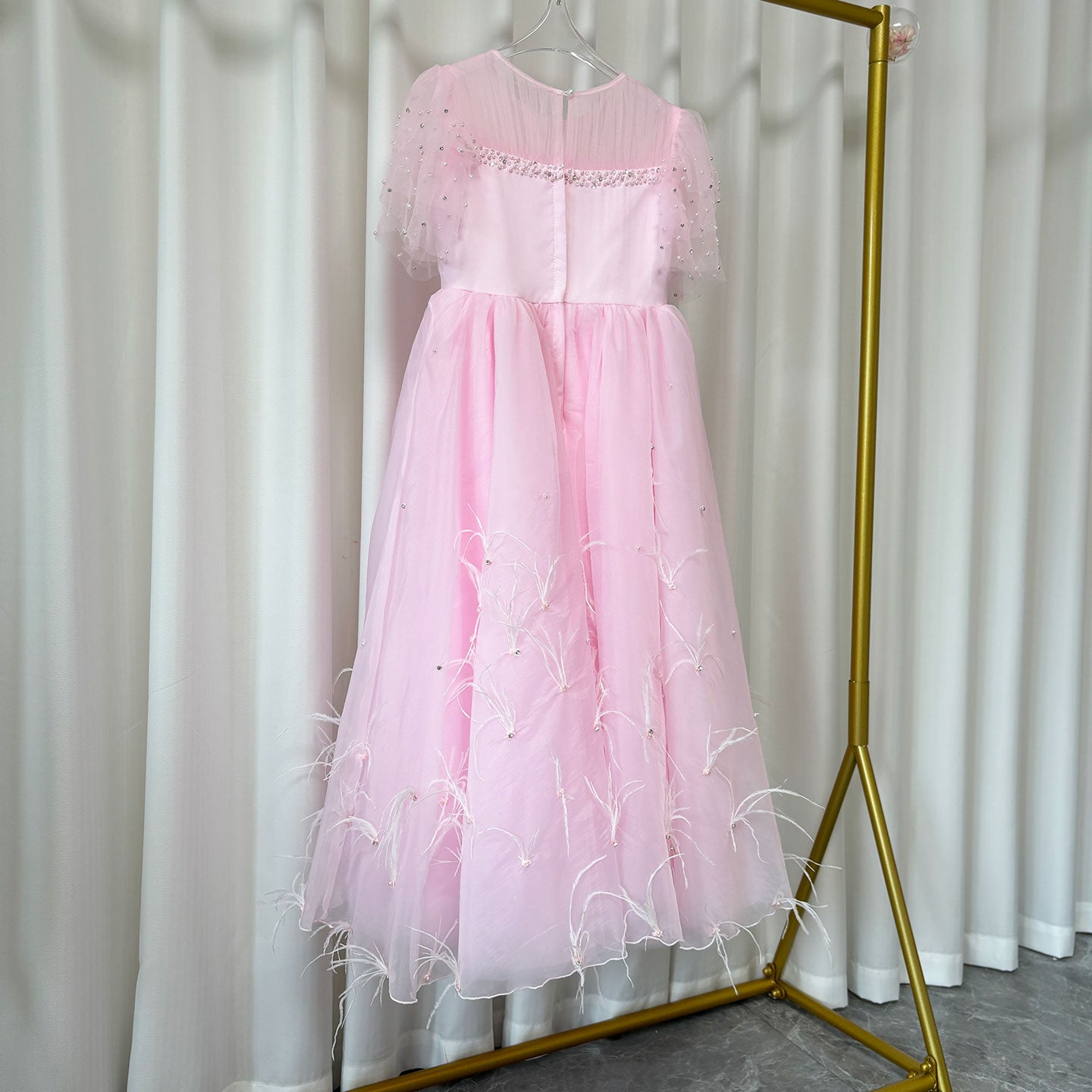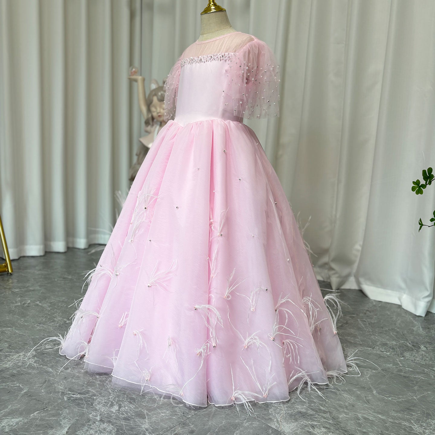 Luxury Blush Pink Girl Dress Feathers Beaded Princess J391