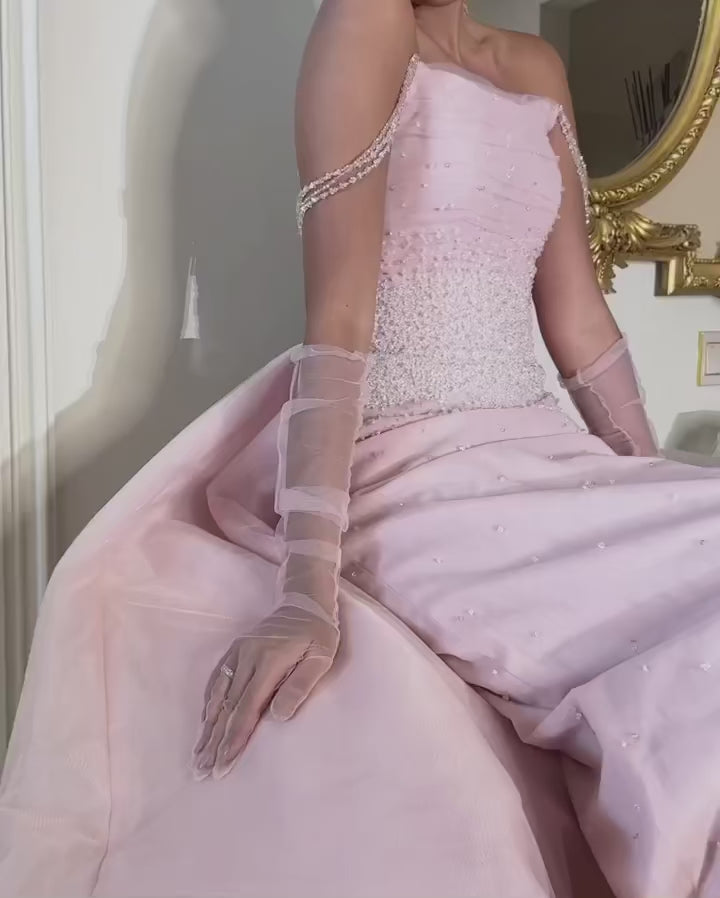 This luxurious pink evening dress by Dreamy Vow is adorned with intricate beading, exuding elegance and sophistication. The overskirt adds a touch of glamour, while the gloves complete the look. Perfect for formal events and weddings, this Arab-inspired gown is sure to make a statement.