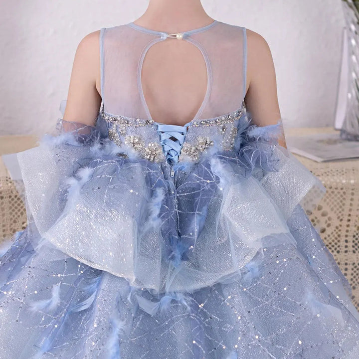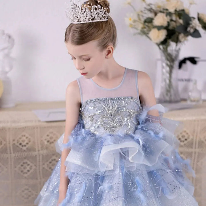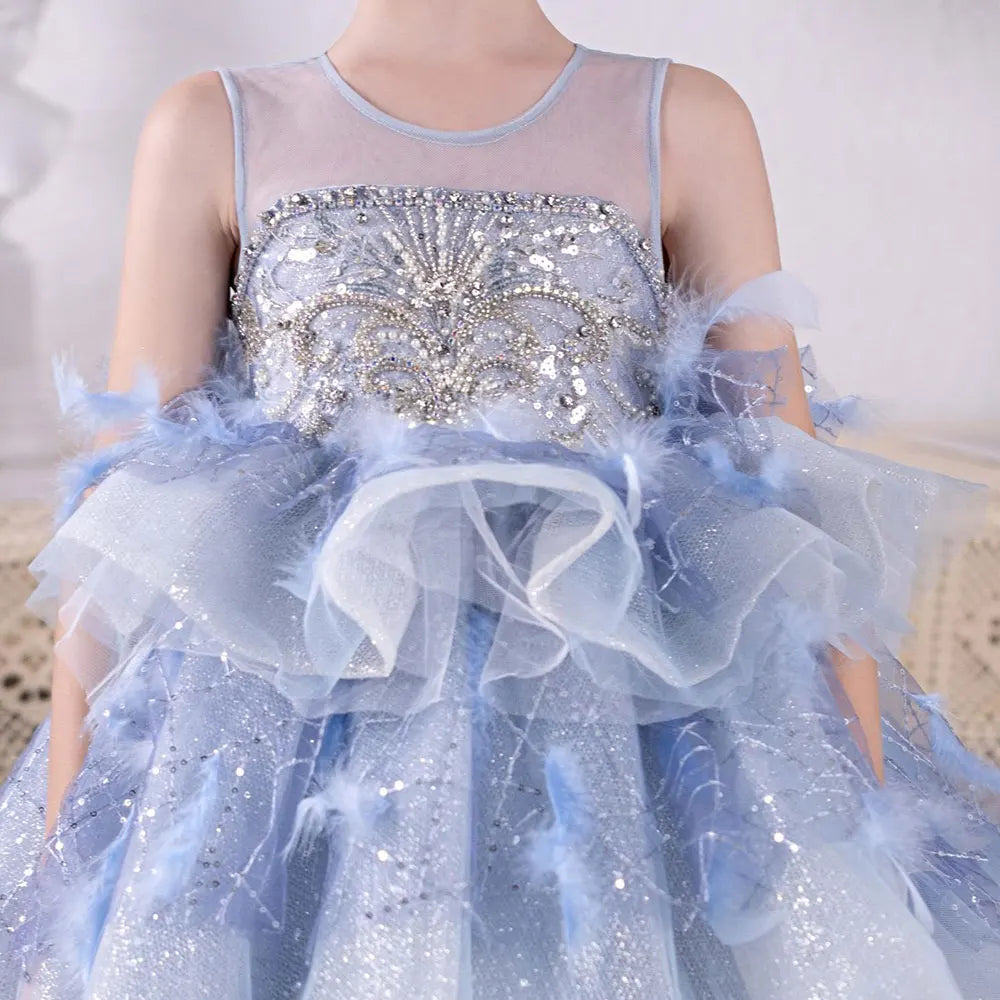 Luxury Dubai Sky Blue Flower Girl Dresses Beading Feathers J134