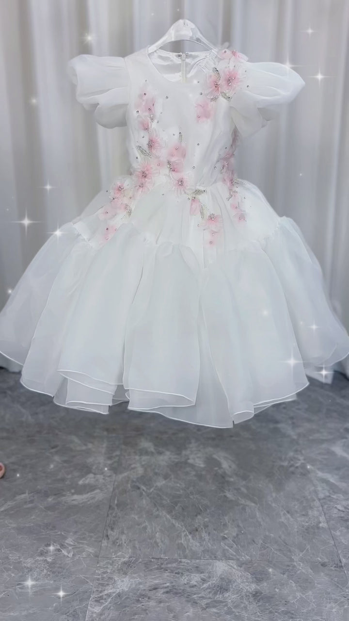 Luxury Dubai White Girl Dress 3D Flowers Beading Ball Gown J348