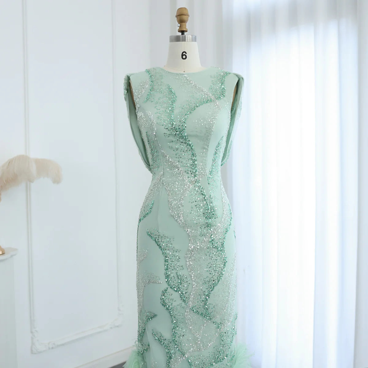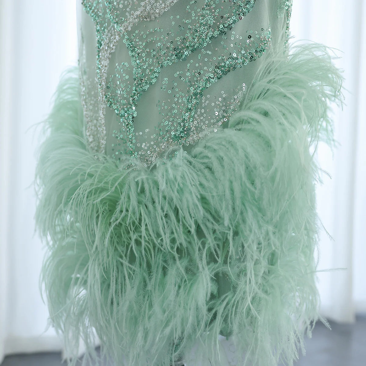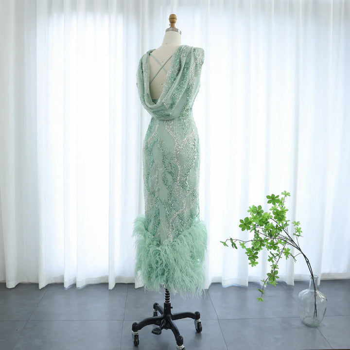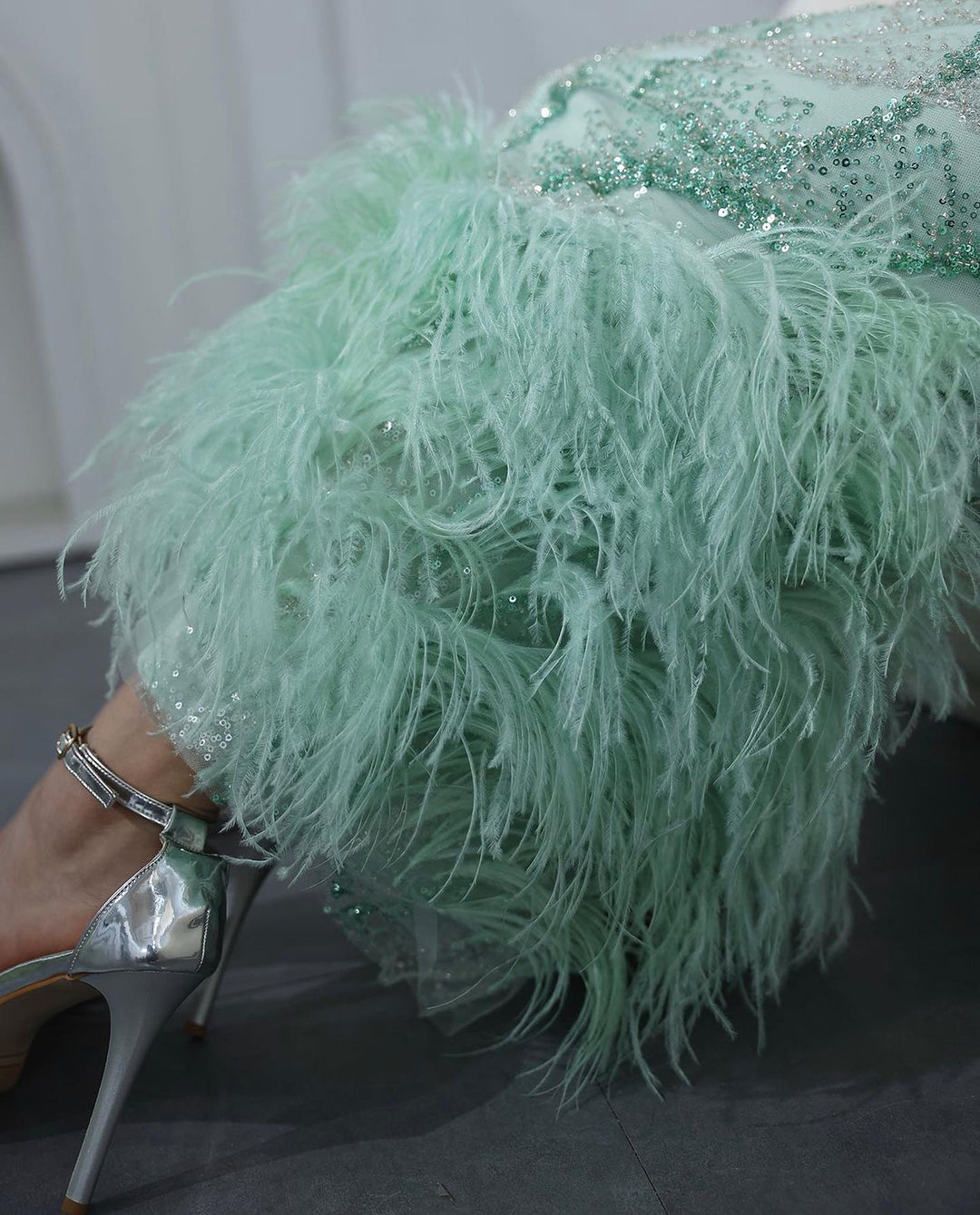 Make your evening unforgettable with Dreamy Vow's Luxury Feather Sage Green Arabic Evening Dress. With a criss cross back and midi length, this formal gown will surely turn heads. Perfect for weddings and parties, its exquisite design will make you feel like royalty. SS436.