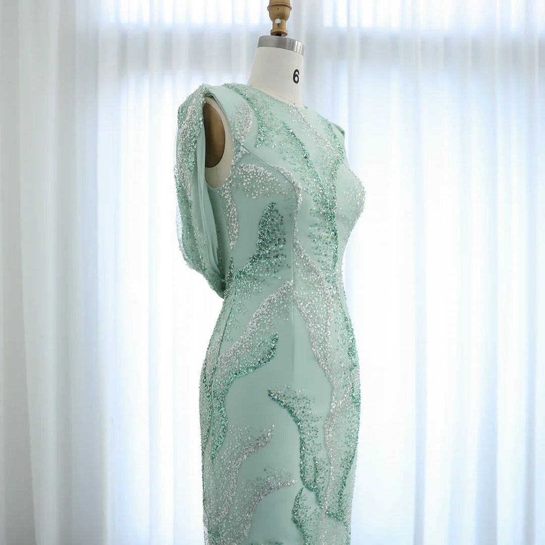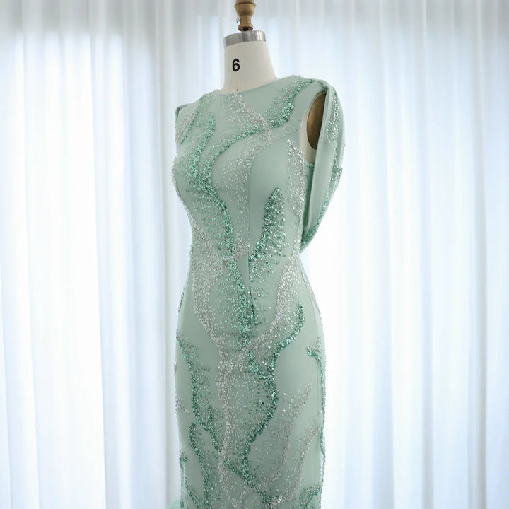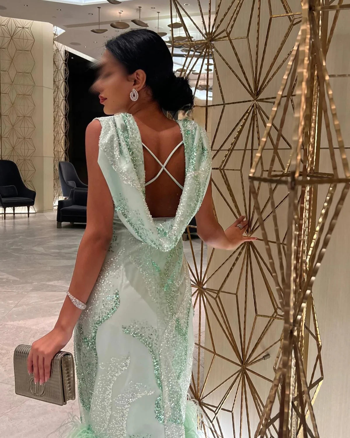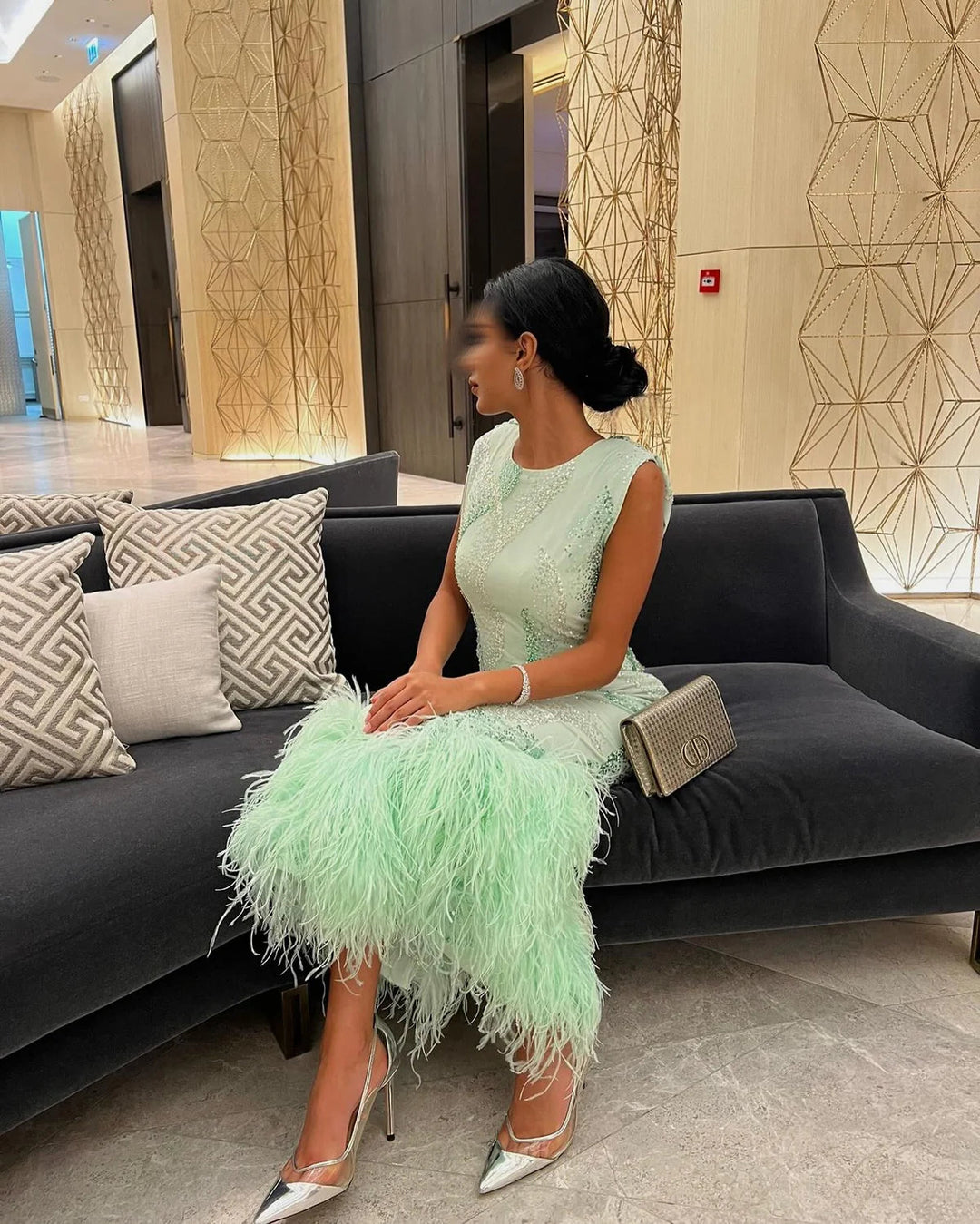 Make your evening unforgettable with Dreamy Vow's Luxury Feather Sage Green Arabic Evening Dress. With a criss cross back and midi length, this formal gown will surely turn heads. Perfect for weddings and parties, its exquisite design will make you feel like royalty. SS436.