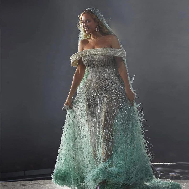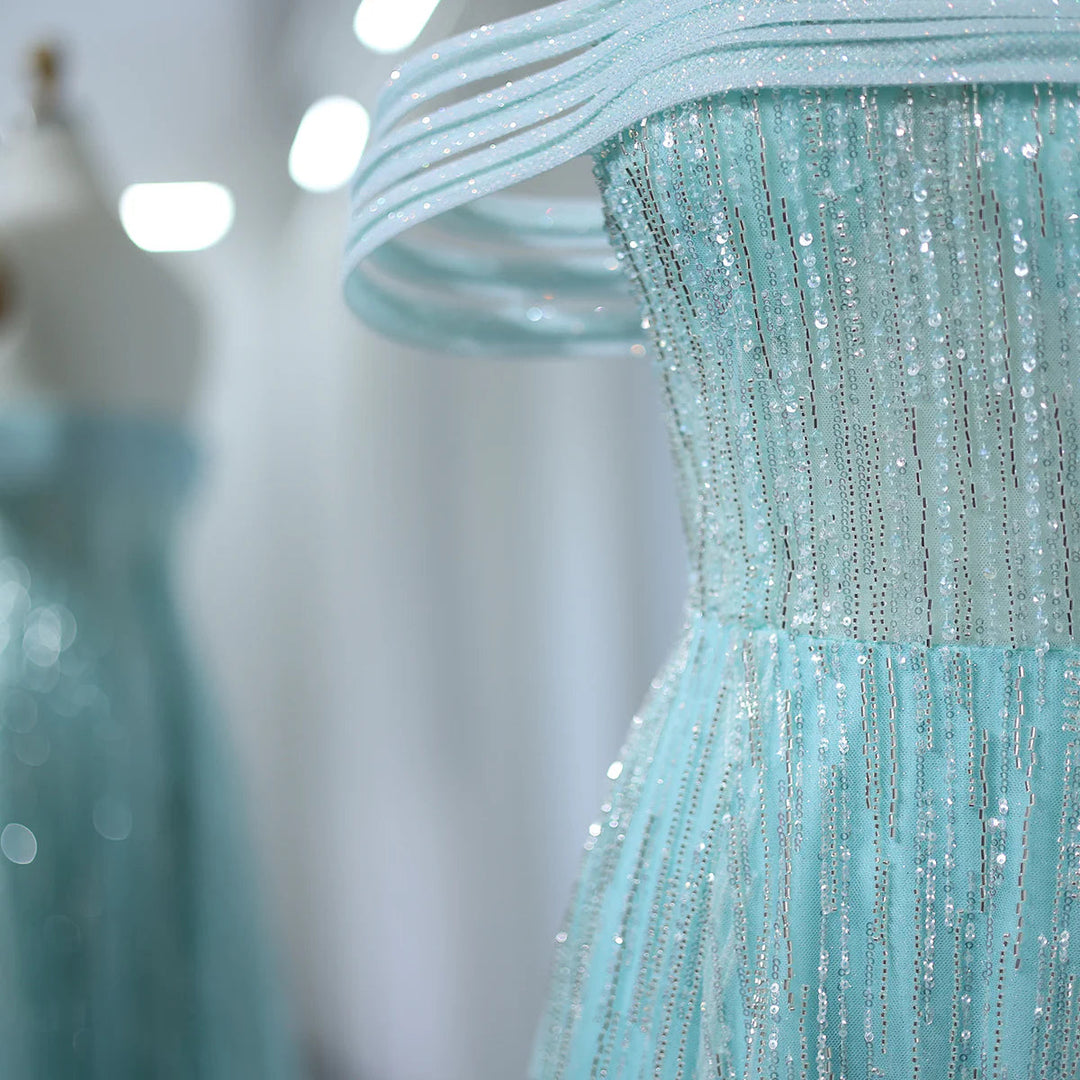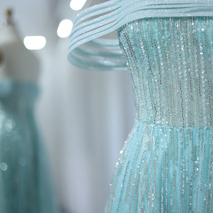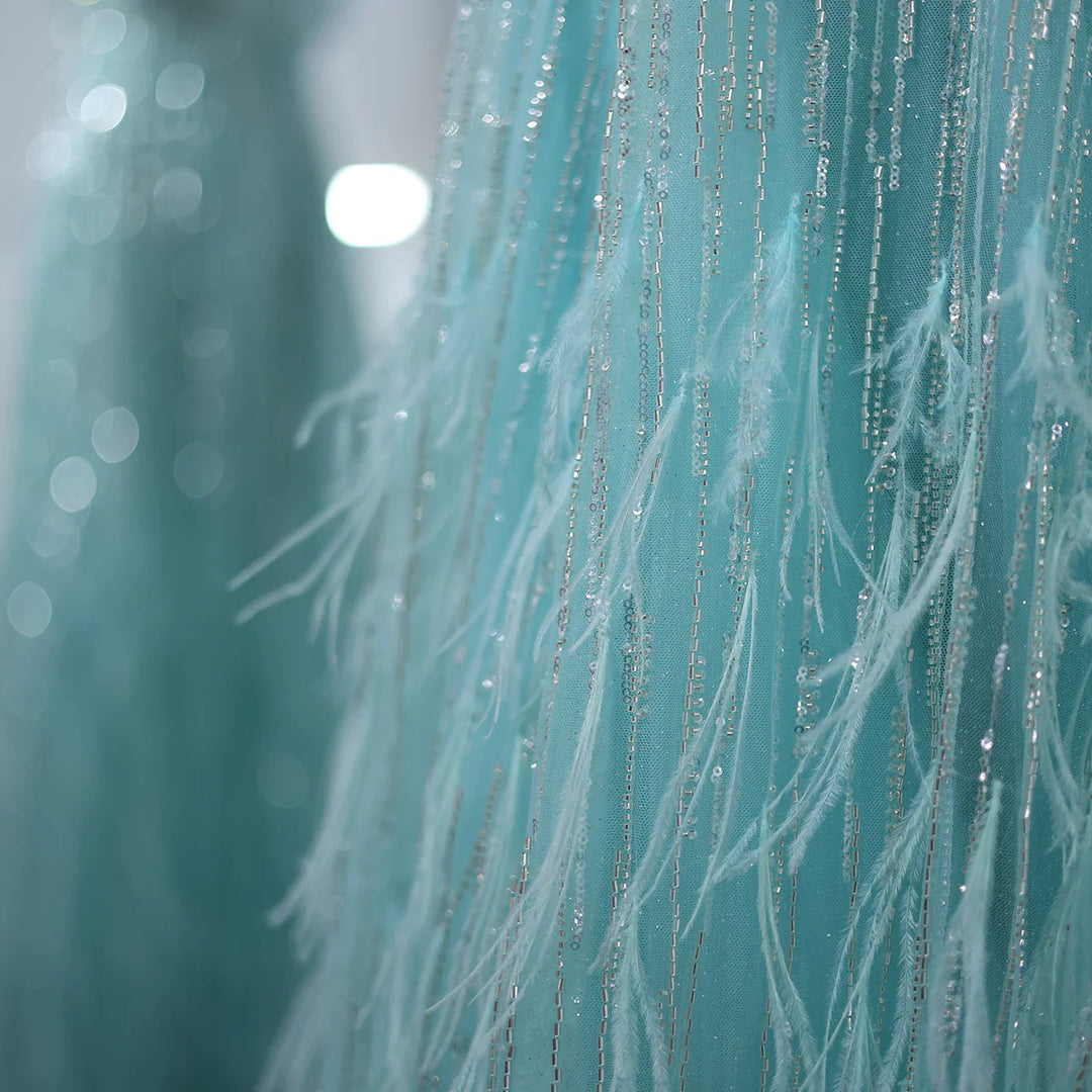 Luxury Feathers Aqua Green Evening Dresses Elegant Off Shoulder SS435