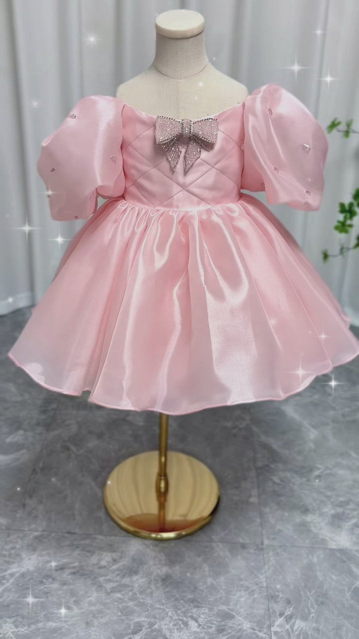 Luxury Pink Girl Dress Beaded Puffy Sleeve Bow Dubai Princess M032
