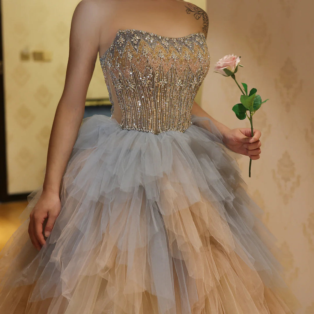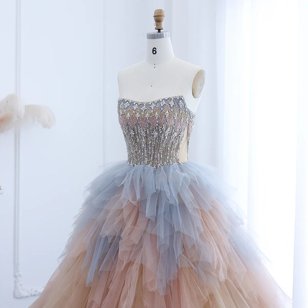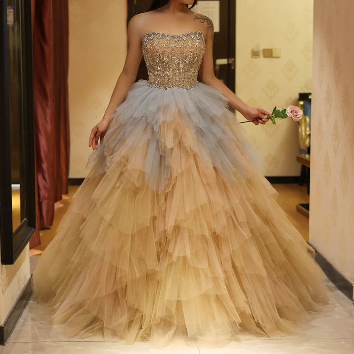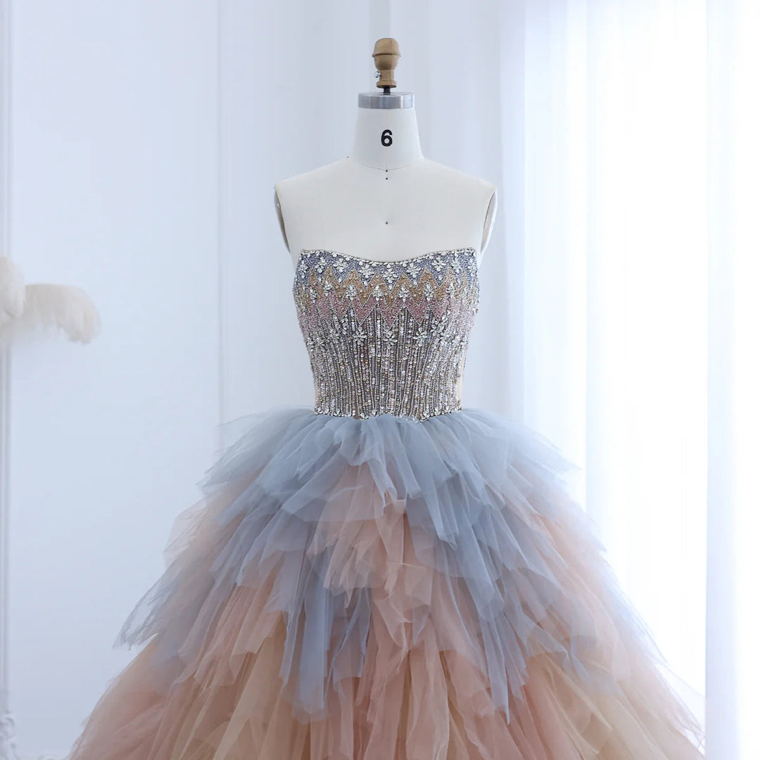 Luxury Rose Gold Blue Ruffles Princess Ball Gown Evening Dress SS731