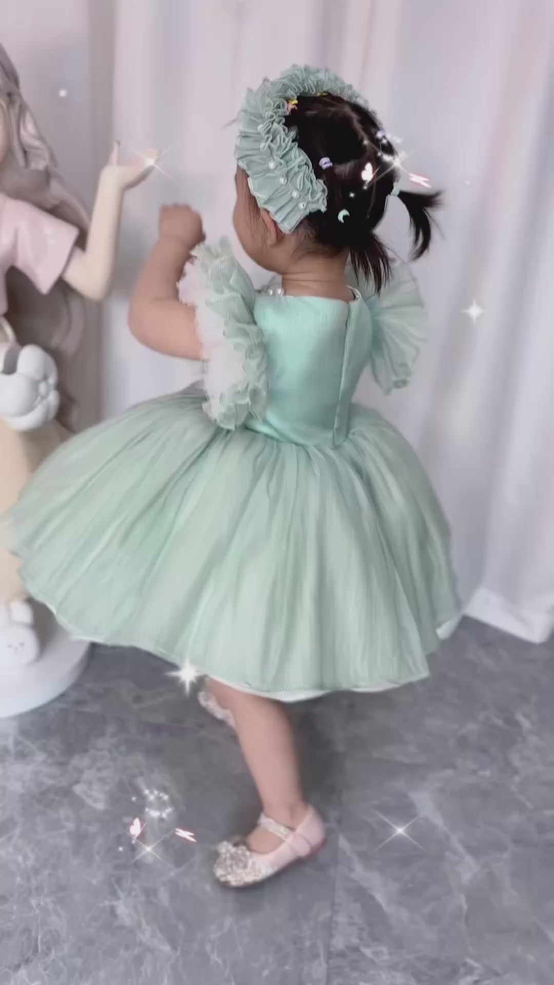 Blue/Green Baby Puffy Sleeve Adorable Girl Dress with Flowers J035