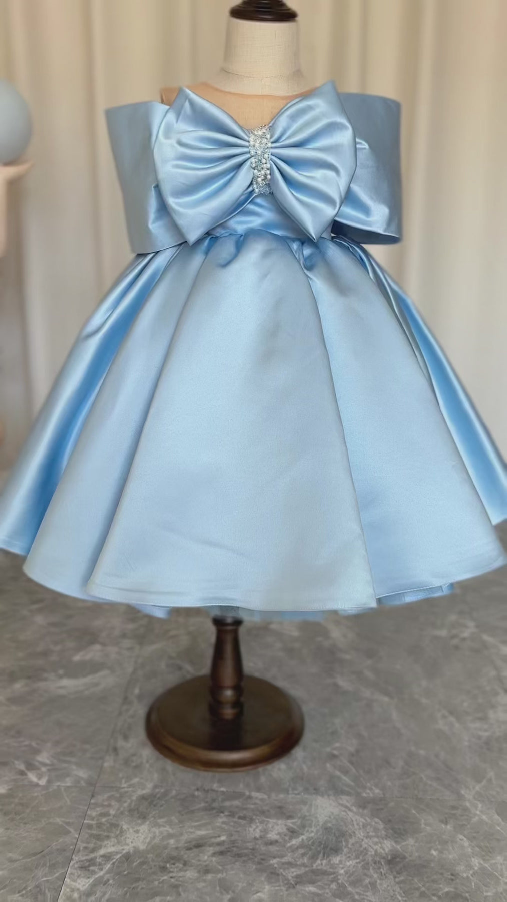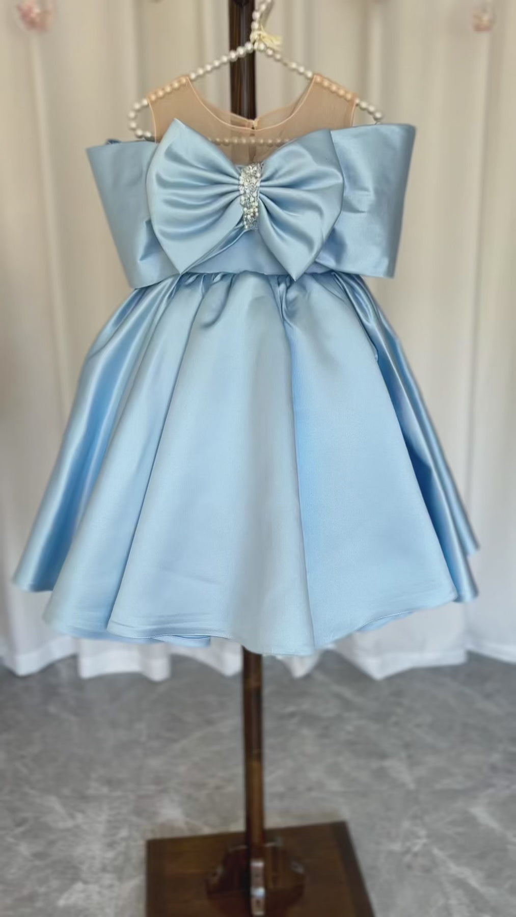 Elegant Satin Beads Flower Girl Dress Blue with Bow Knee Length M181