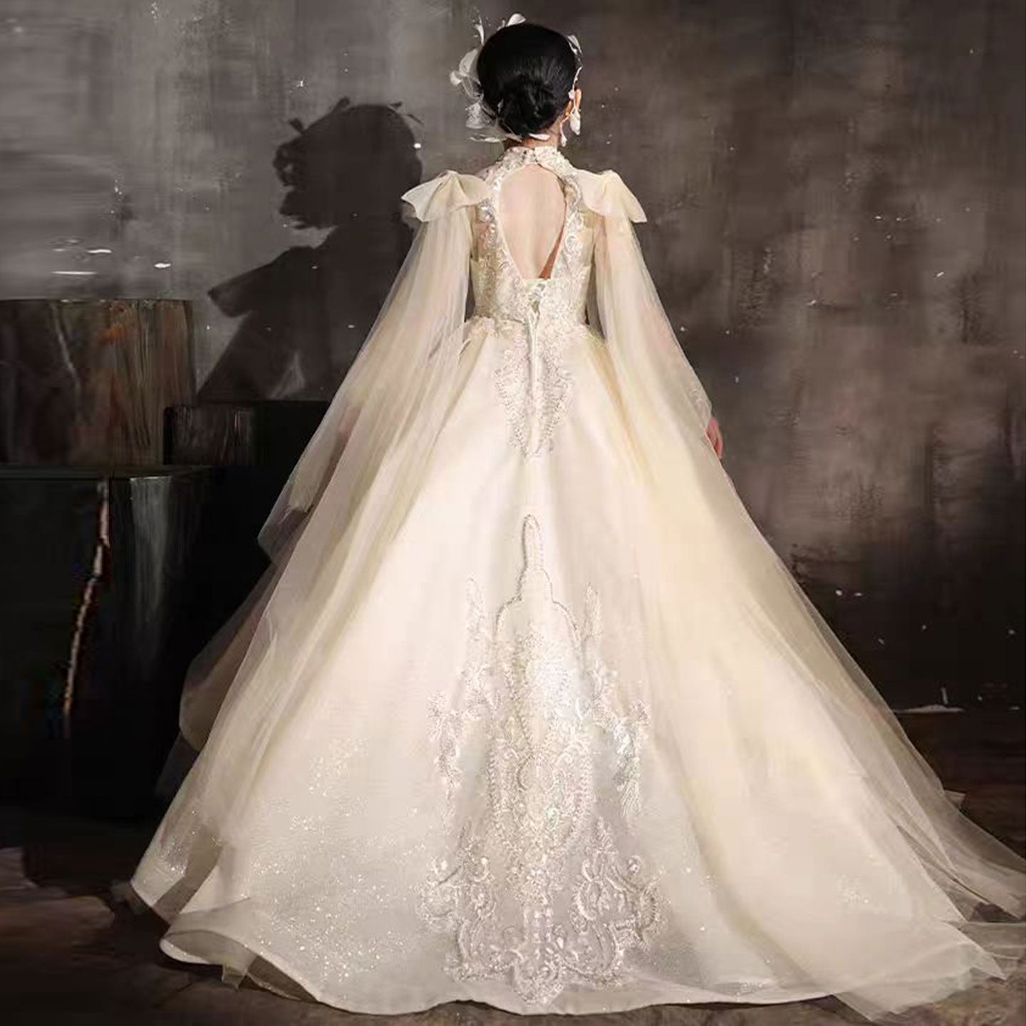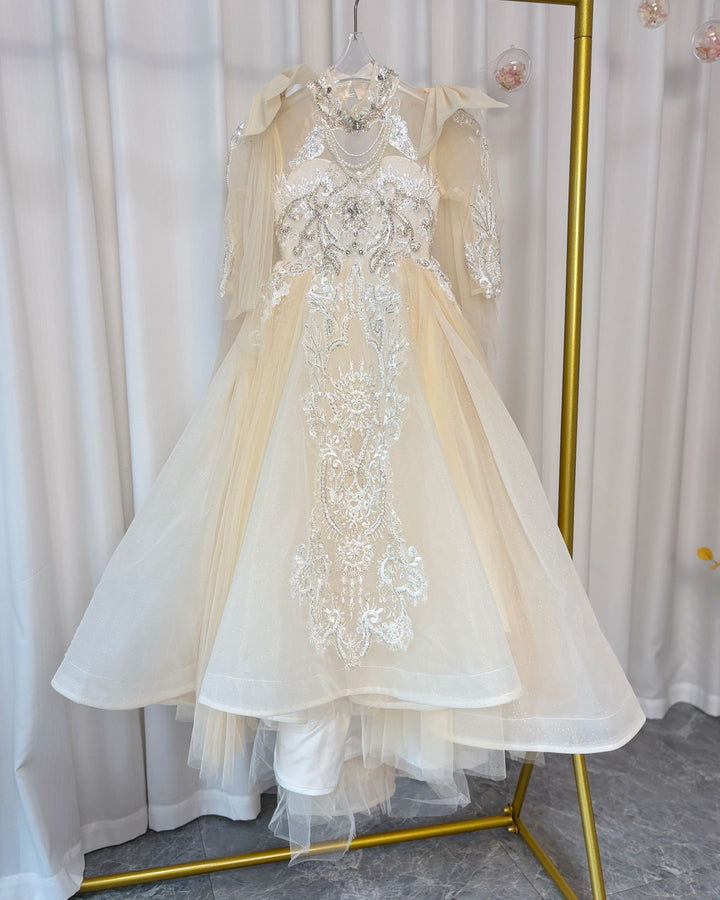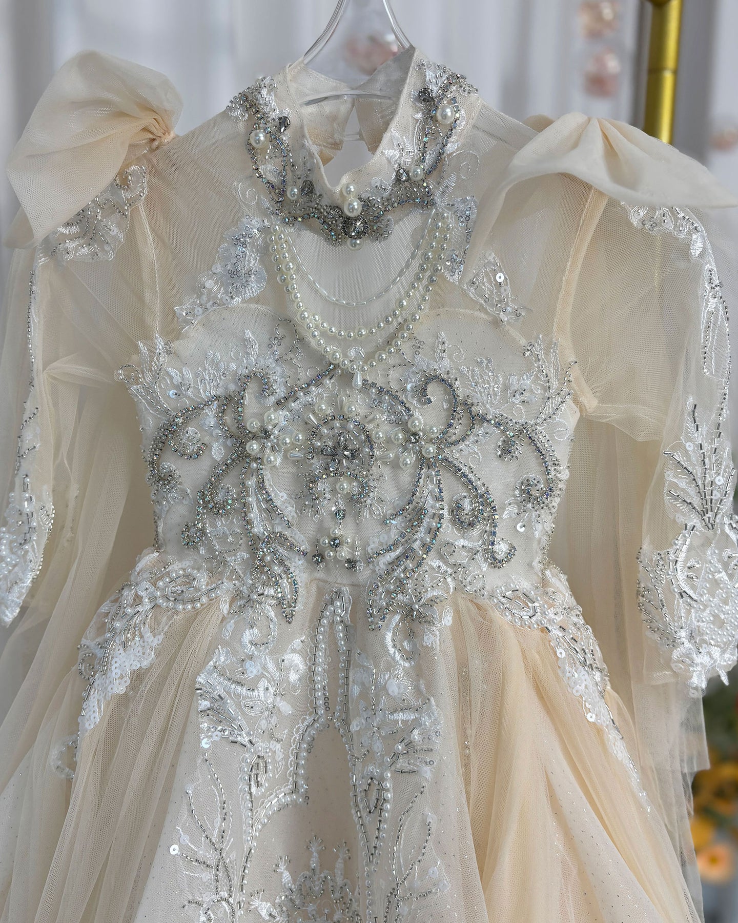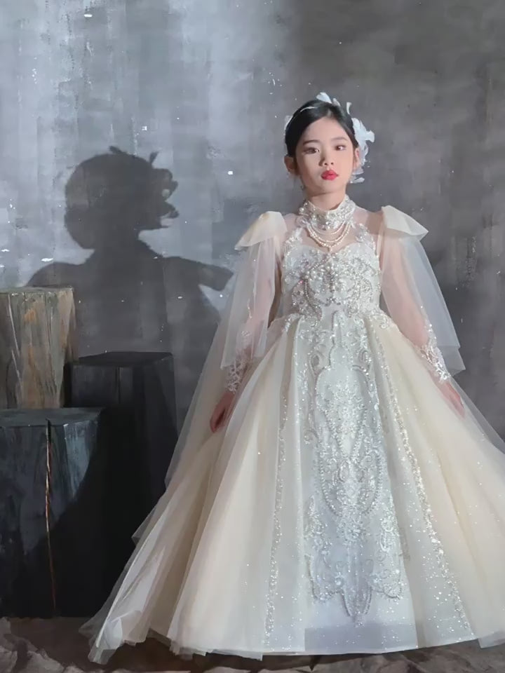 Luxury Champagne Beaded Girl Dress Long Sleeve J337