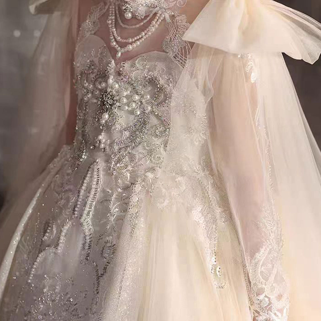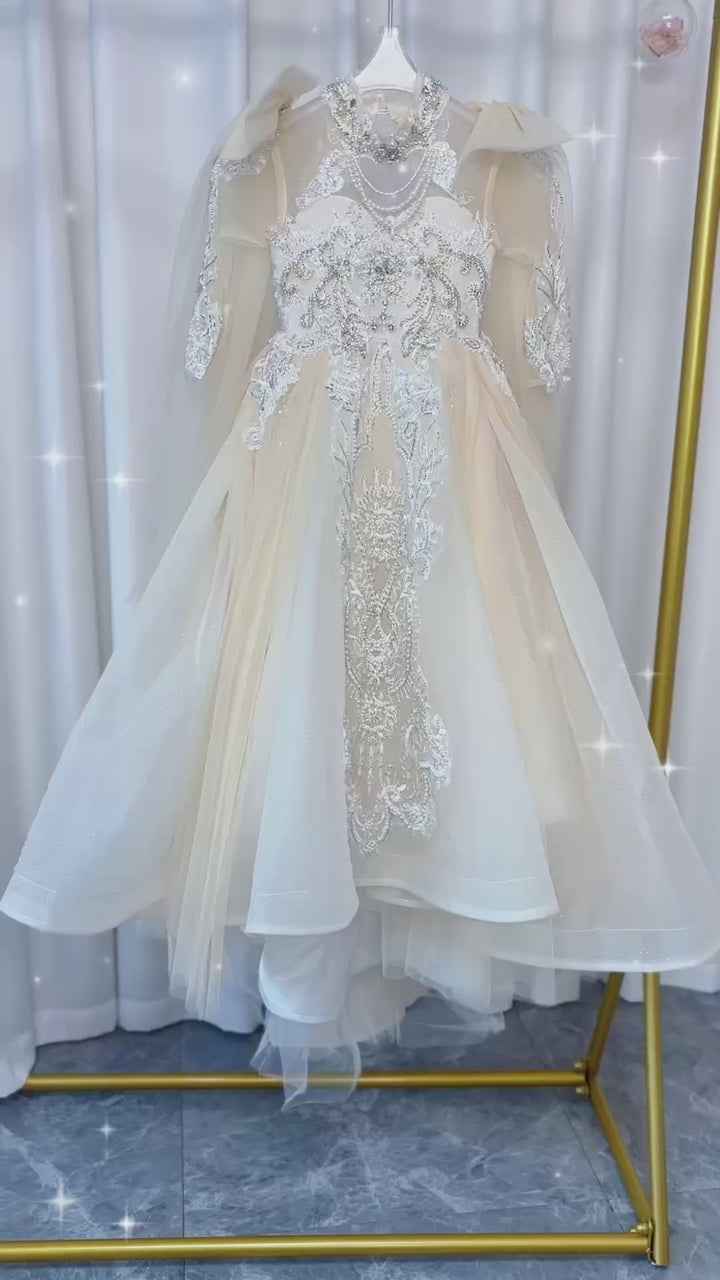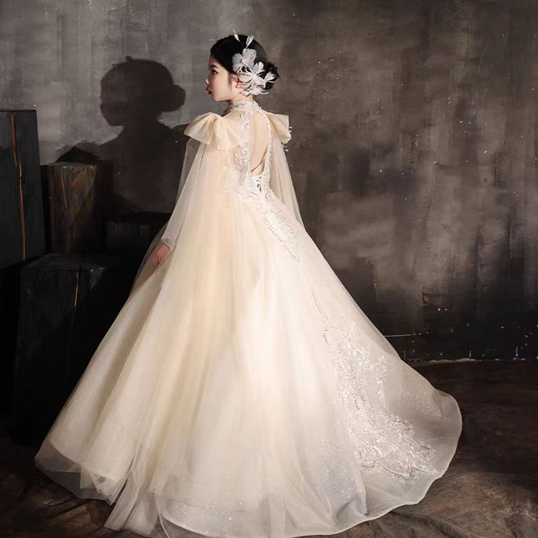 Luxury Champagne Beaded Girl Dress Long Sleeve J337