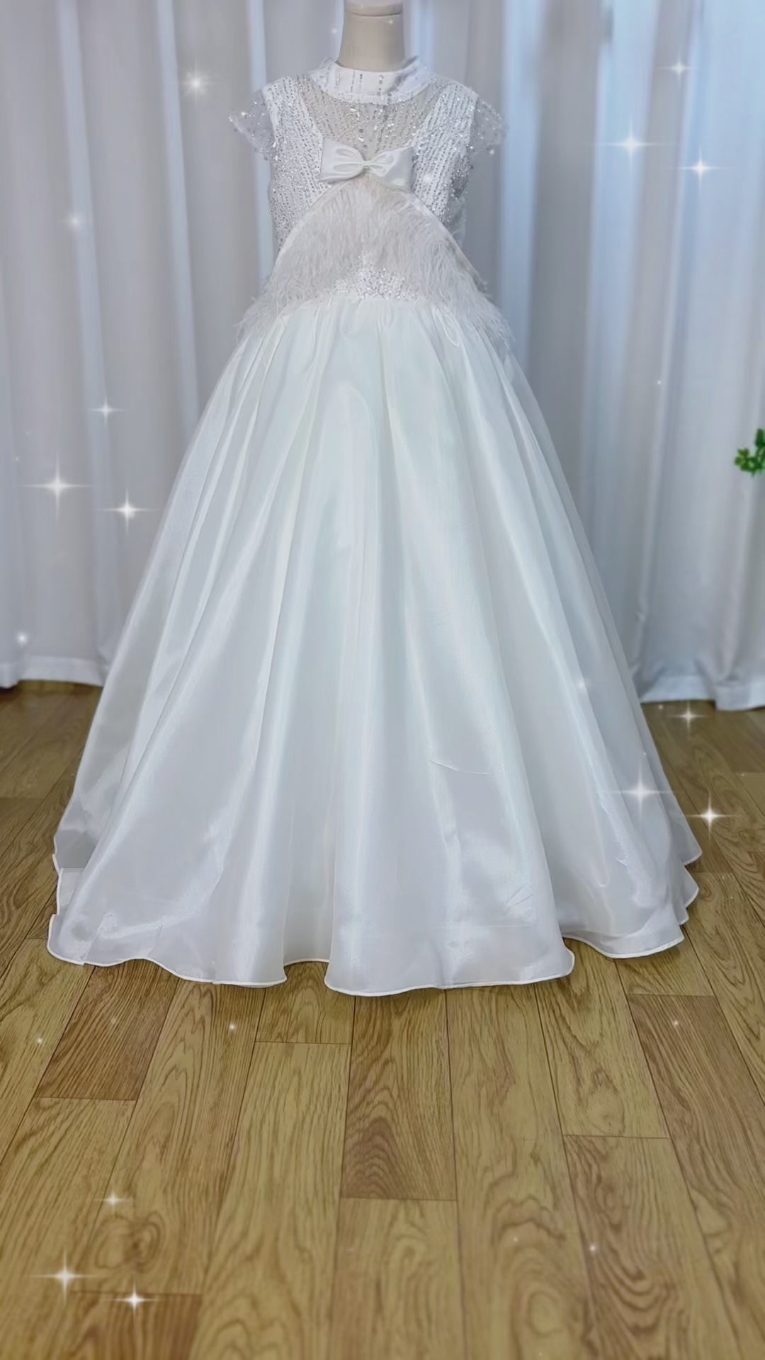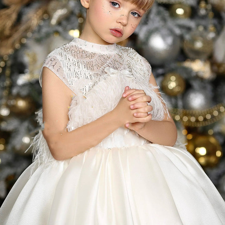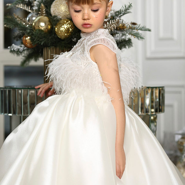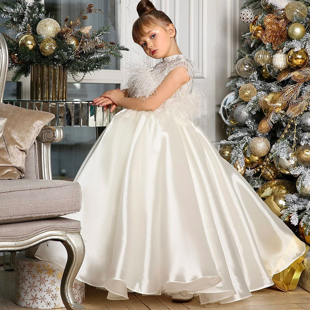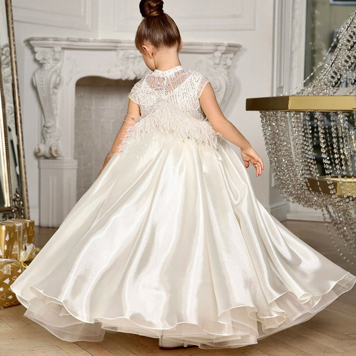 Luxury White Girl Dress Beads Feathers Kids for First Communion J398