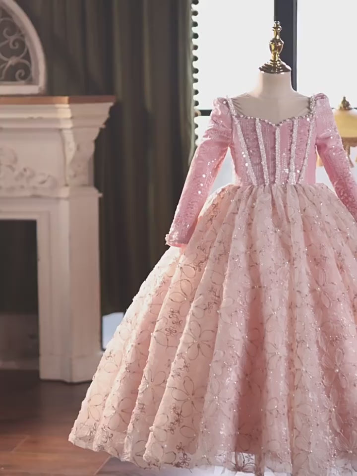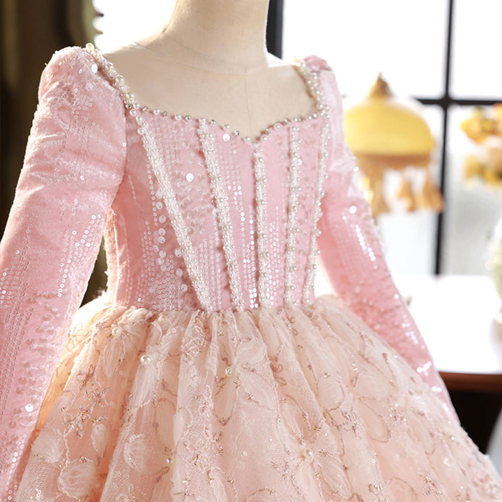 Pink Long Sleeve Beaded Princess Birthday Girl Dress J291