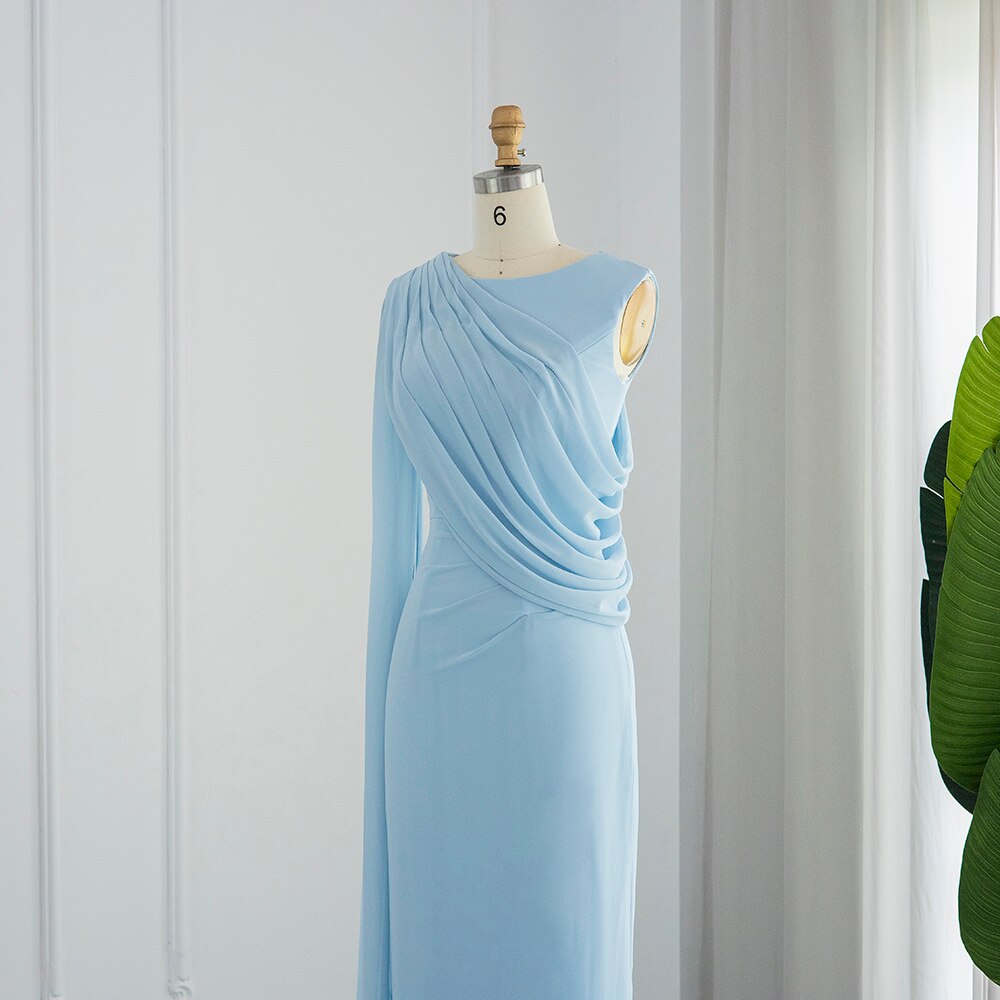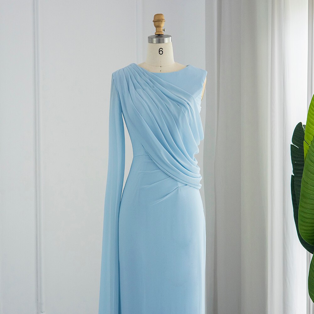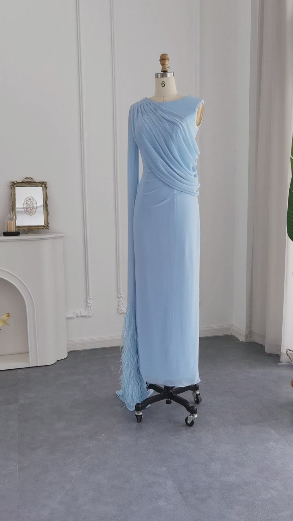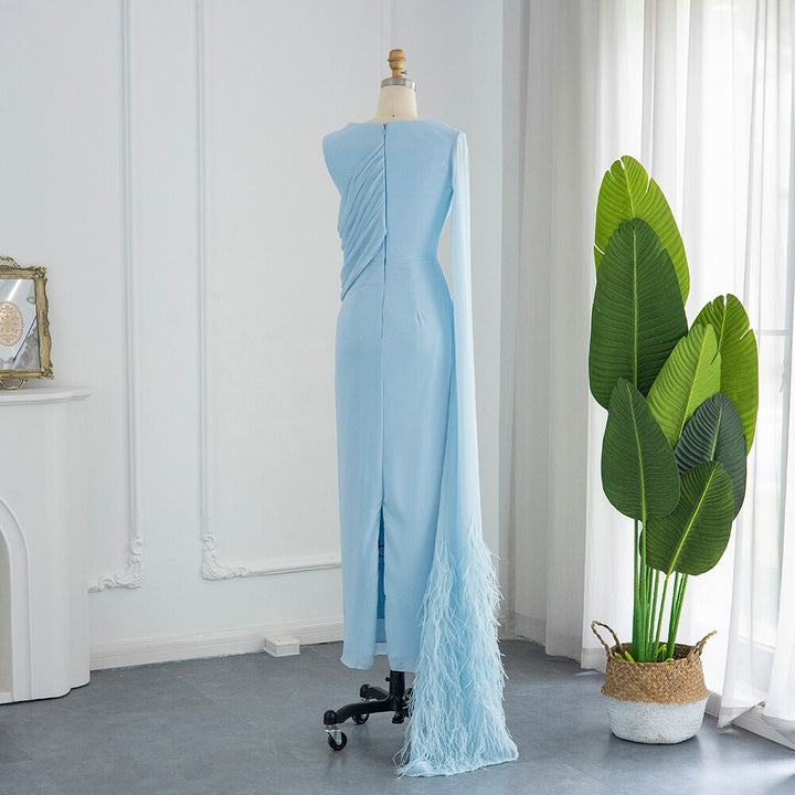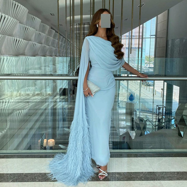 Elegant Light Blue Arabic Evening Dresses with Feathers Cape SF289