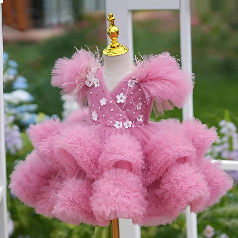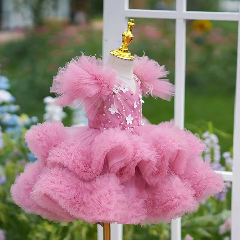 Pink Flowers Knee Length 1st Birthday Party Girl Dress J356
