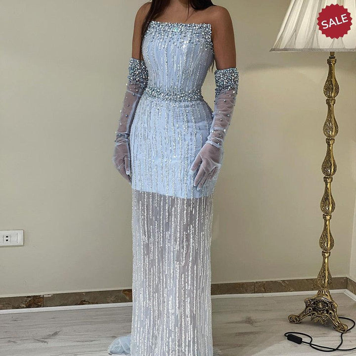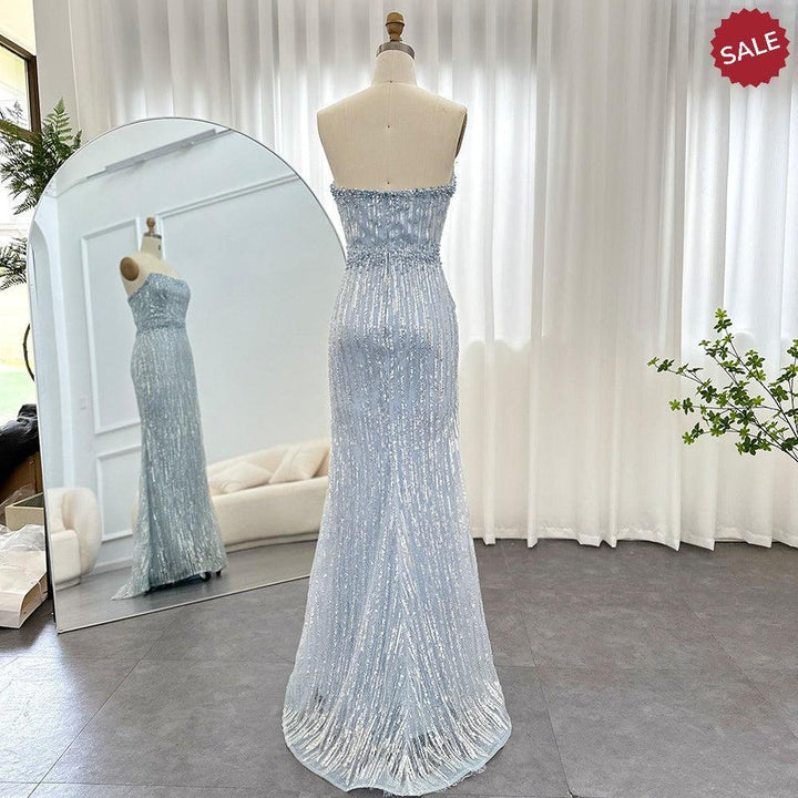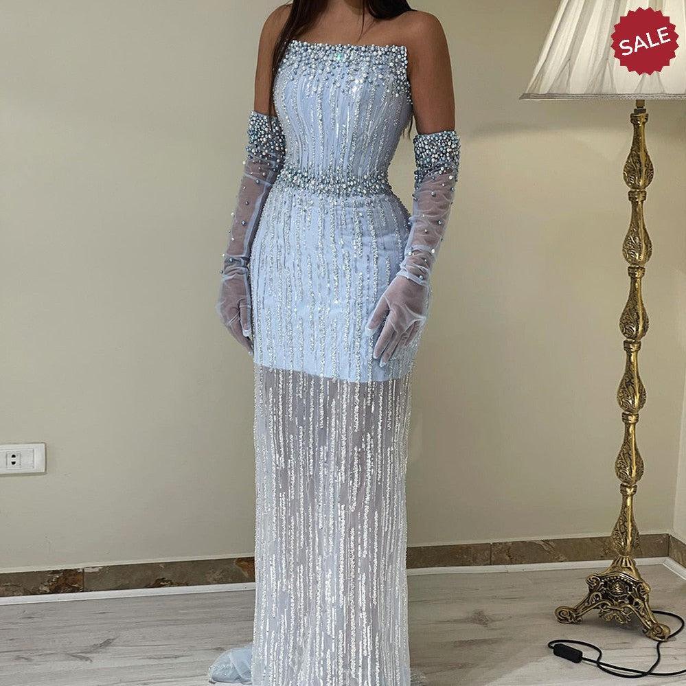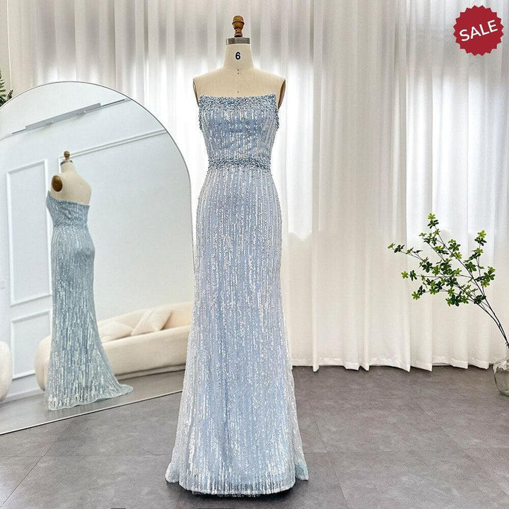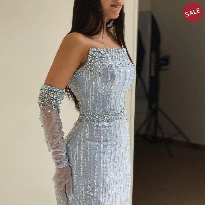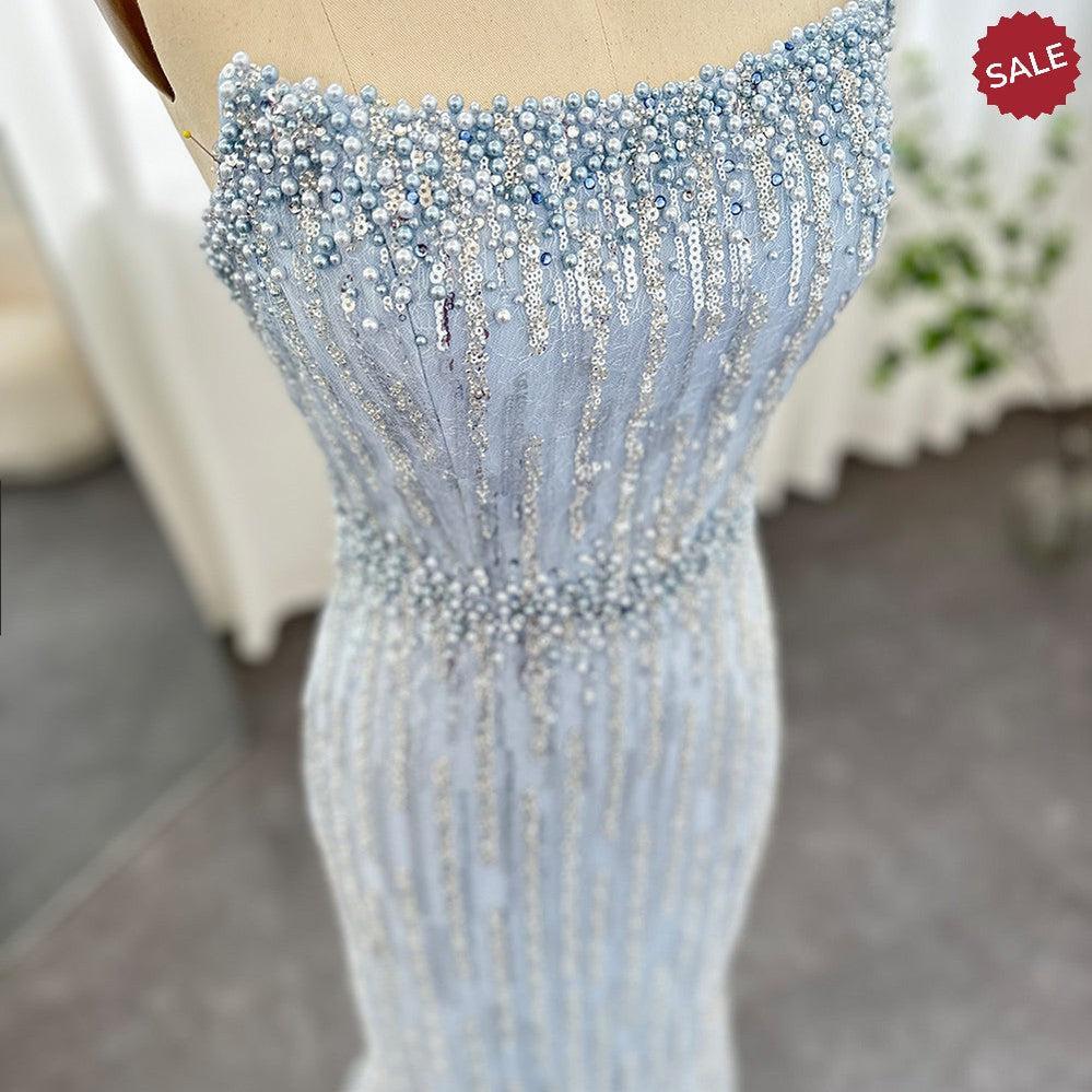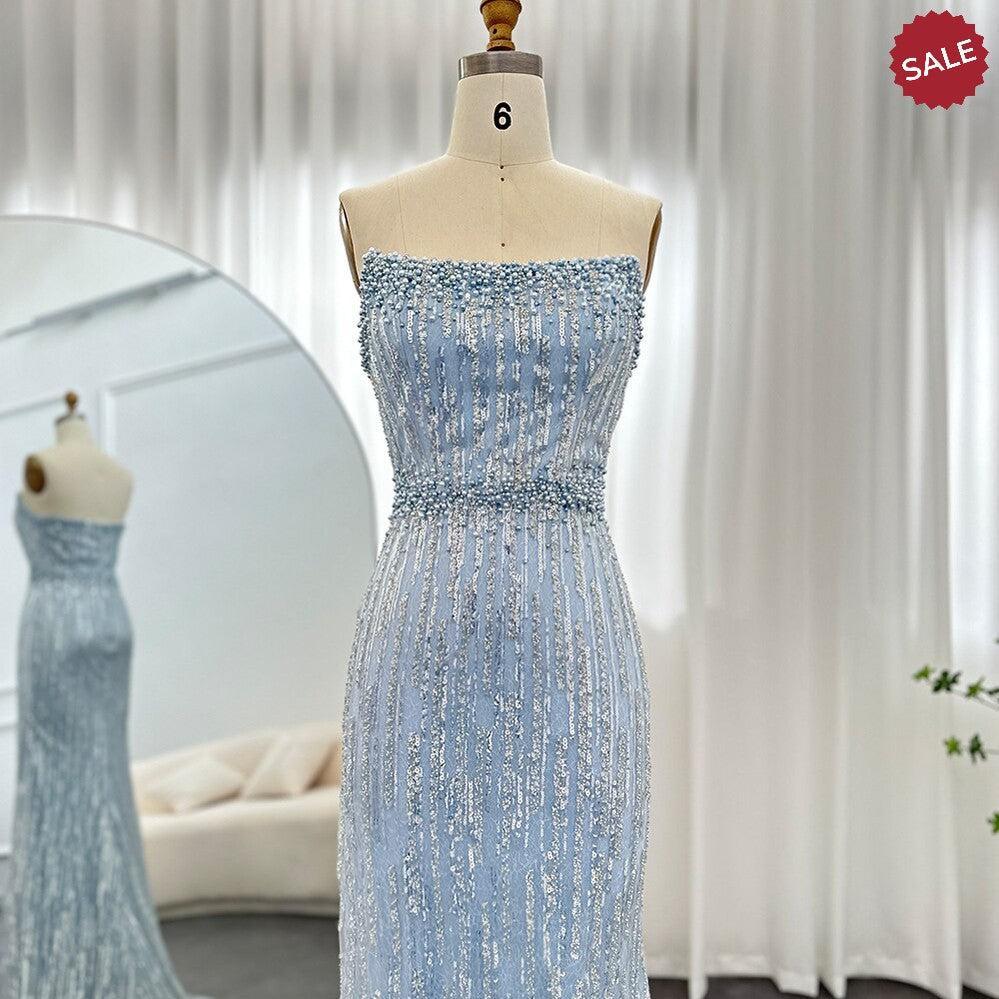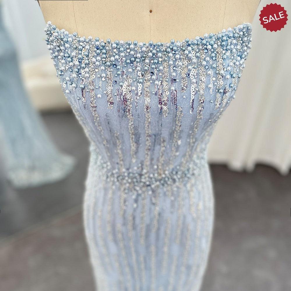 Light Blue Pearls Luxury Dubai Evening Dresses Elegant Strapless SS395