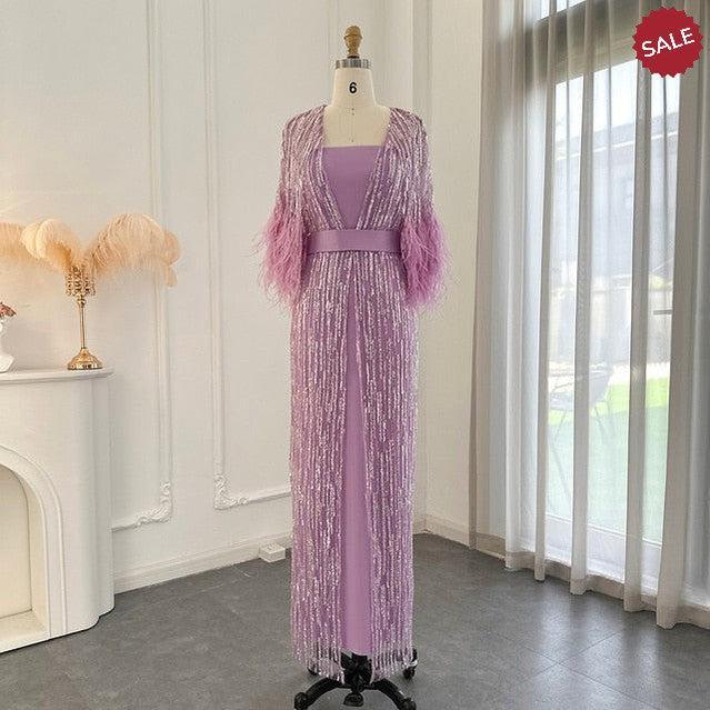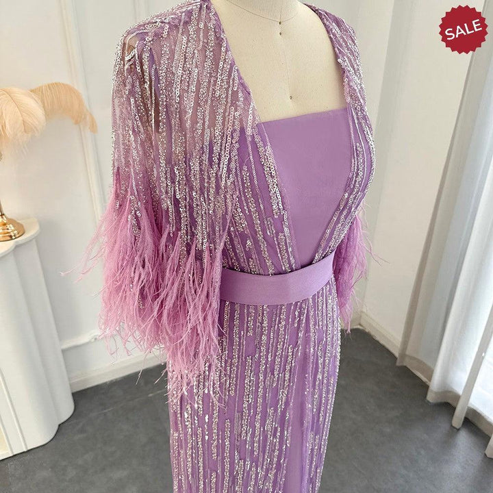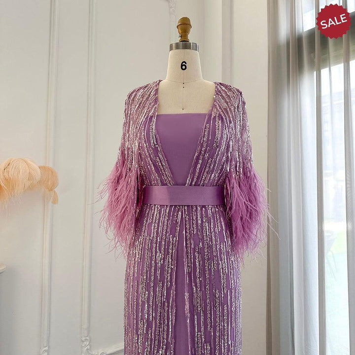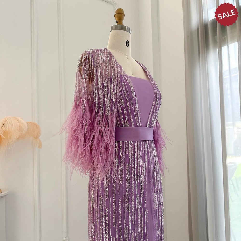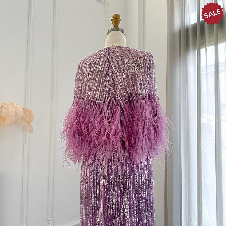 Dreamy Vow Light Yellow Luxury Dubai Feathers Evening Dresses for Women Wedding Party Arabic Purple Formal Prom Gowns 430