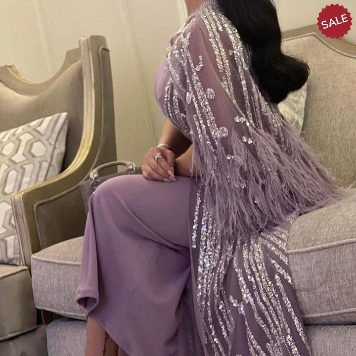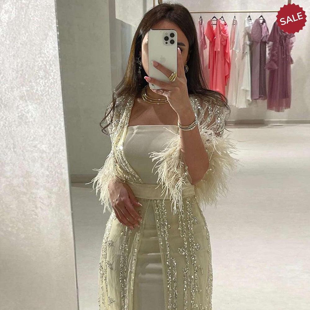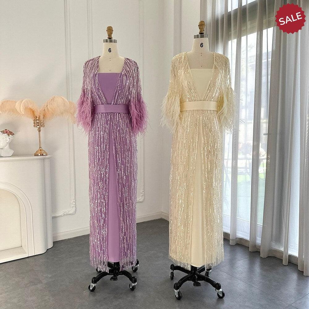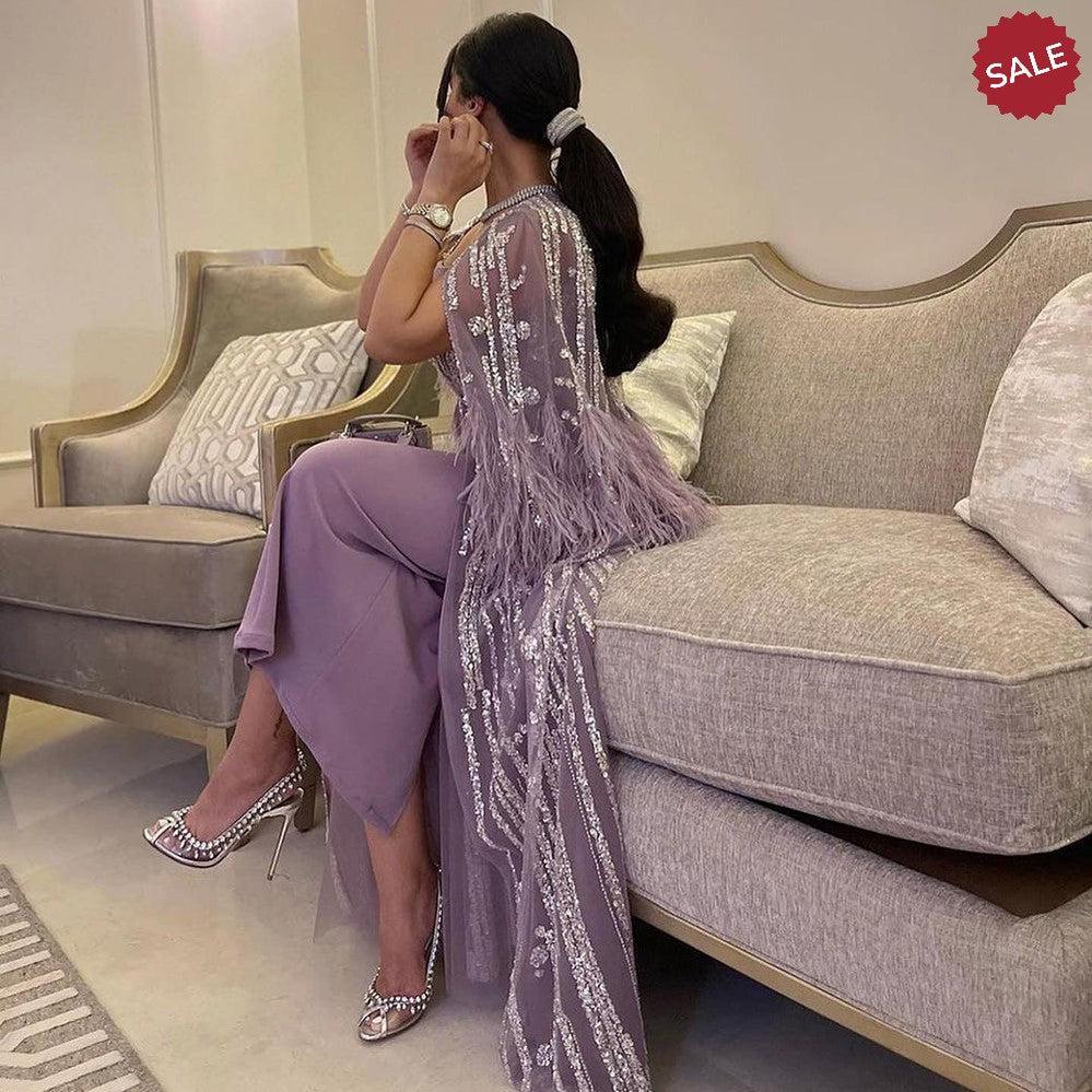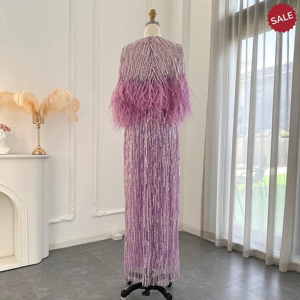 Elevate your evening with the Dreamy Vow Luxury Dubai Feathers Evening Dress. This light yellow gown features delicate feathers and a stunning Arabic purple design, perfect for weddings and formal occasions. The epitome of luxury, this dress will make you feel elegant and glamorous all night long.