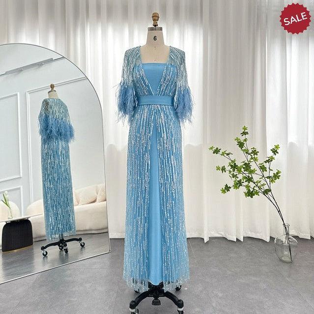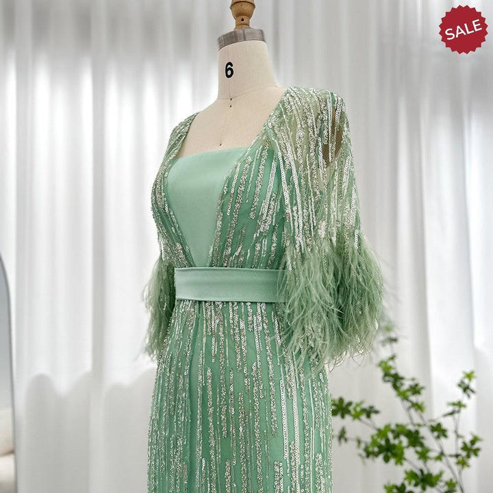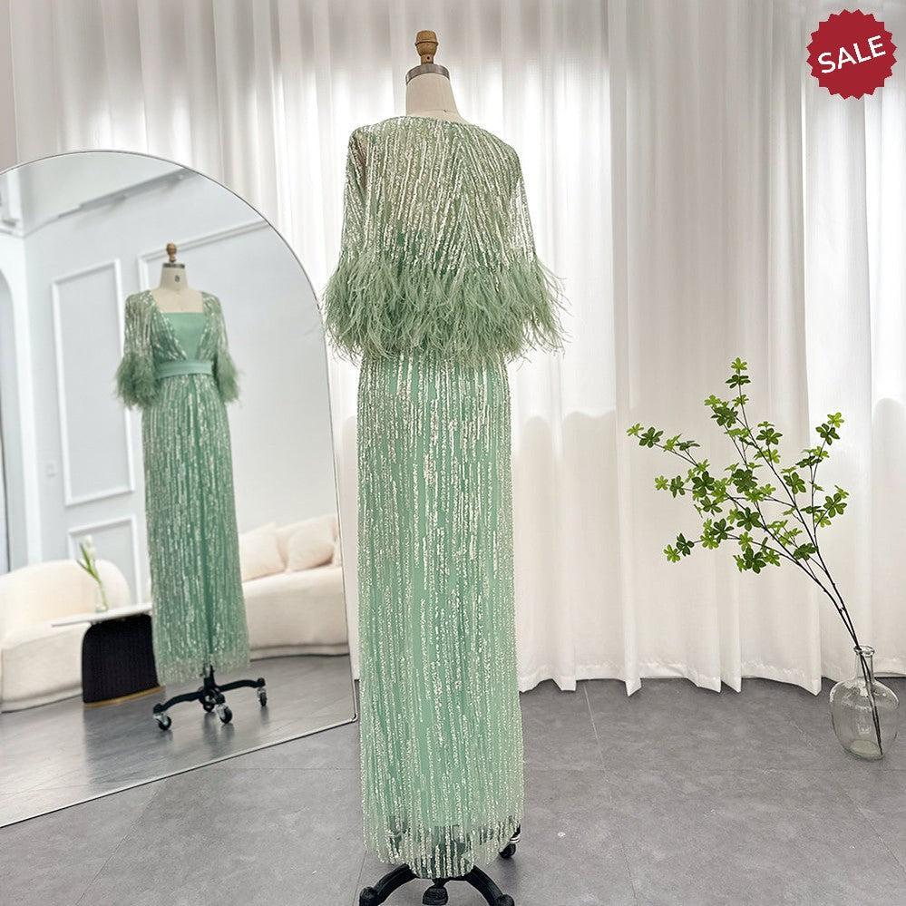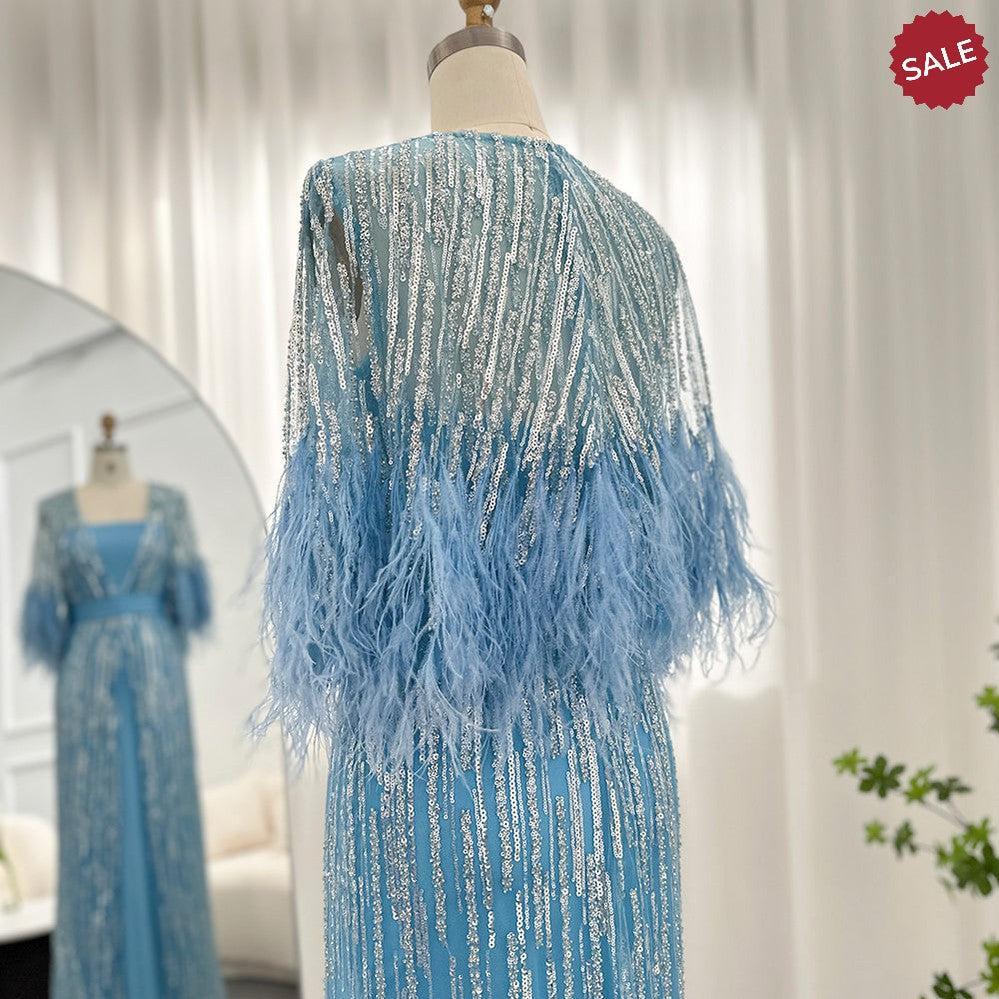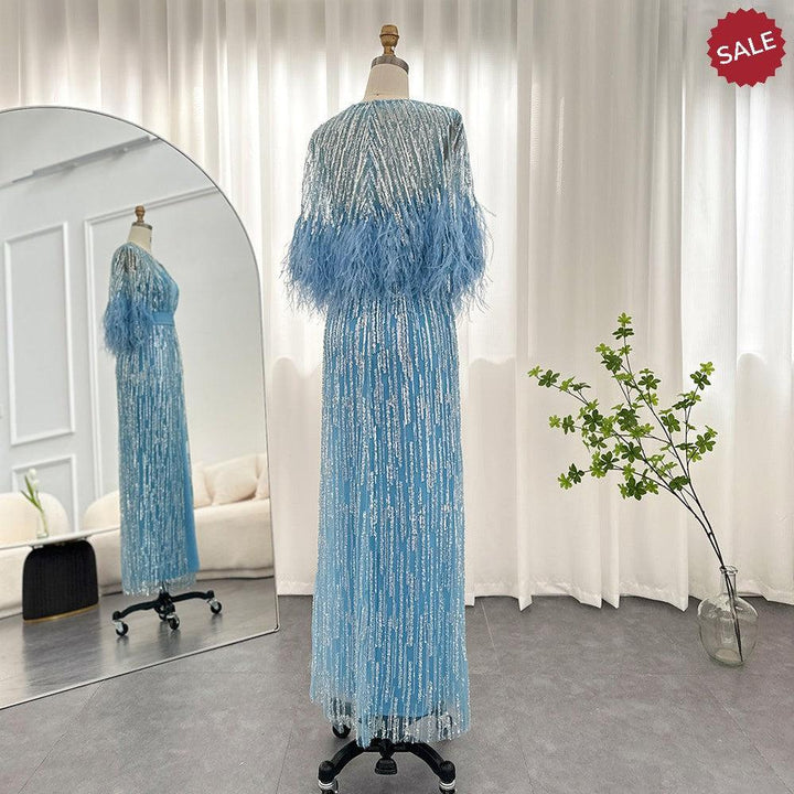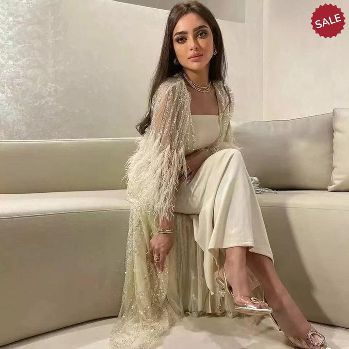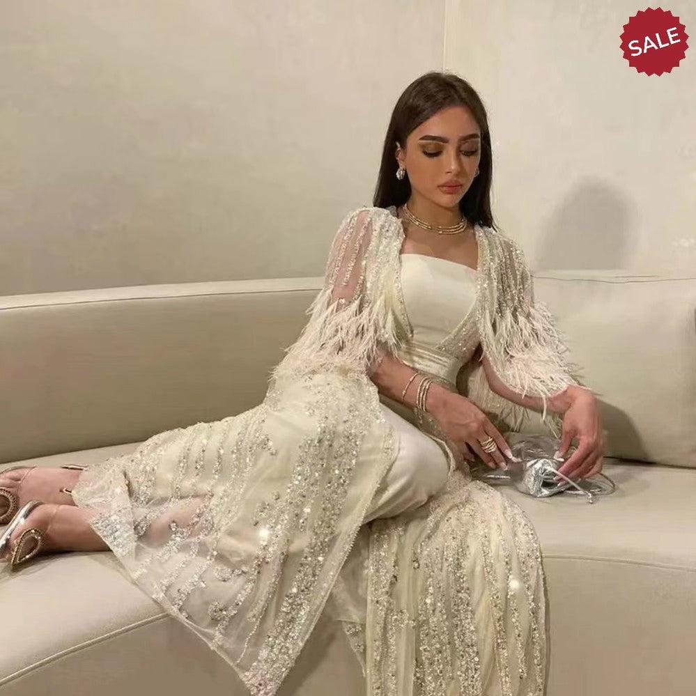Elevate your evening with the Dreamy Vow Luxury Dubai Feathers Evening Dress. This light yellow gown features delicate feathers and a stunning Arabic purple design, perfect for weddings and formal occasions. The epitome of luxury, this dress will make you feel elegant and glamorous all night long.