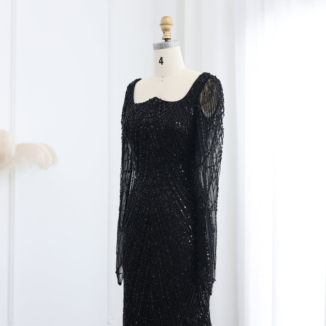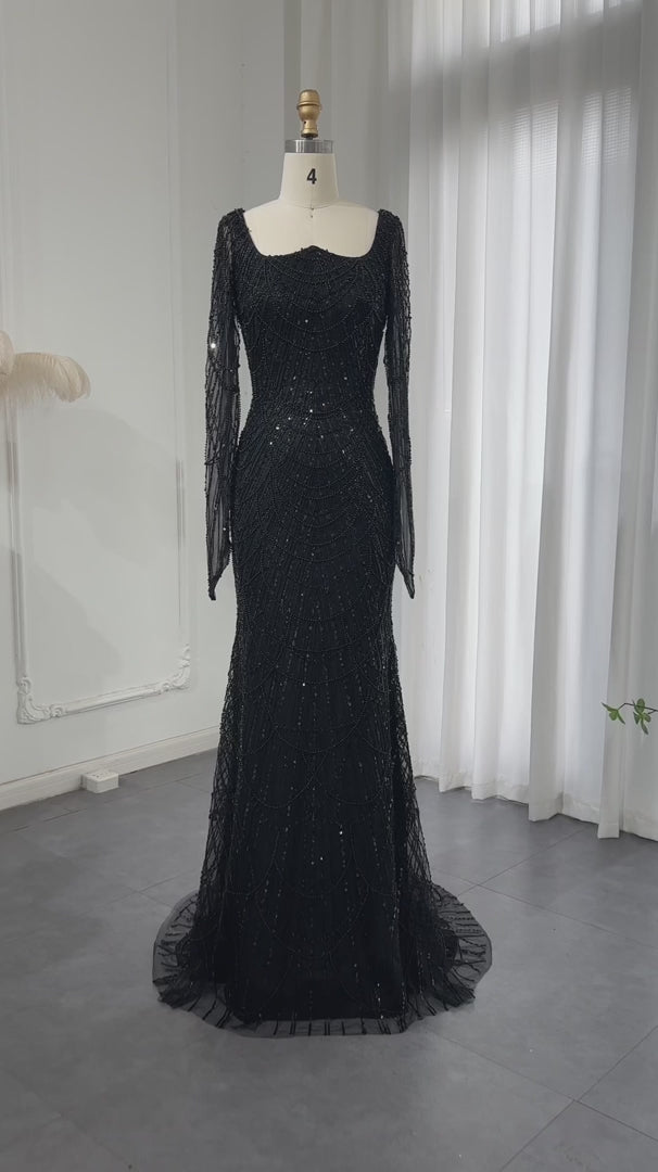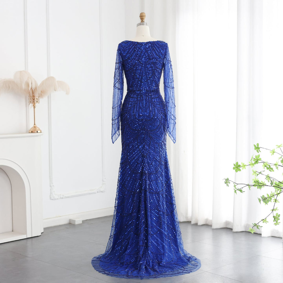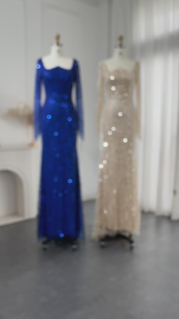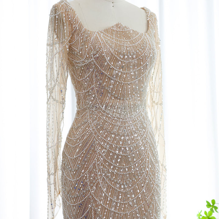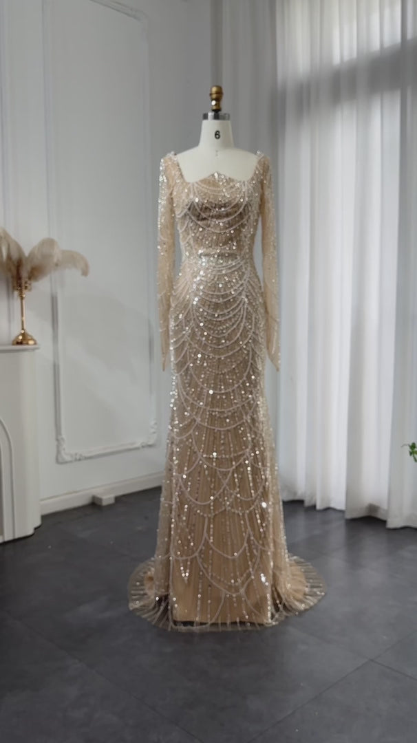 Luxury Beaded Champagne Long Sleeves Mermaid Evening Dress SS686