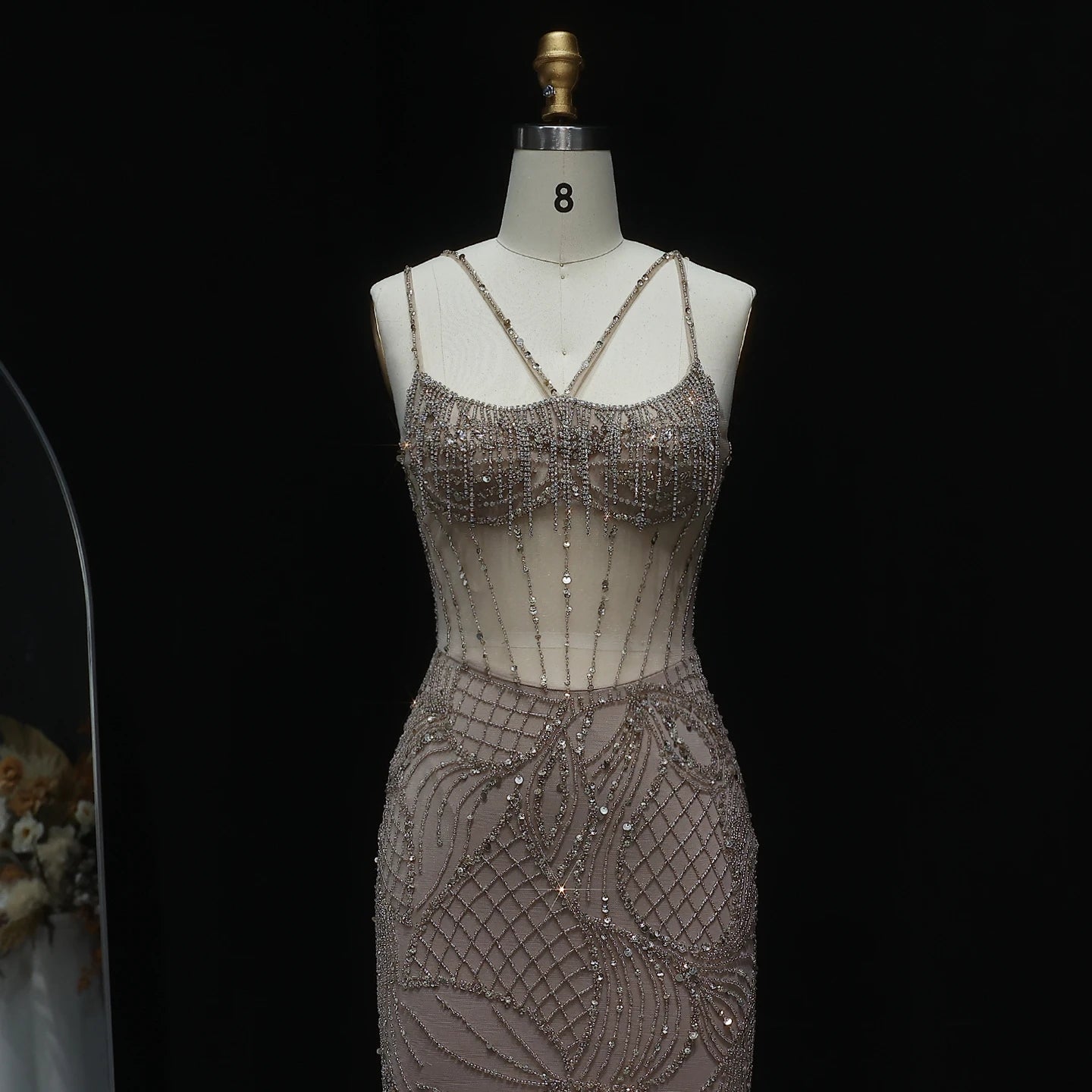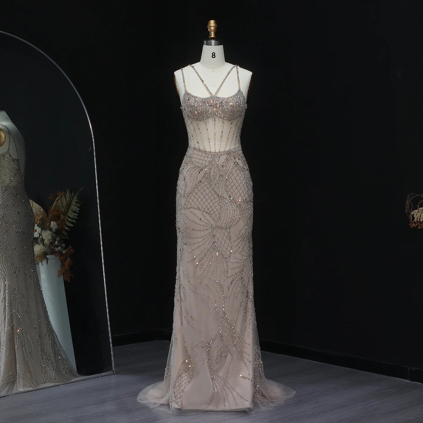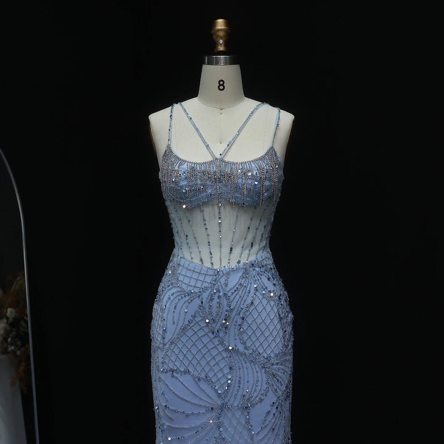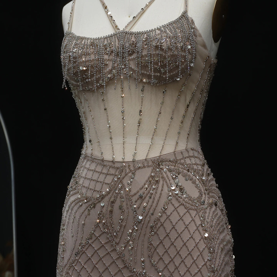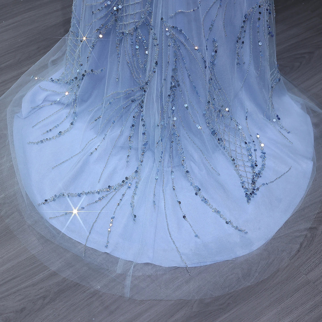 This stunning evening dress features intricate beading and a mesmerizing light blue color, evoking the glamour of Dubai. The mermaid silhouette and long jacket strap accentuate your curves and add a touch of elegance to any special occasion. Make a statement in this luxurious and stylish gown.