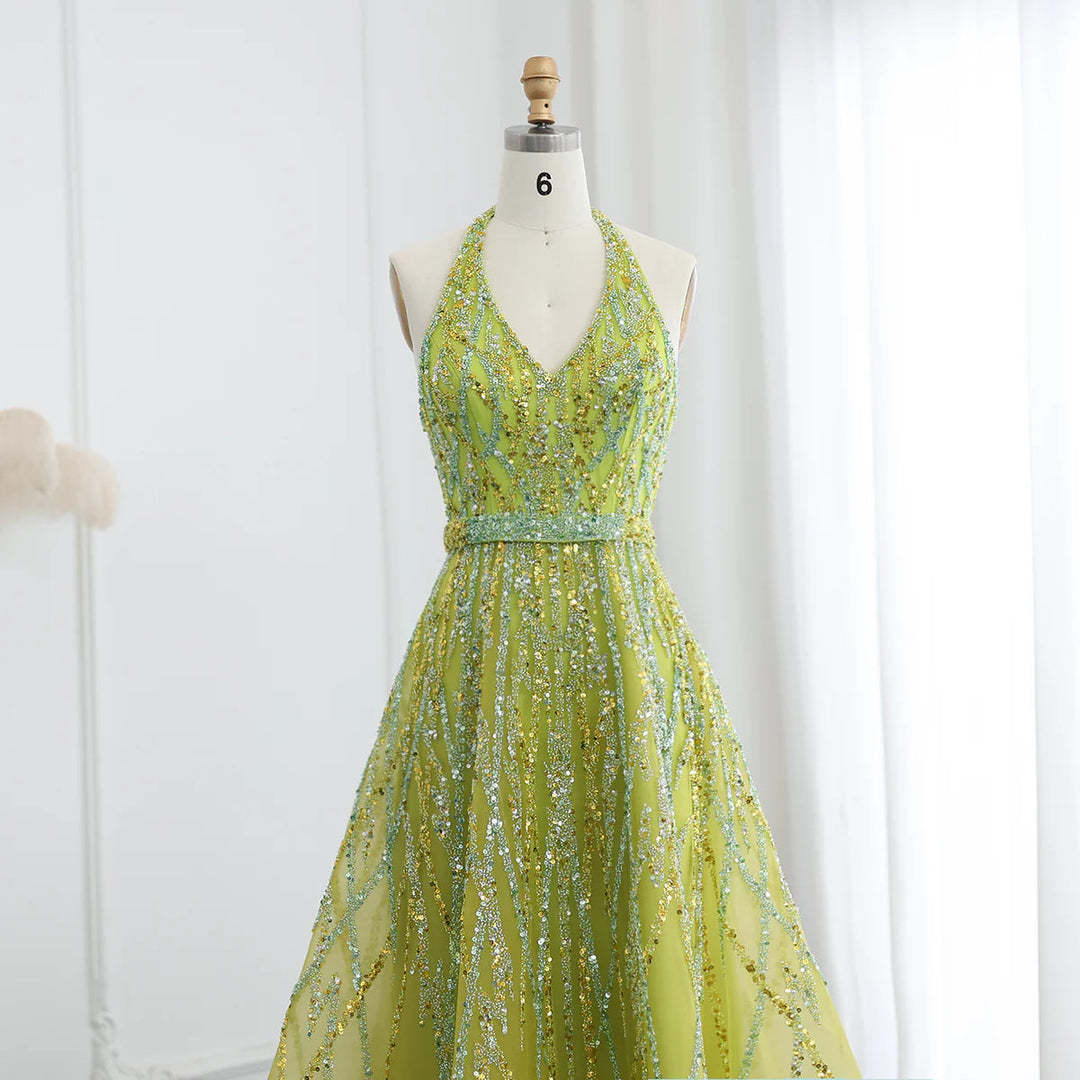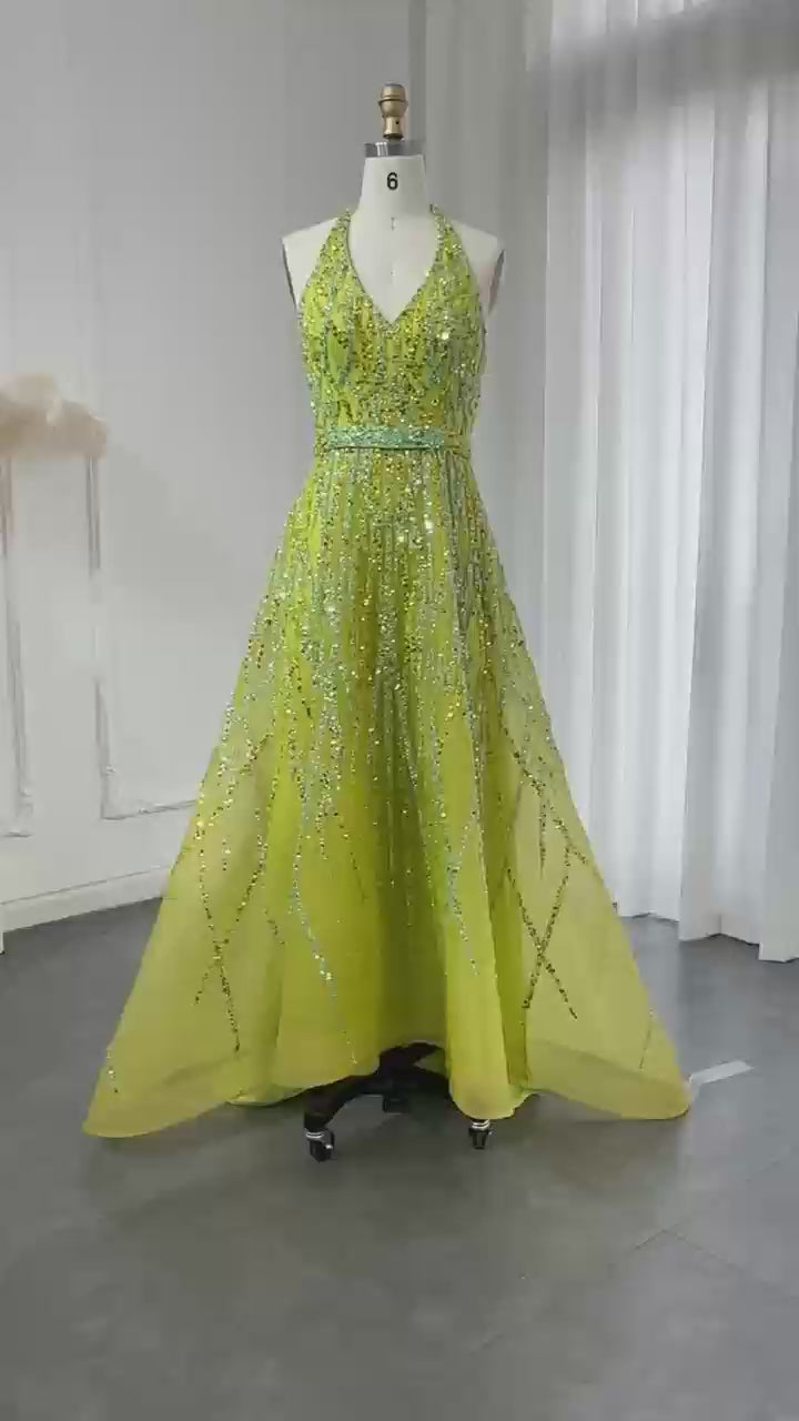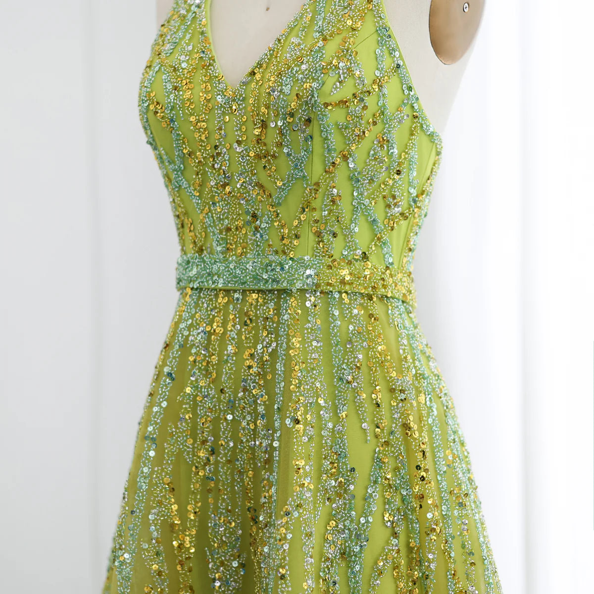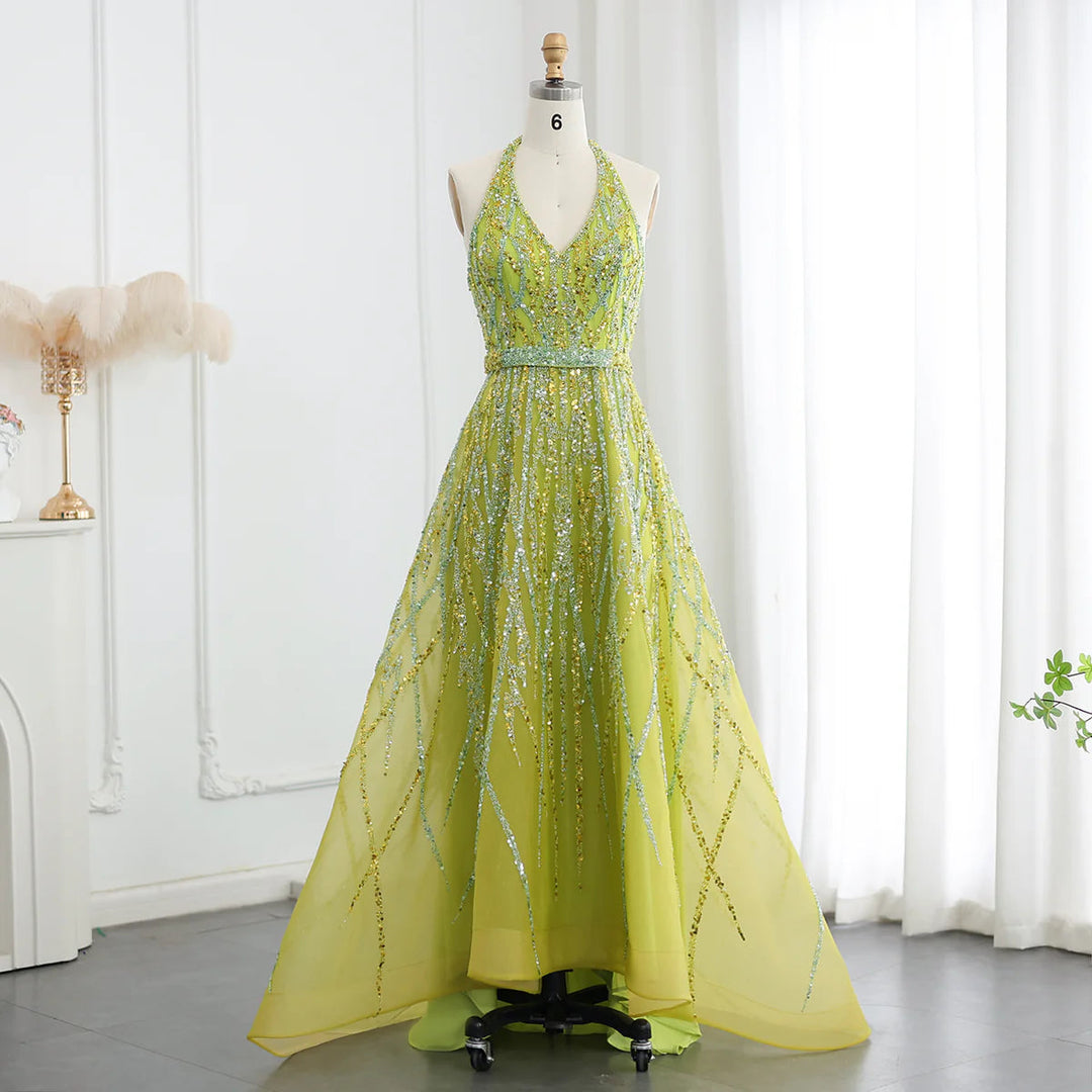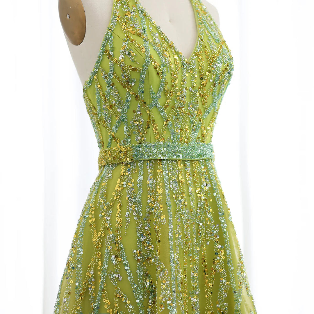 Luxury Beaded Lemon Green Halter High Low Evening Dresses SS472