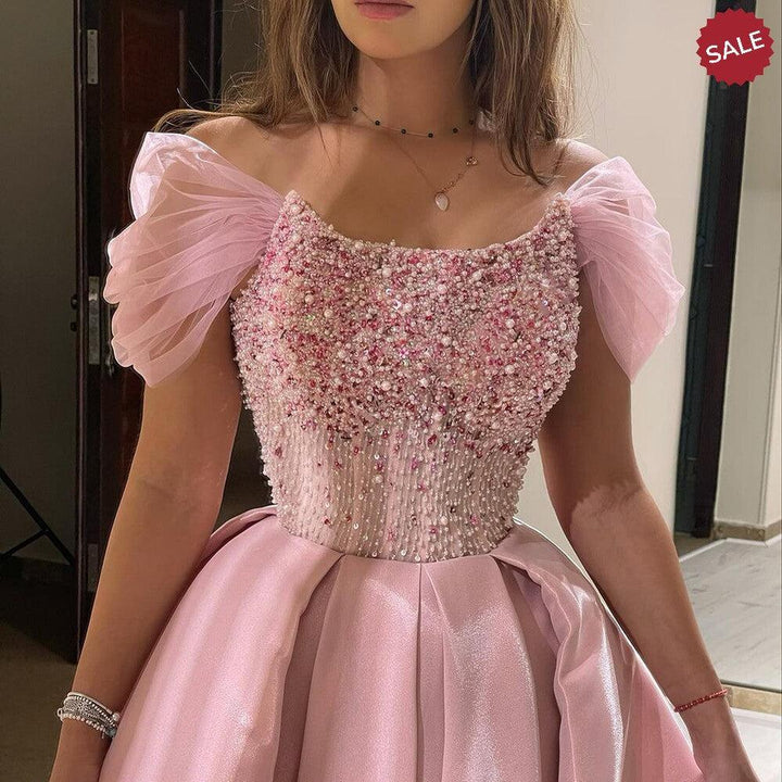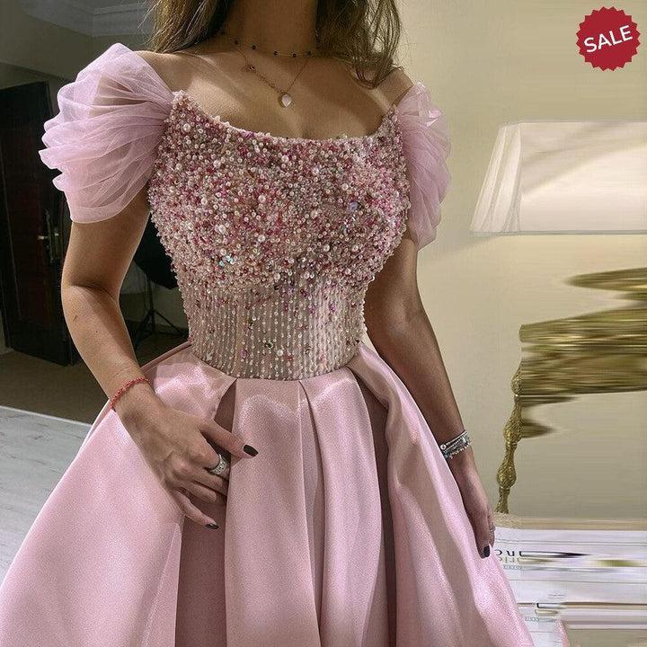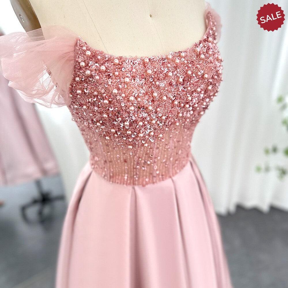This Dreamy Vow Luxury Dubai dress boasts a blush pink color and unique Arabic-inspired design. The cape and ankle length create a dramatic and elegant silhouette, perfect for any special occasion. Its luxurious fabric and intricate details make it a standout choice for weddings or parties.