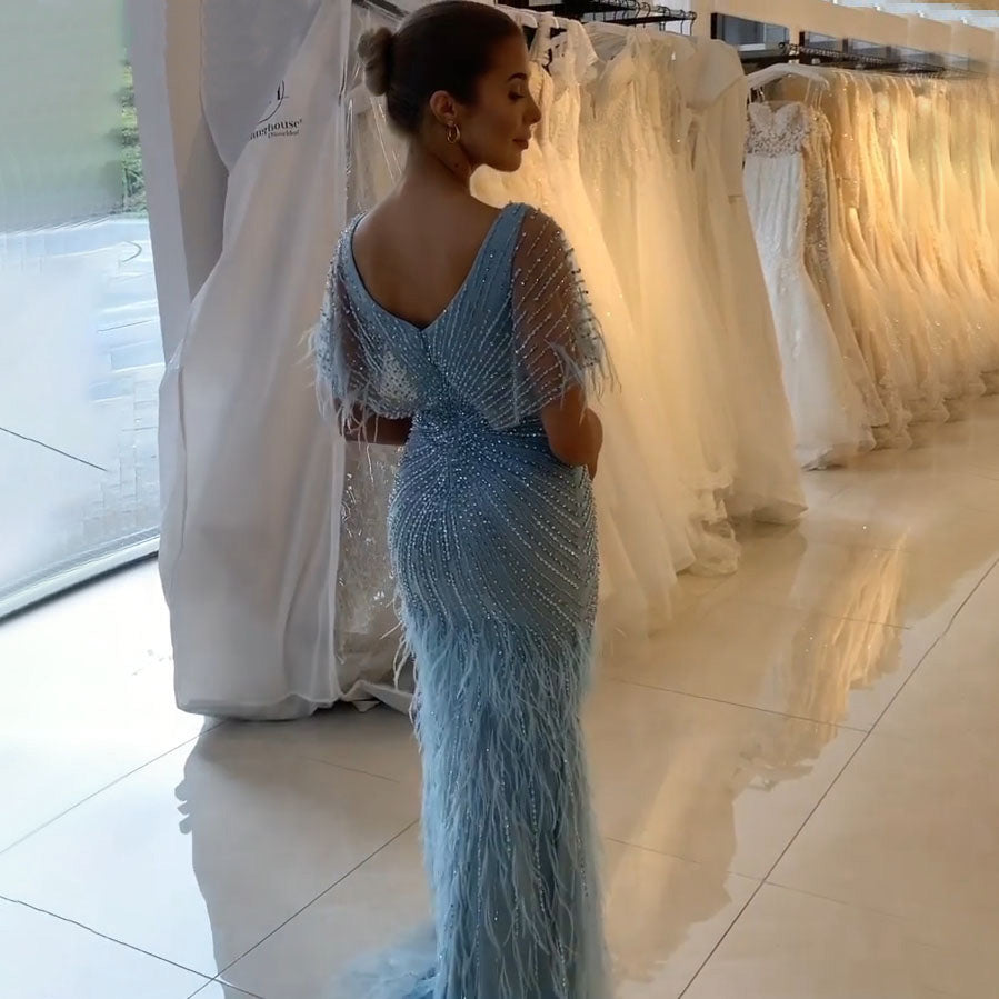 Dreamy Vow Luxury Dubai Feathers Khaki Mermaid Evening Dresses 2023 Elegant for Woman Wedding Party Gowns Cape Sleeves SS210-DreamyVow