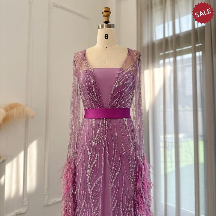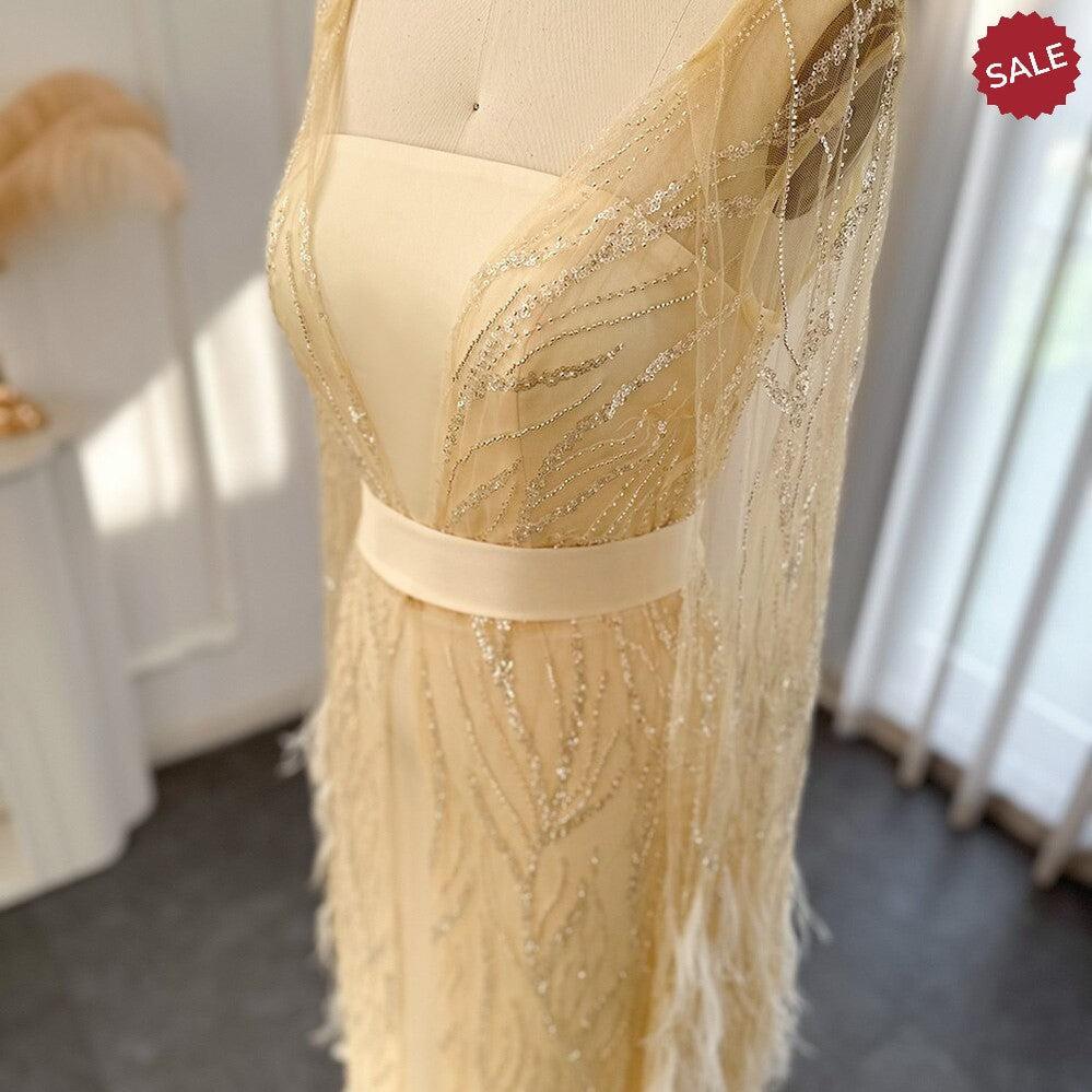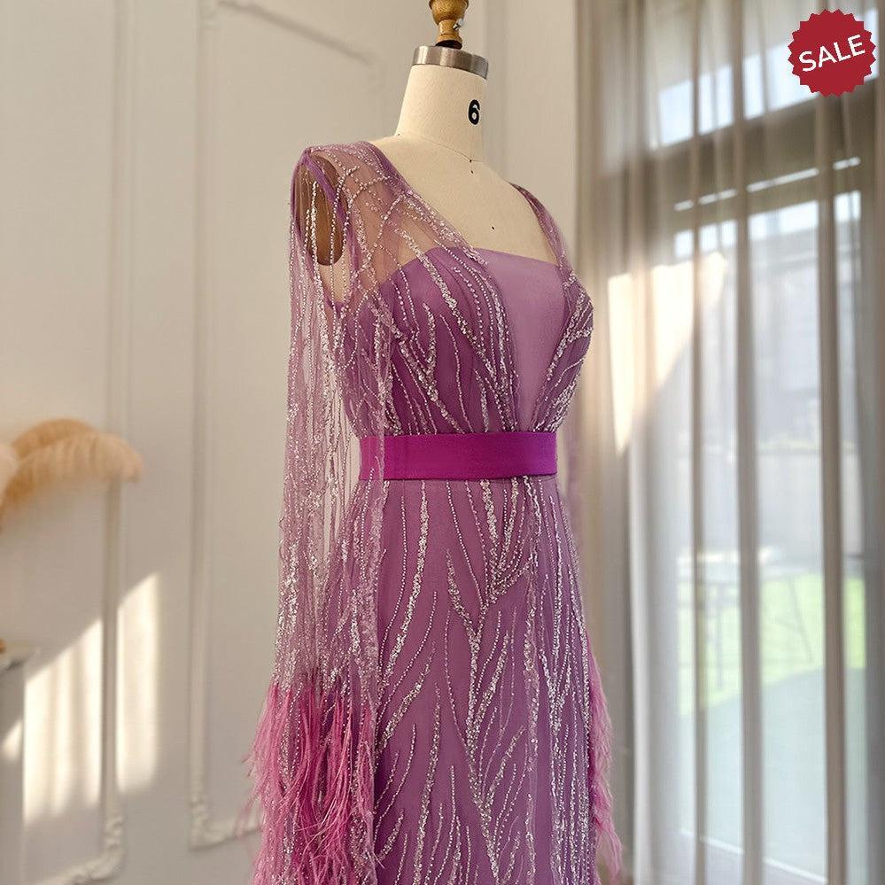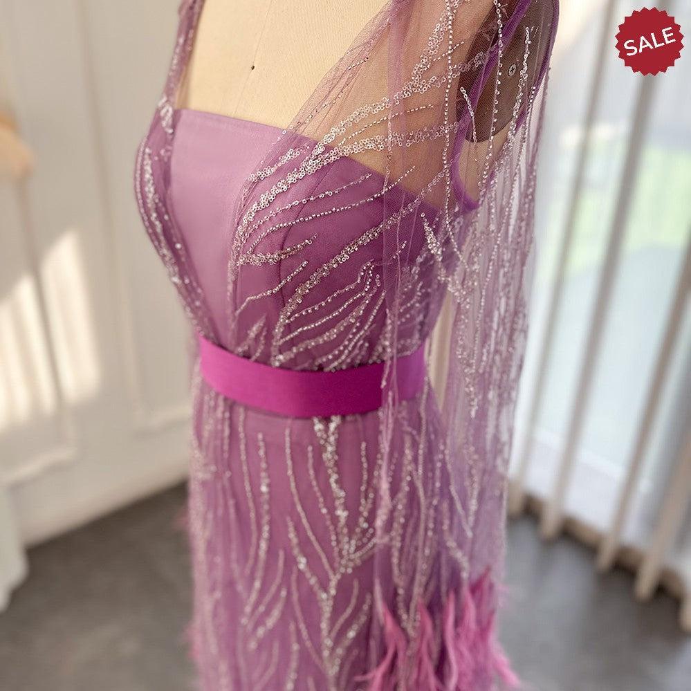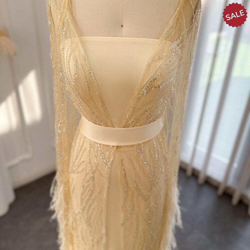 DreamyVow Luxury Dubai Feathers Light Yellow Evening Dresses with Cape Sleeves Arabic Purple Women Wedding Party Gowns 420