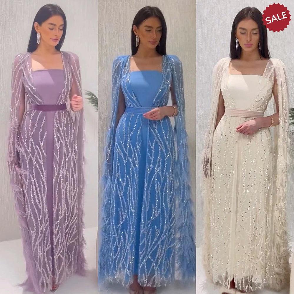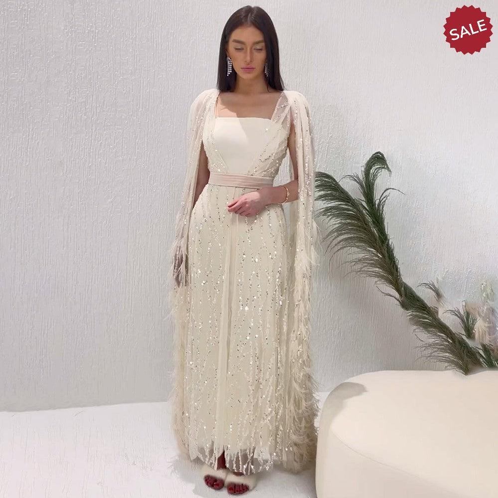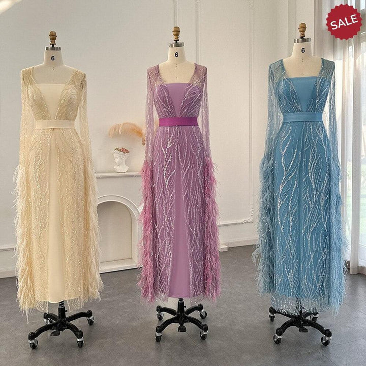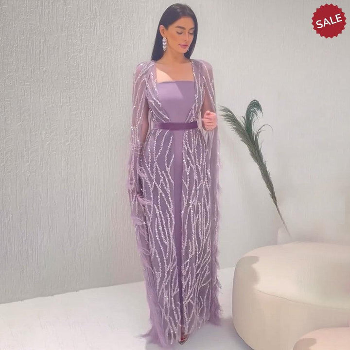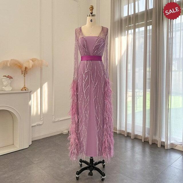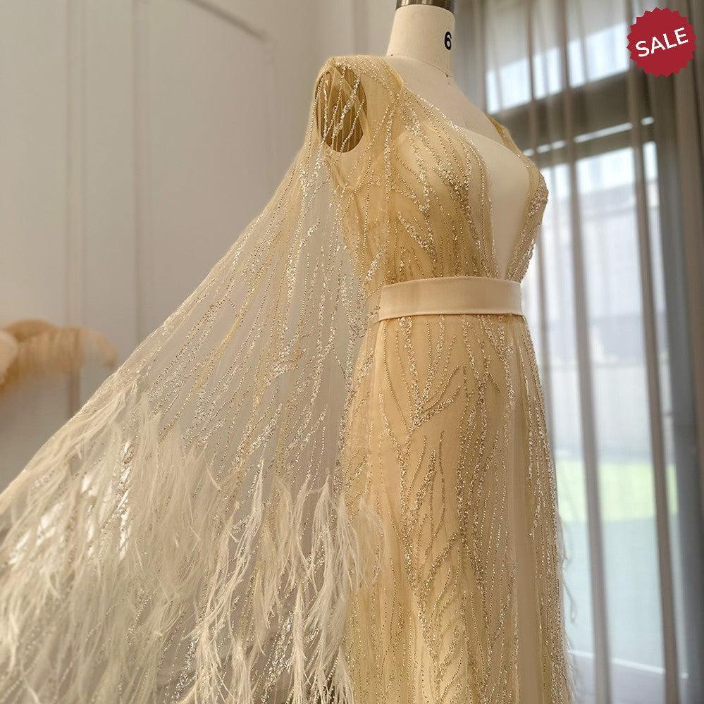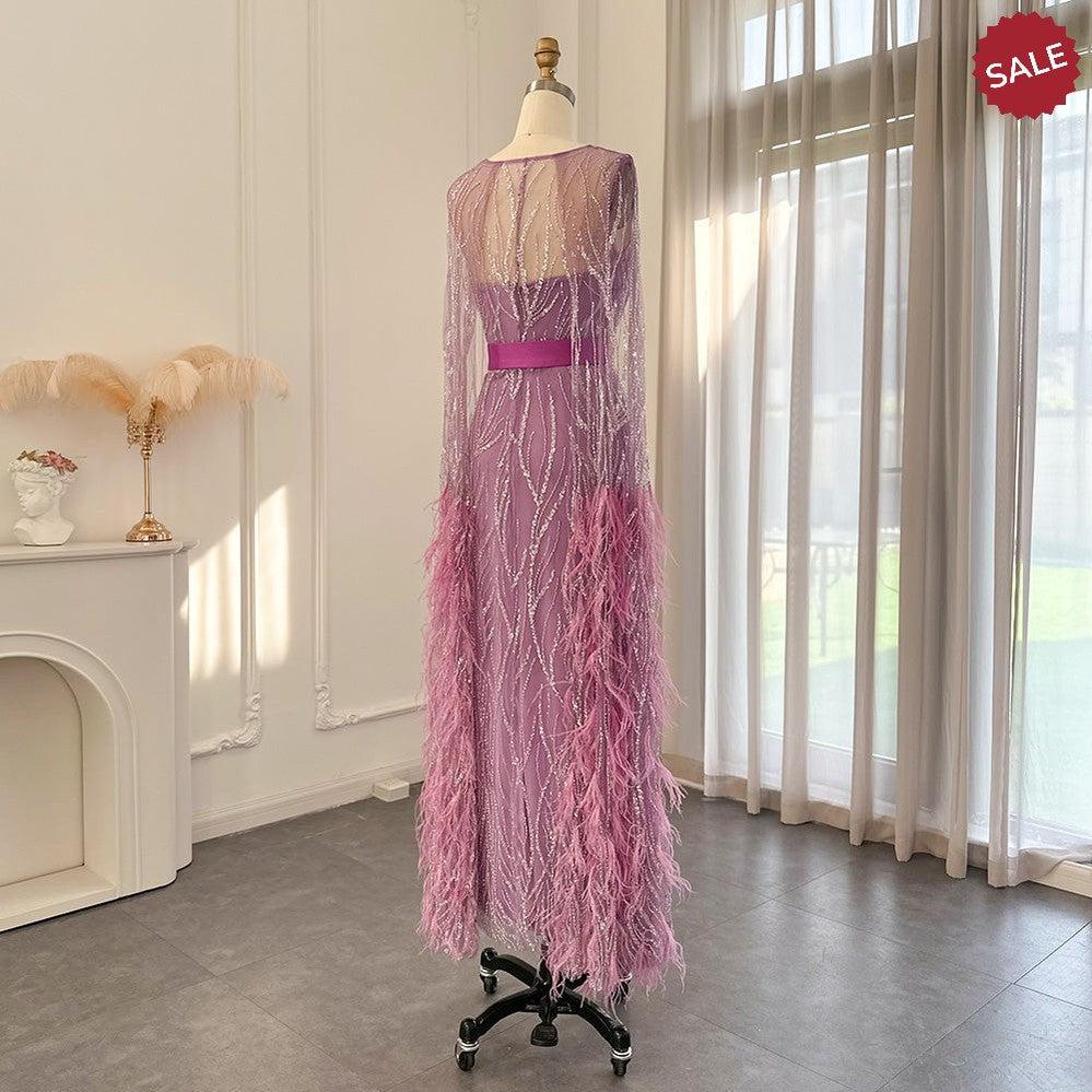 DreamyVow Luxury Dubai Feathers Light Yellow Evening Dresses with Cape Sleeves Arabic Purple Women Wedding Party Gowns 420