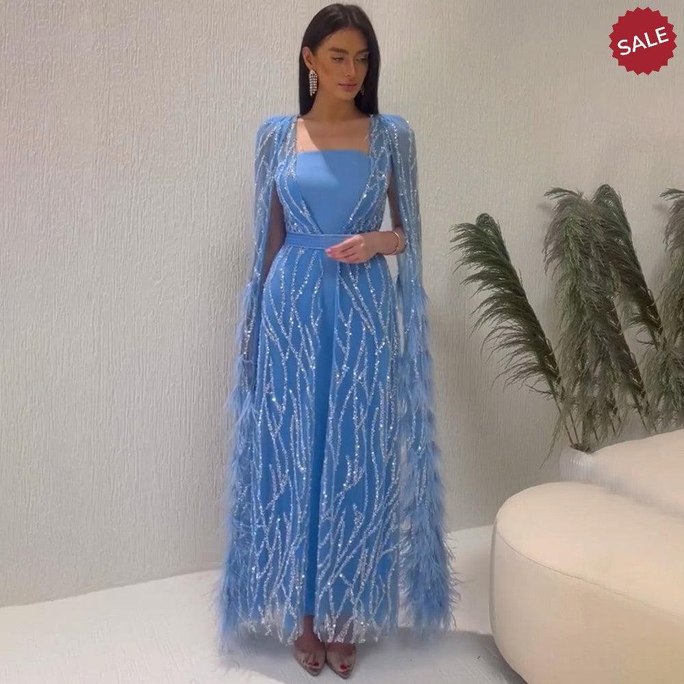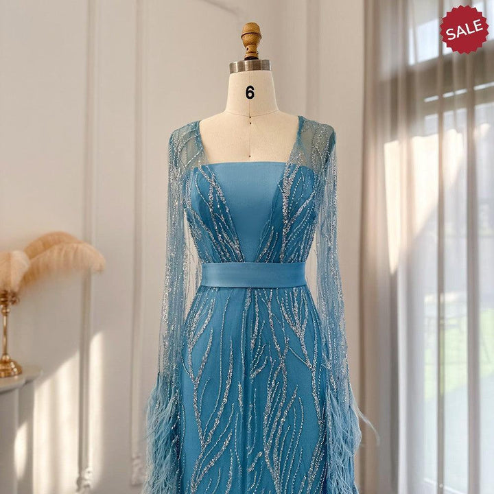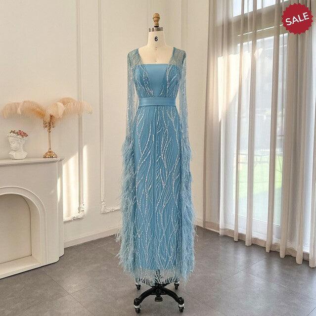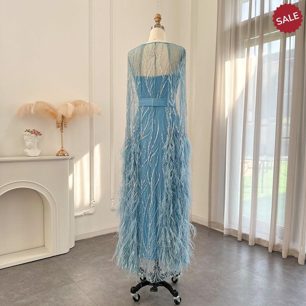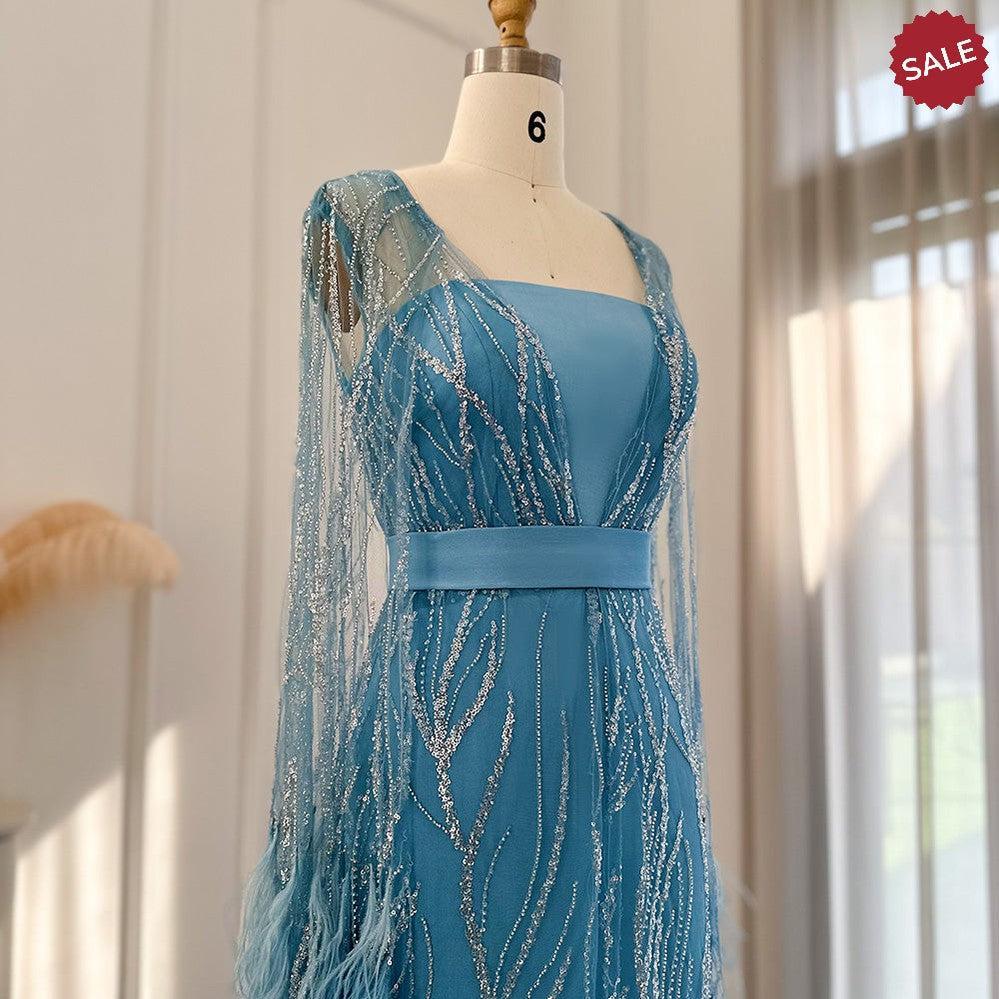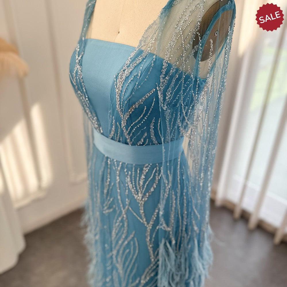 DreamyVow Luxury Dubai Feathers Light Yellow Evening Dresses with Cape Sleeves Arabic Purple Women Wedding Party Gowns 420
