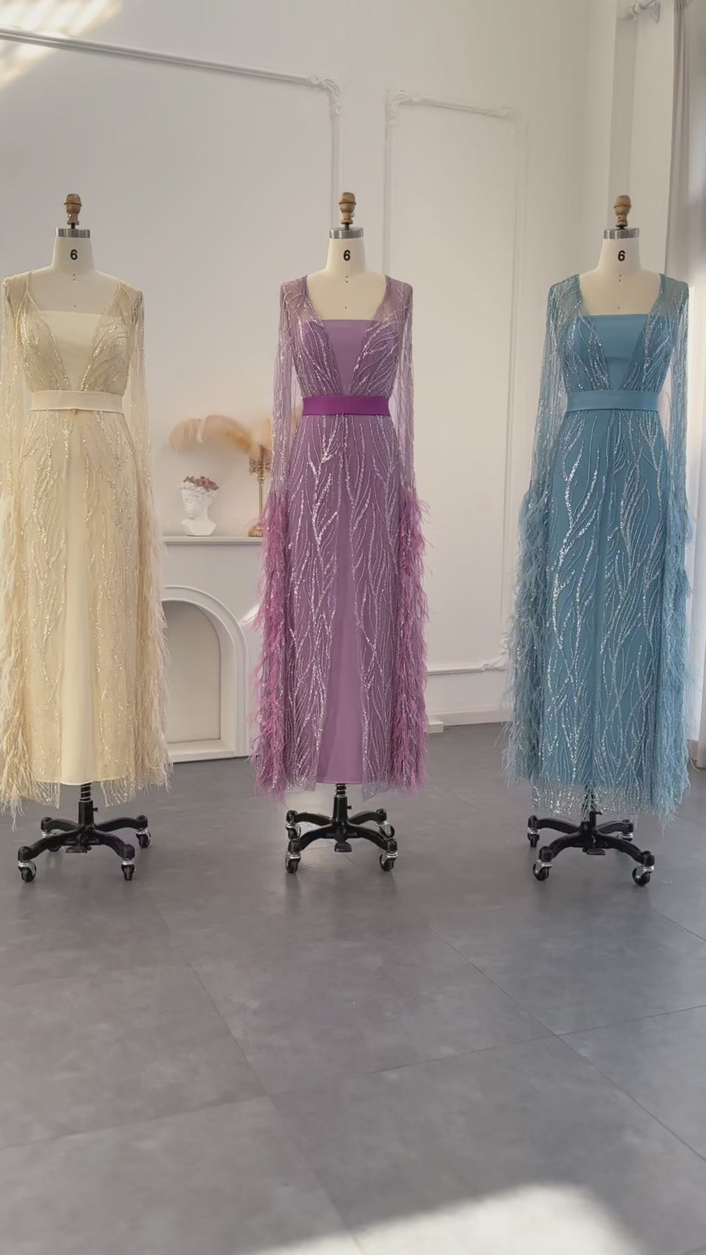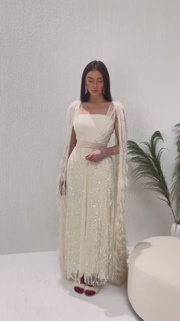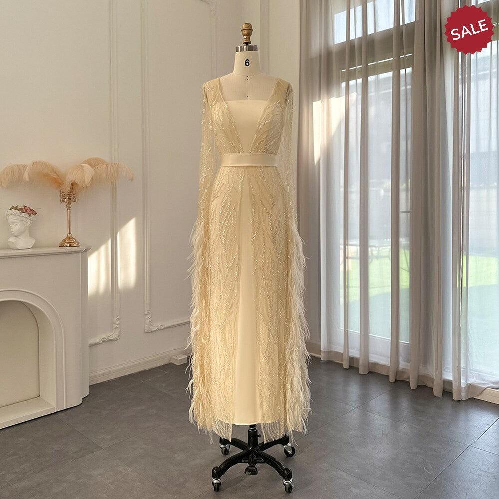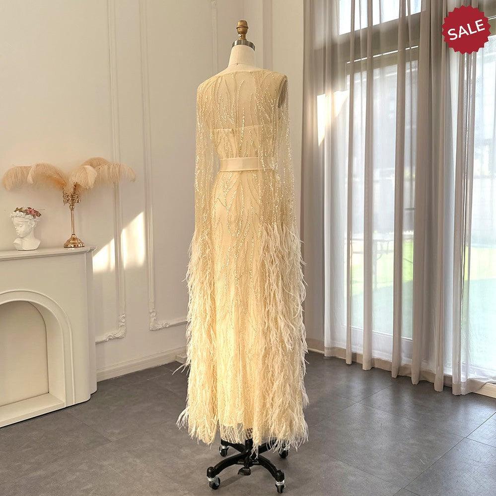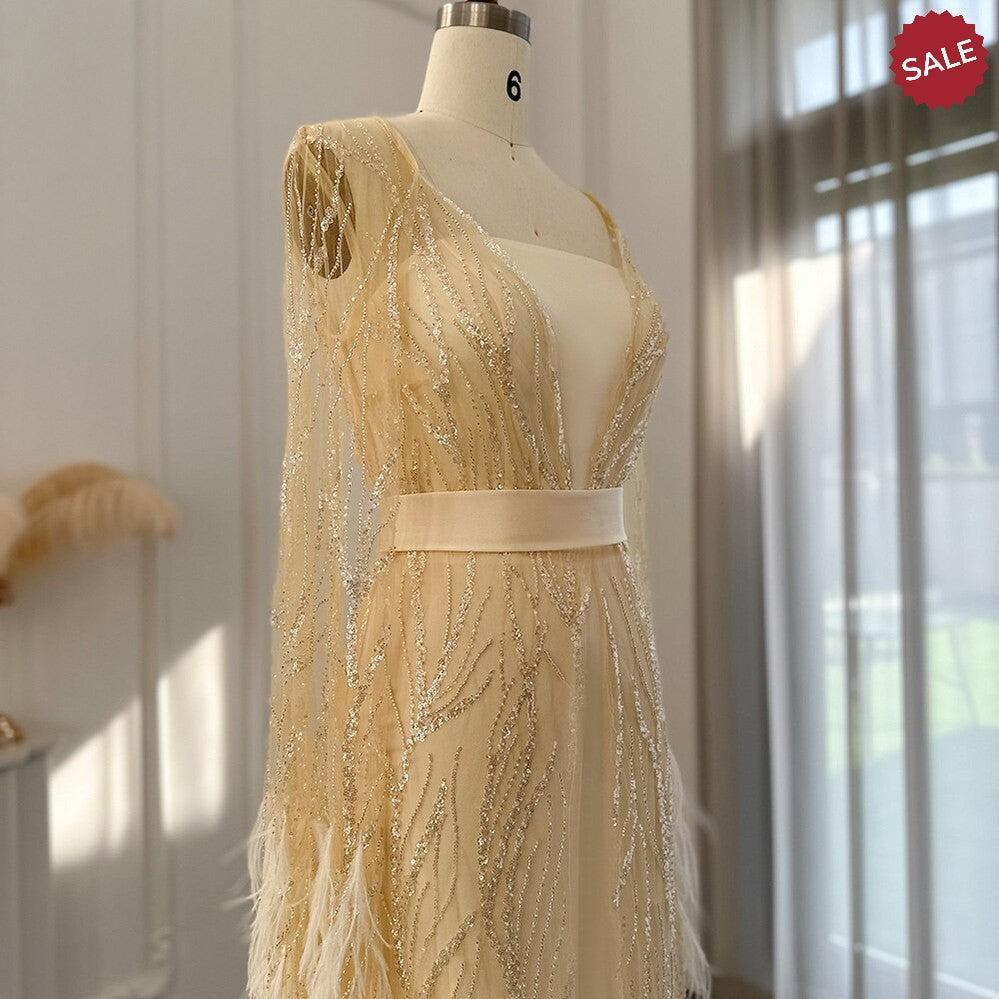Feathers Light Yellow Evening Dresses with Cape Sleeves SS420