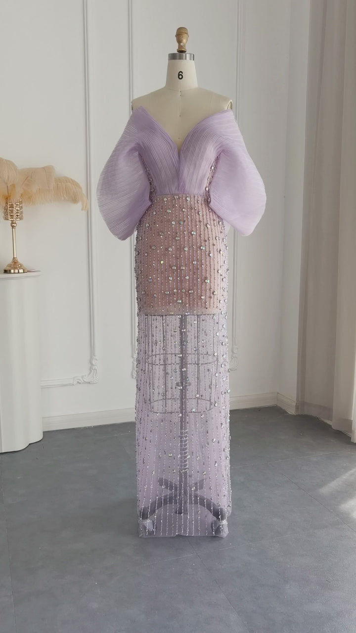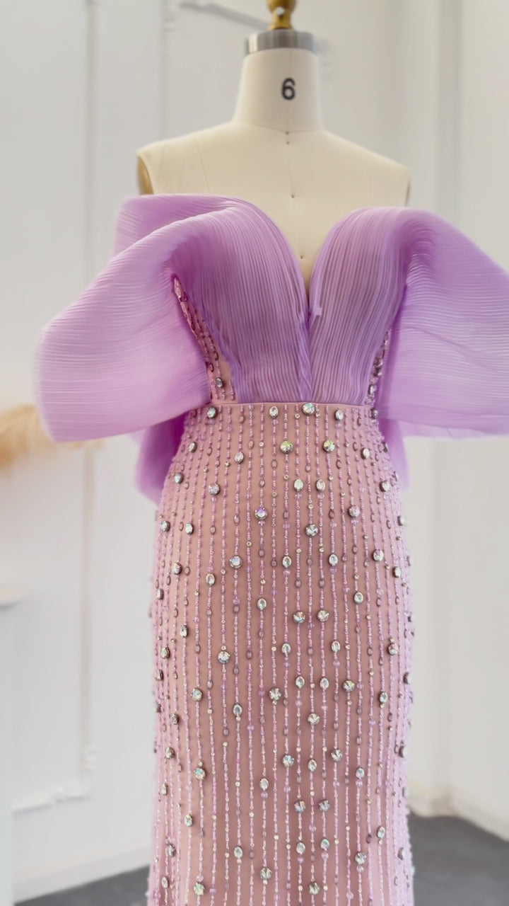 Dazzle in our Dreamy Vow Luxury Dubai Lilac Evening Dress. Featuring an elegant off-shoulder design and Arabic-inspired style, this long gown is perfect for weddings, parties, and proms. Made with high-quality materials, it offers both luxury and comfort. Make a statement in this stunning and timeless piece.