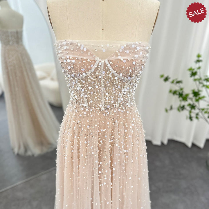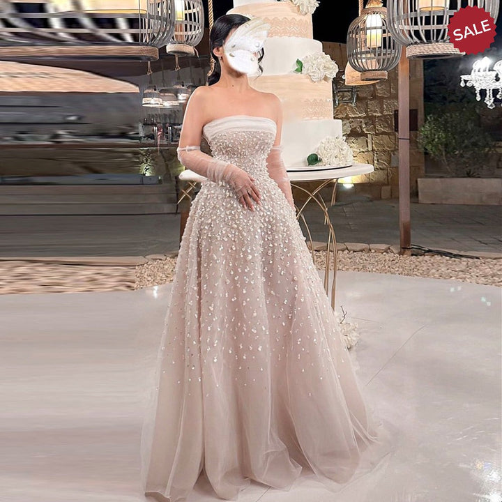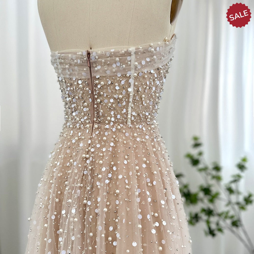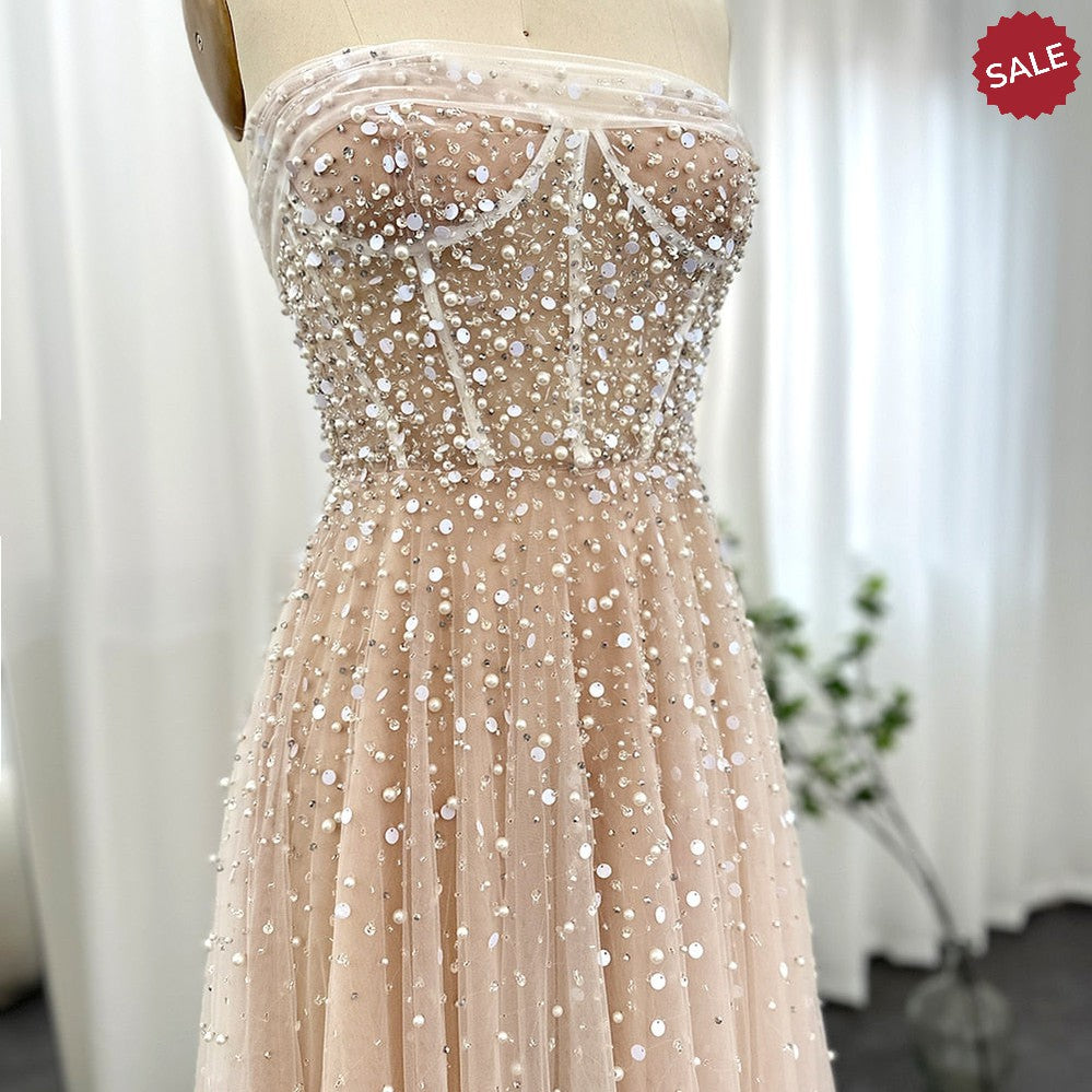 Pearls White Nude Arabic Evening Dresses with Gloves SS373