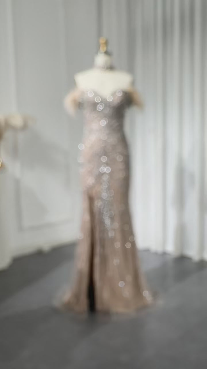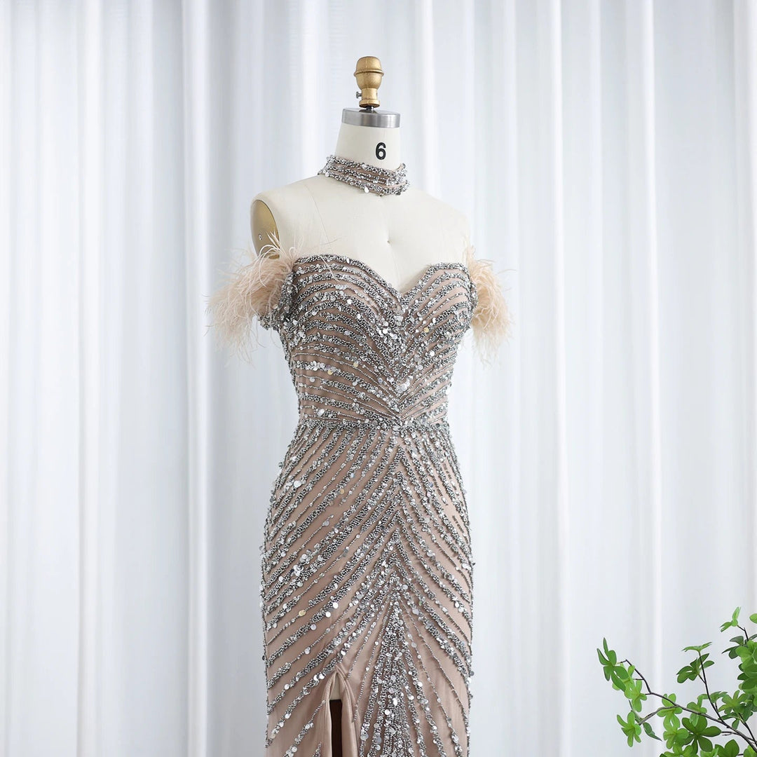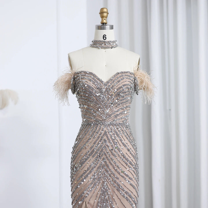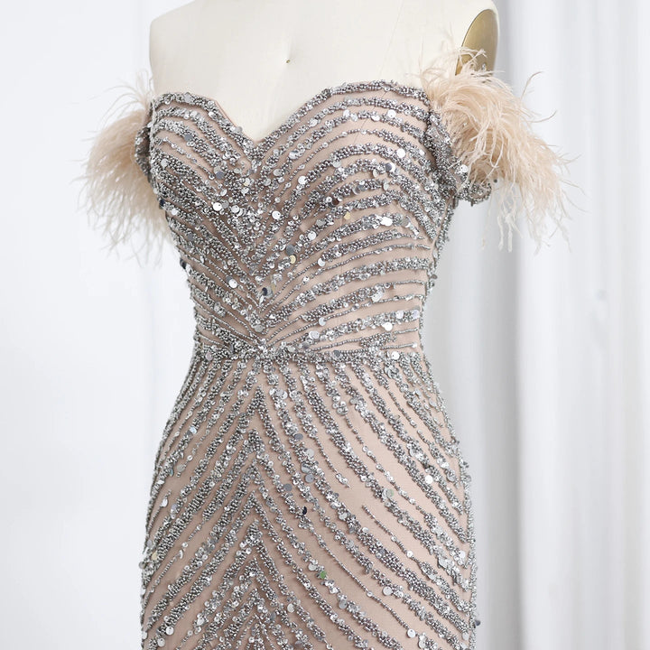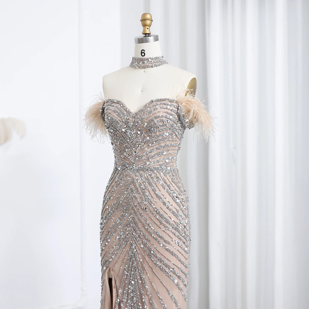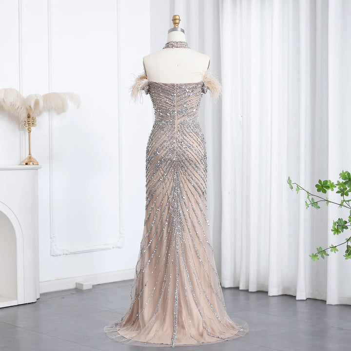This stunning luxury evening dress features a beaded mermaid silhouette and an off-the-shoulder design with a choker detail. The intricately designed feathers add a touch of elegance and sophistication, perfect for any formal event. Its figure-flattering shape will make you feel confident and glamorous all night long.