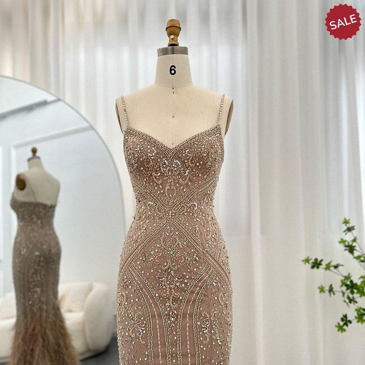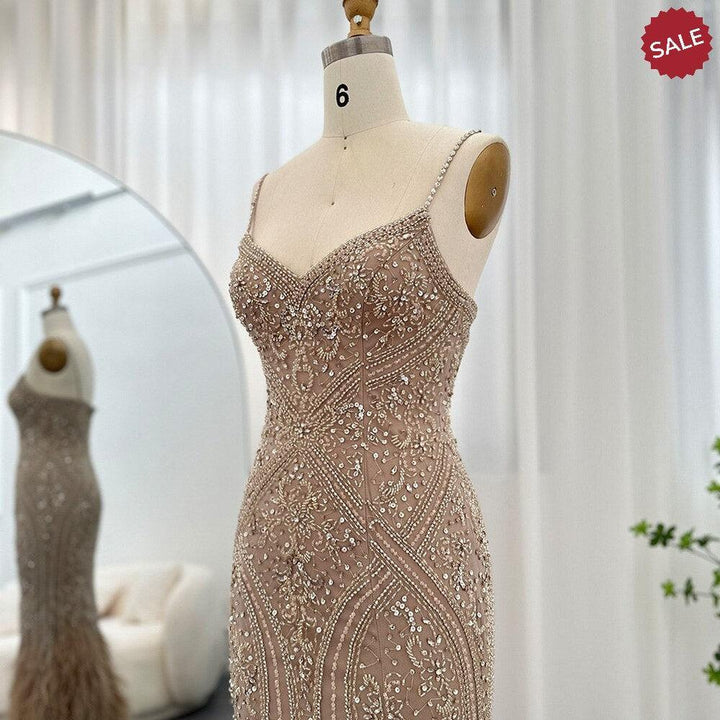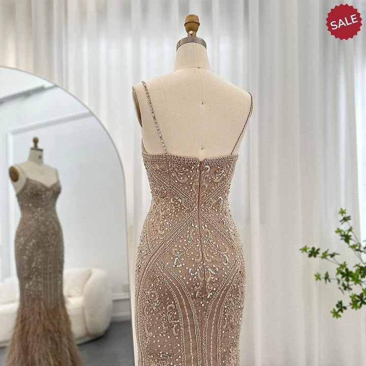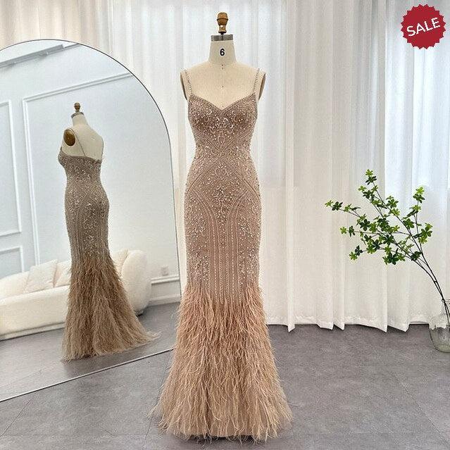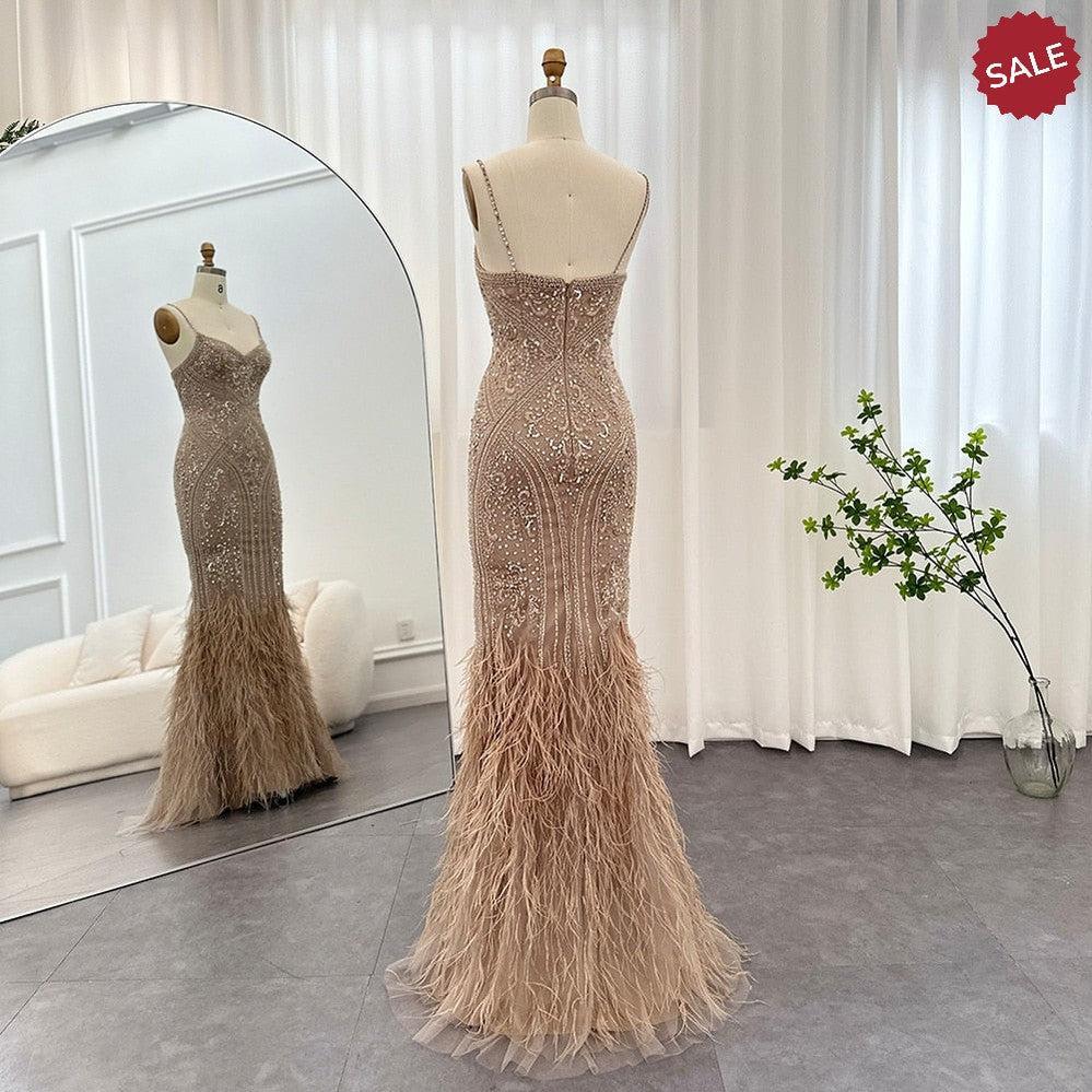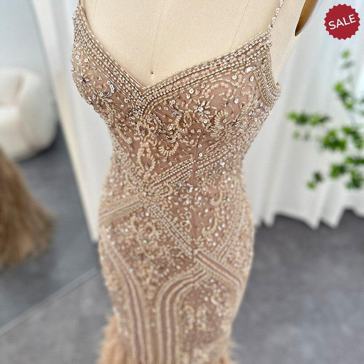Dreamy Vow Luxury Feathers Champagne Evening Dresses for Women Wedding Spaghetti Straps Mermaid Long Party Prom Dresses 171