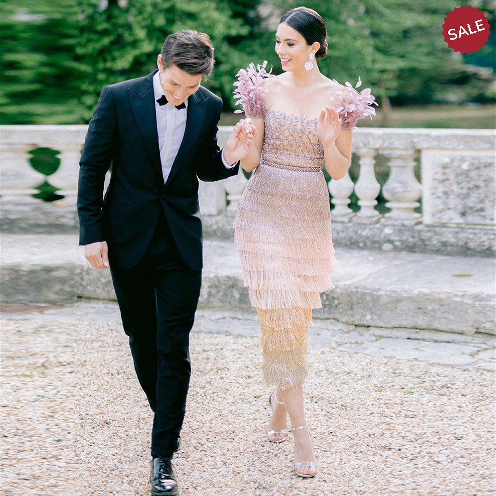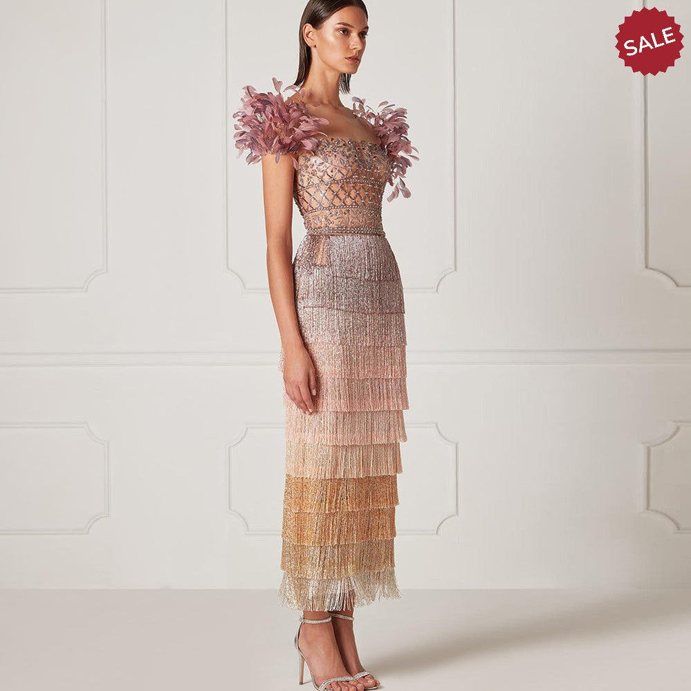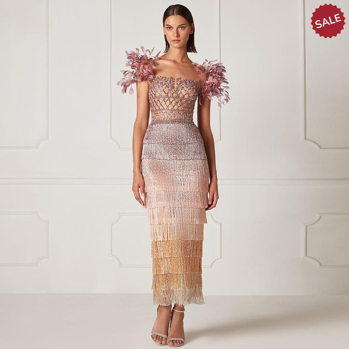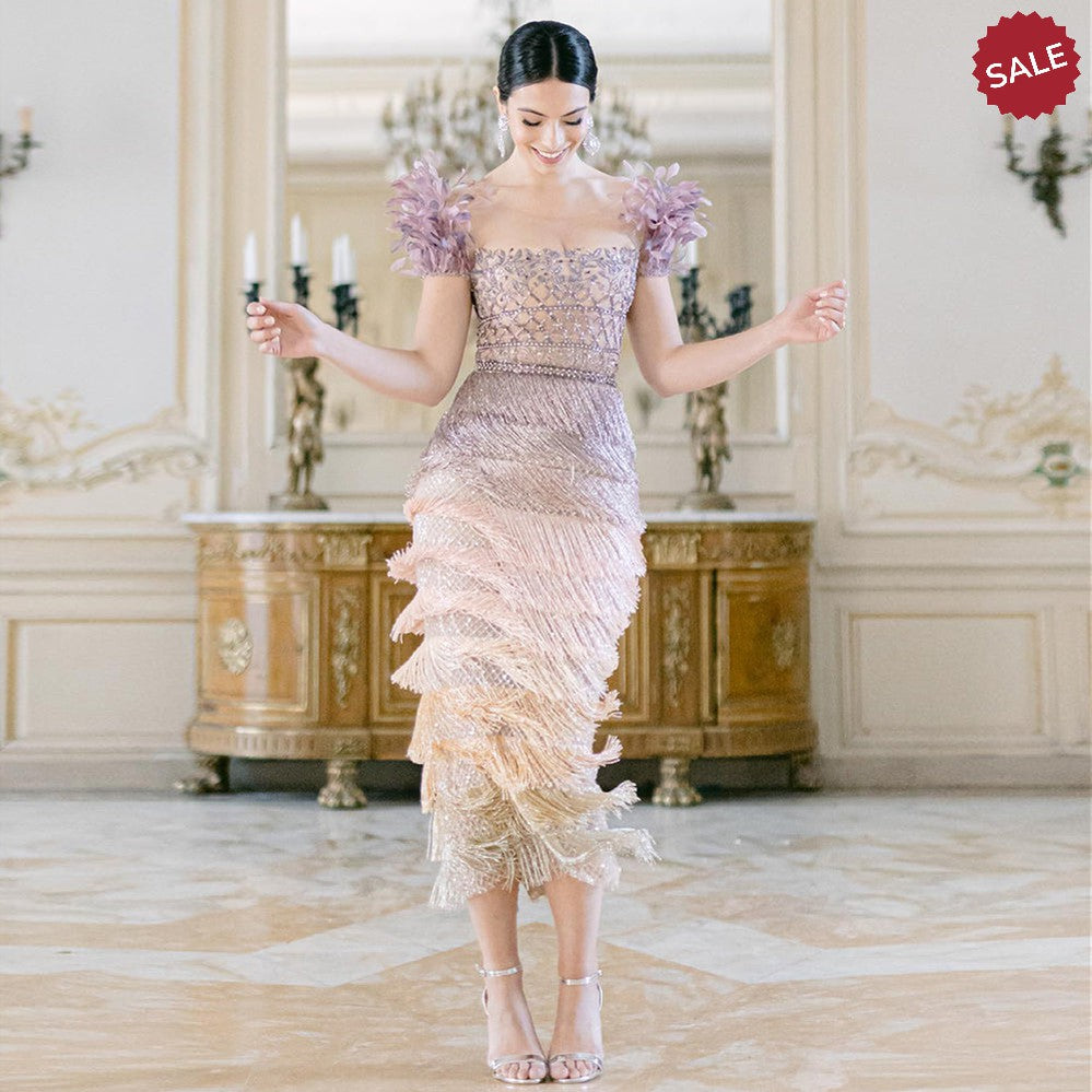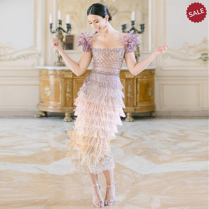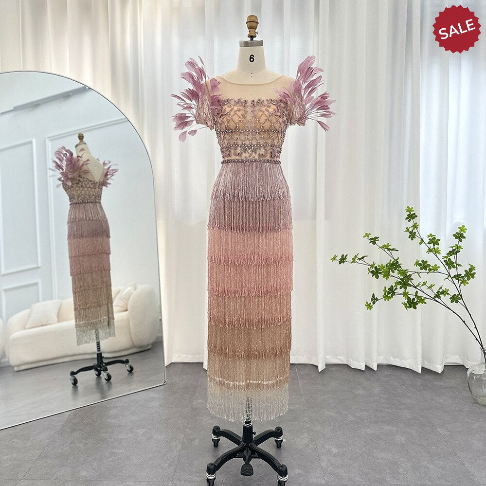 Introducing the Dreamy Vow Luxury Feathers Tassel Lilac Dubai Evening Dress! Featuring luxurious feathers and tassels, this dress is perfect for weddings, parties, and formal events. Make a statement with the ankle length midi design and be the center of attention. Elevate your style with Dreamy Vow.