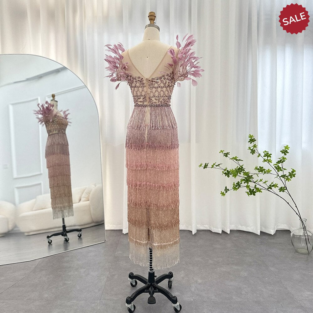 Dreamy Vow Luxury Feathers Tassel Lilac Dubai Evening Dresses for Women Wedding Party Arab Ankle Length Midi Formal Gowns 379