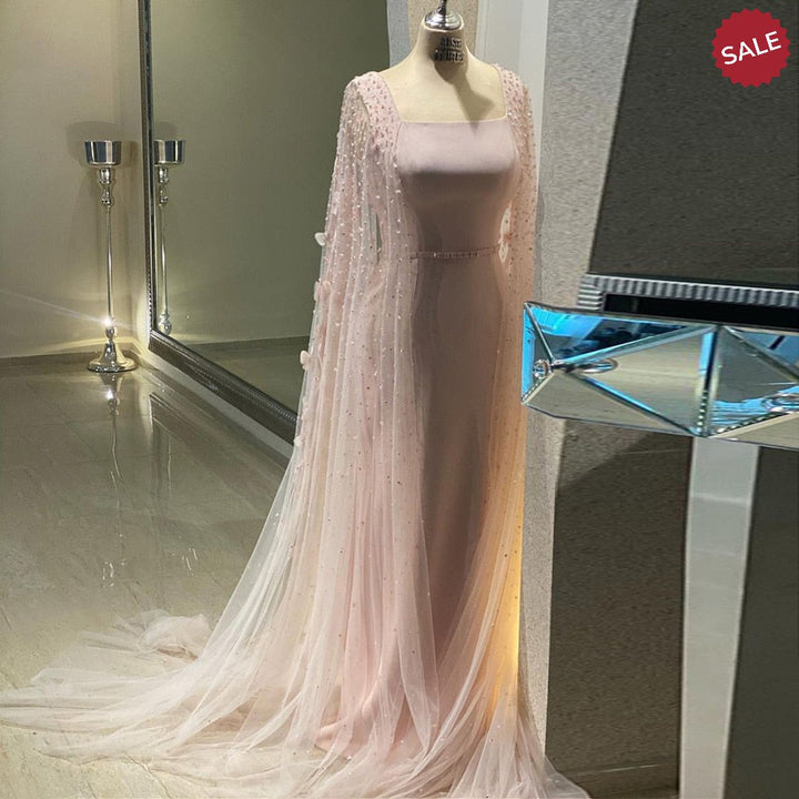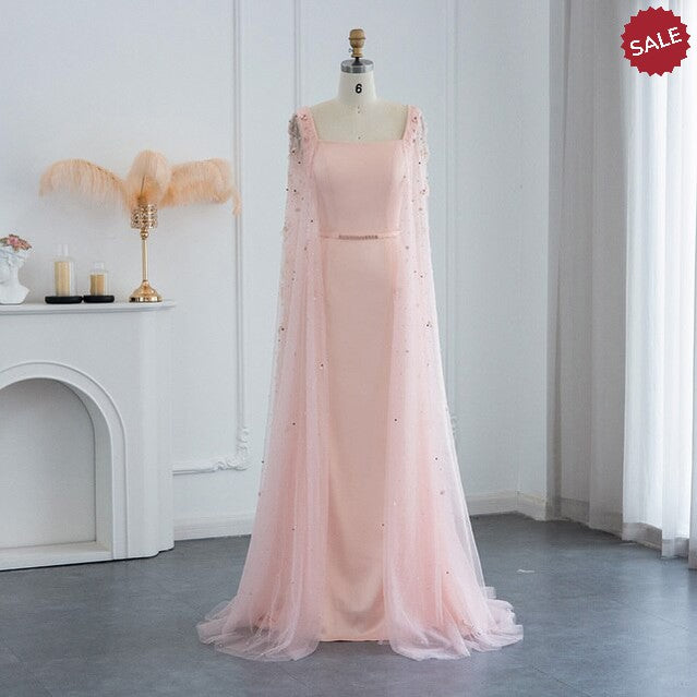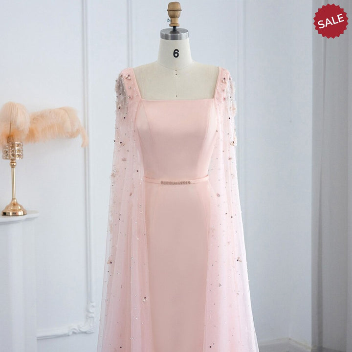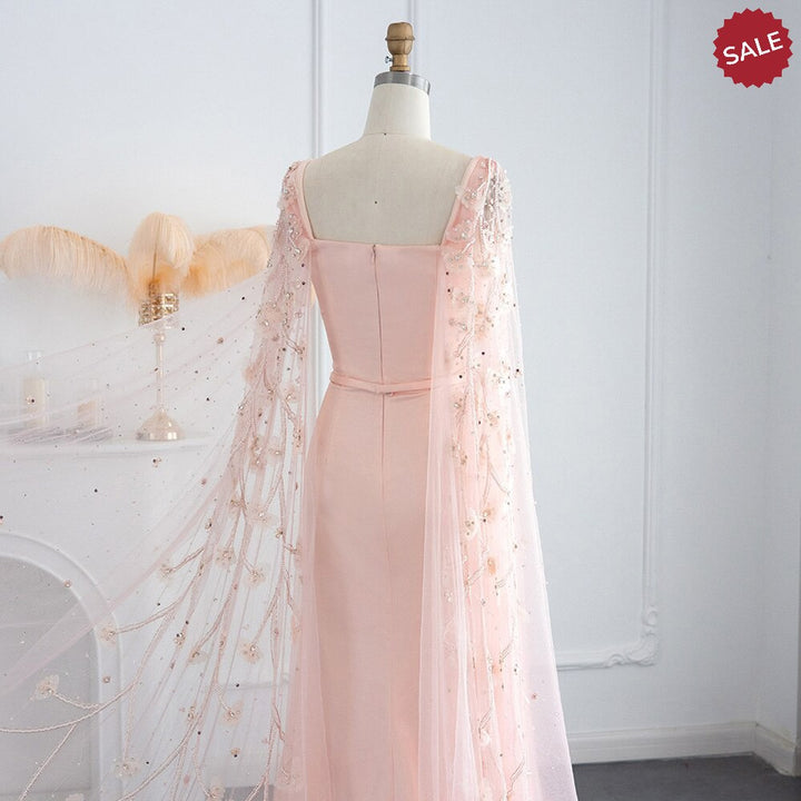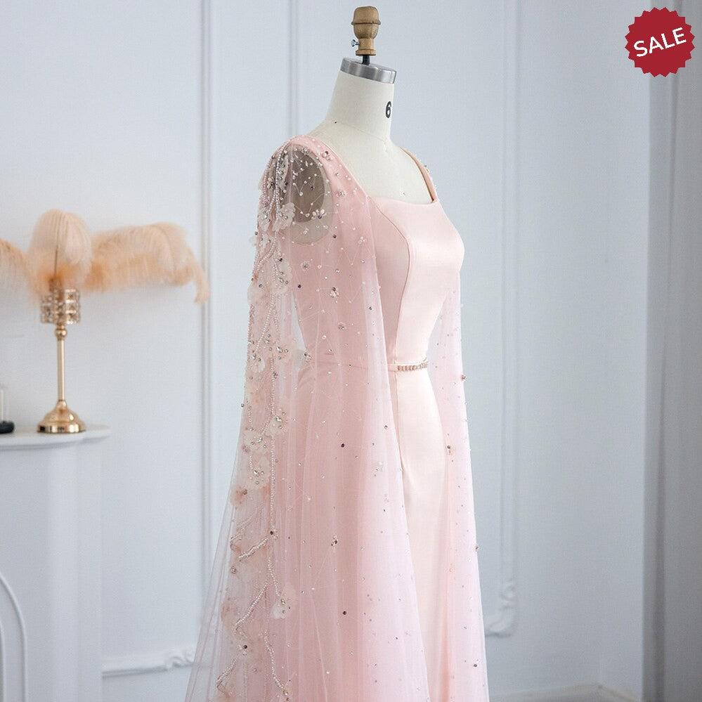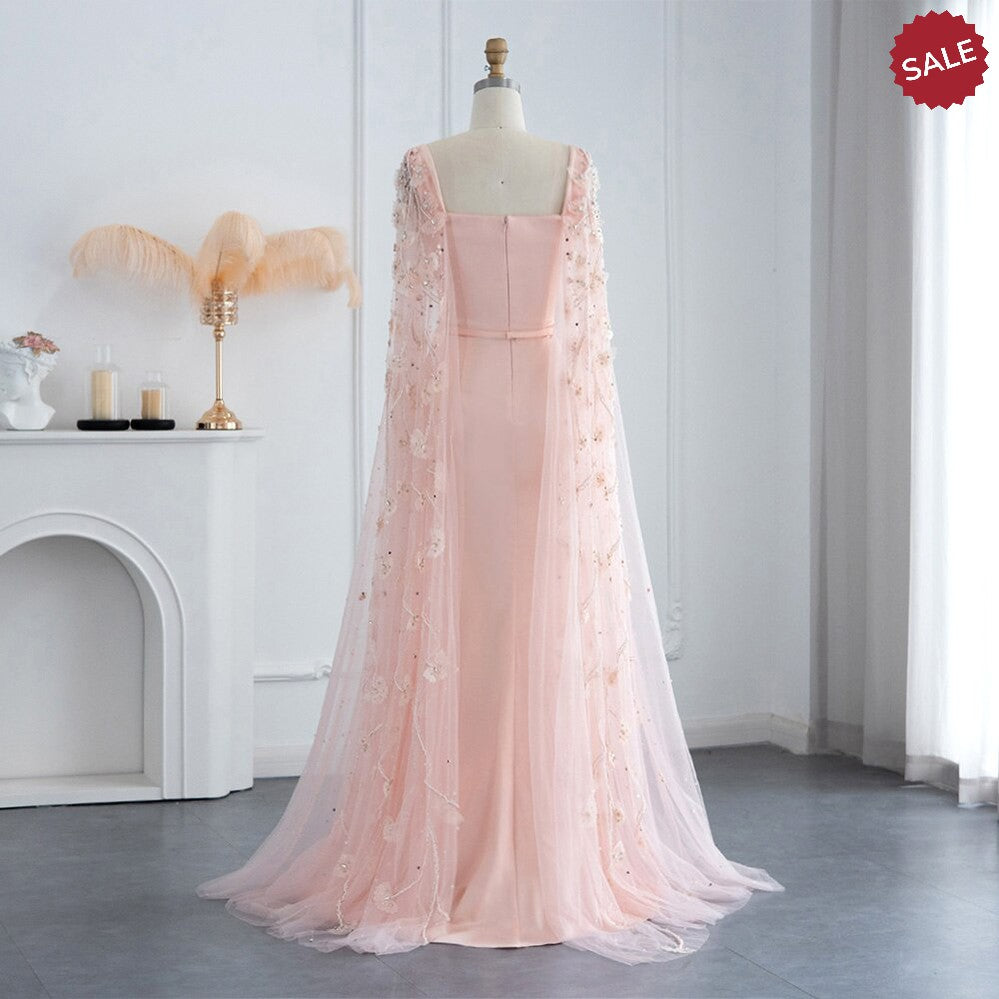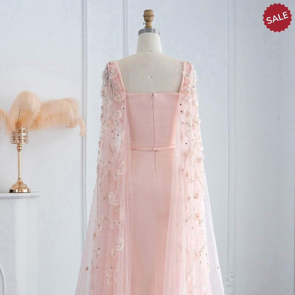 Pink 3D Flowers Mermaid Dubai Evening Dress with Cape Sleeve SS493