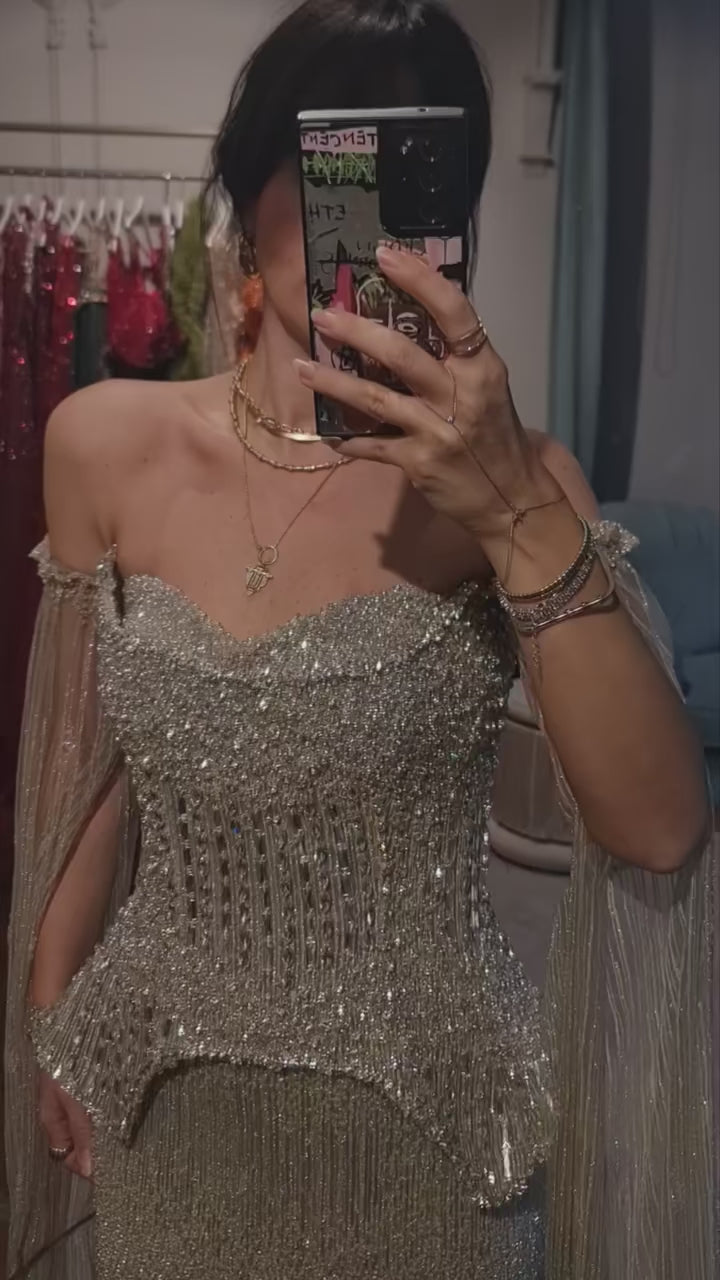 This elegant Silver Grey Crystal Evening Dress will make you the center of attention at any formal event. The off-shoulder cape adds a touch of sophistication while the sparkling crystals bring a glamorous touch to this gown. Ideal for an evening of elegance and luxury.